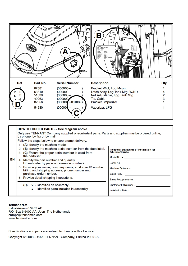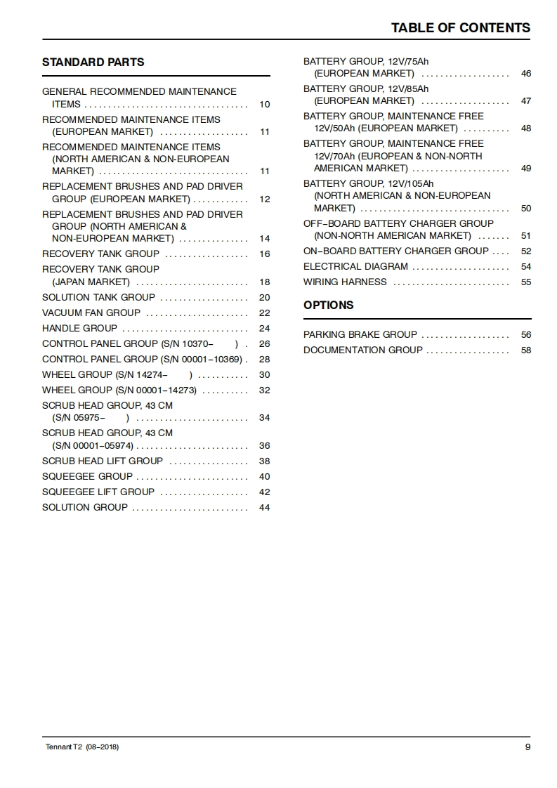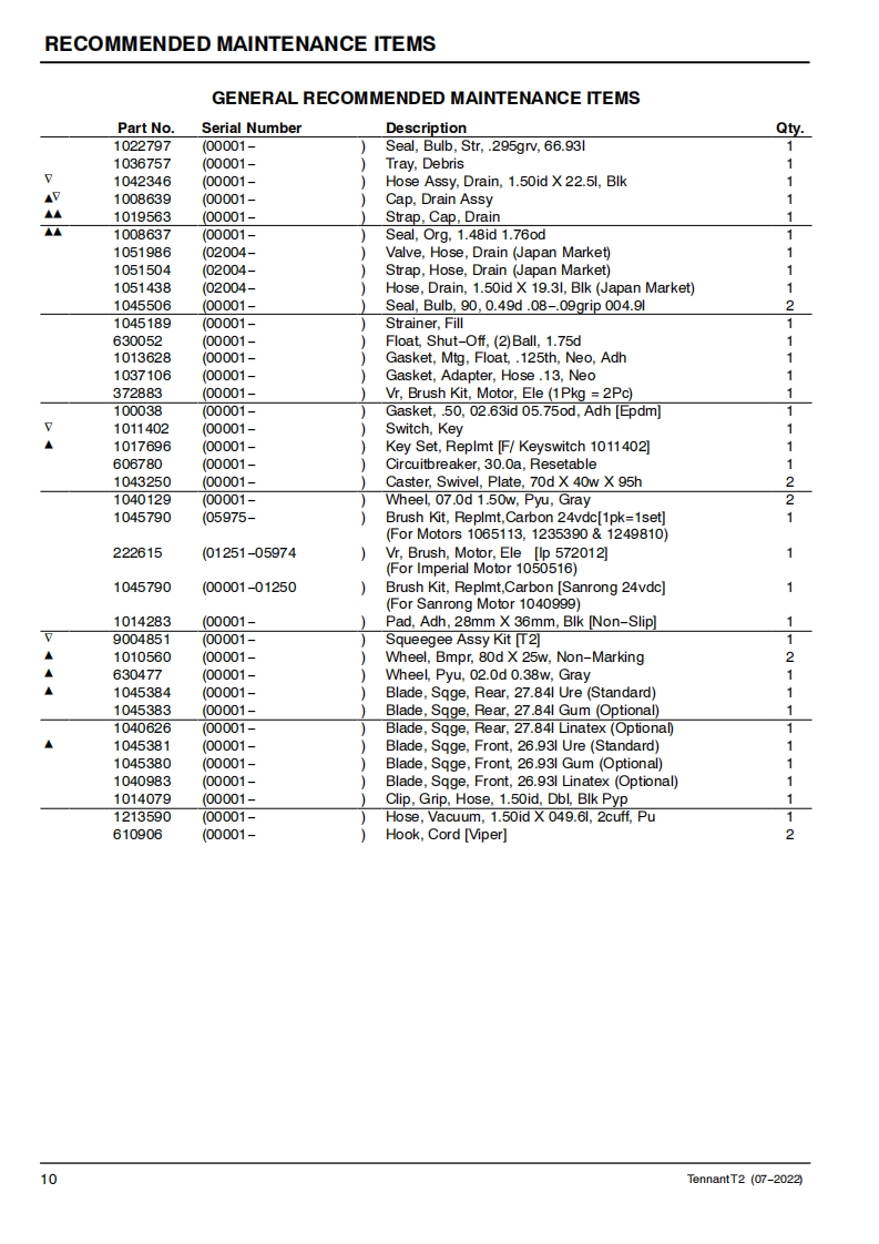 TENNANTT2WALK-BEHIND FLOOR SCRUBBERMachine Serial Number Range(S/N00001-)Parts Manual德@0TennantTrue PartsEuropeFor the latest Parts manuals and other9004801紫language Operator manuals,visit:Rev.08(07-2022)www.tennantco.com/manuals