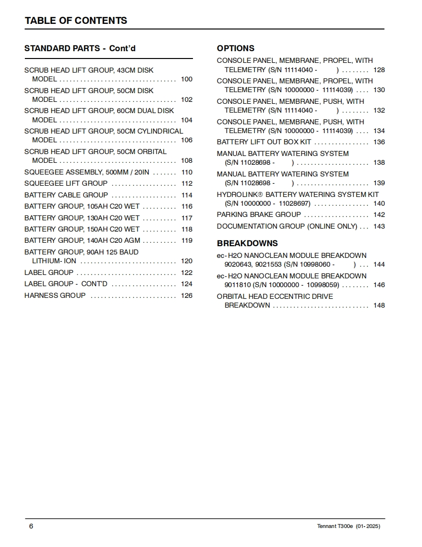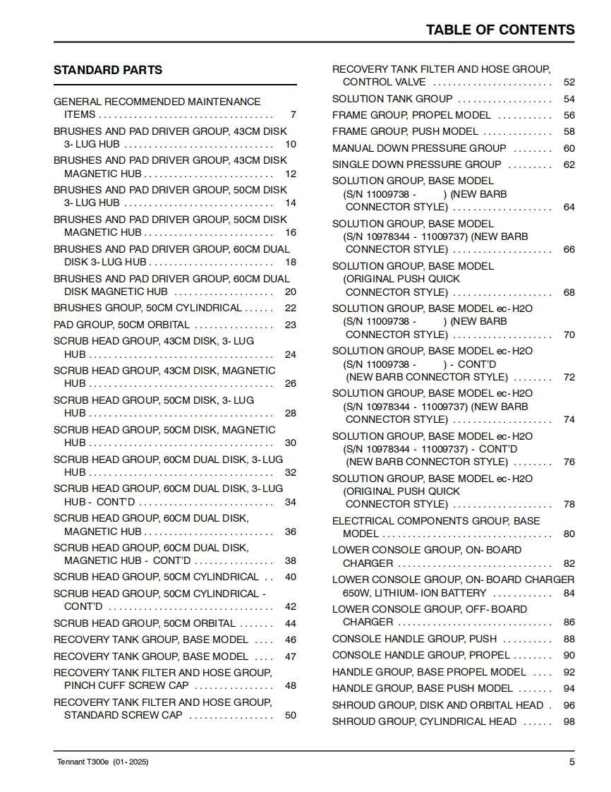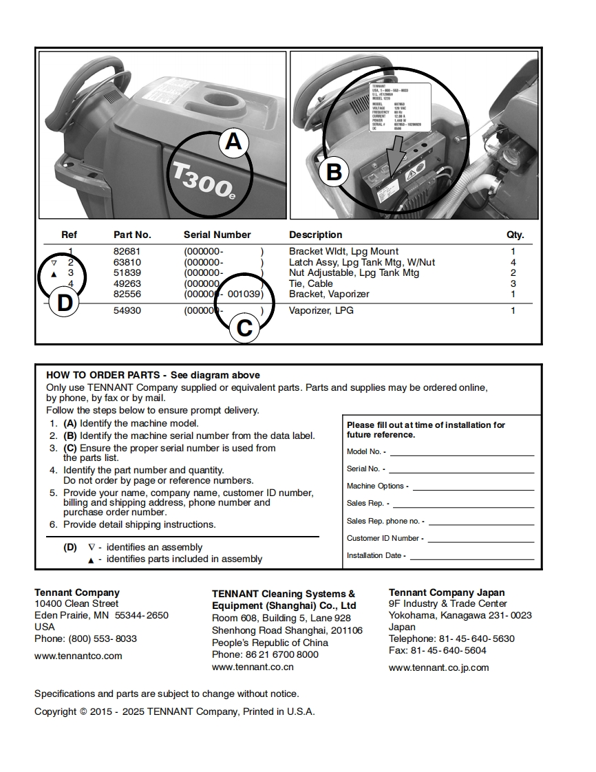 TENNANTT300eWalk-behind Floor ScrubberParts Manual(S/N10000000-20000000)Hygenic Fully Cleanable Recovery TankTennantTrue®PartsLITHIUM-IONNanoCleanNorth America International9014505▣你▣For the latest Parts manuals and otherRev.13(01-2025)language Operator manuals,visit:www.tennantco.com/manual