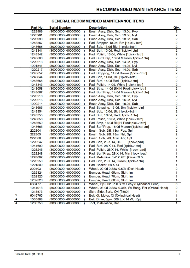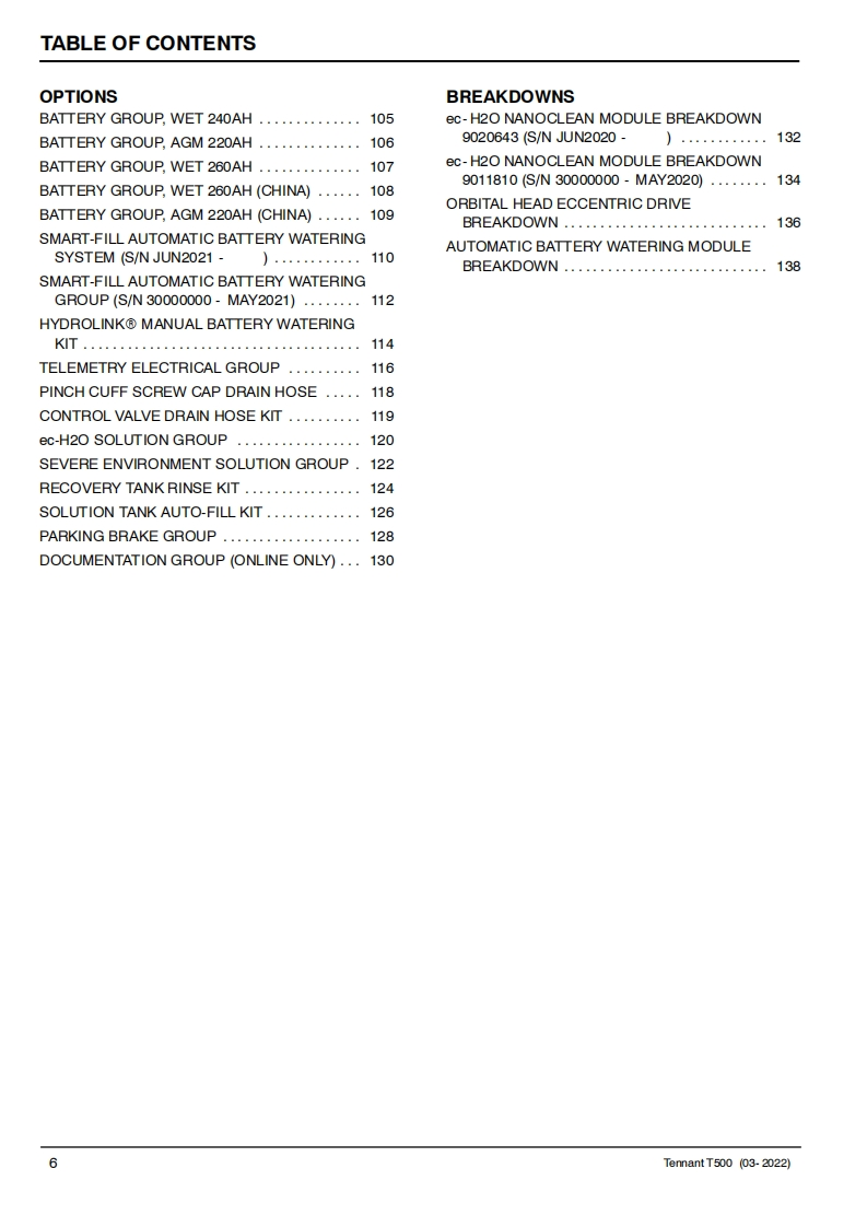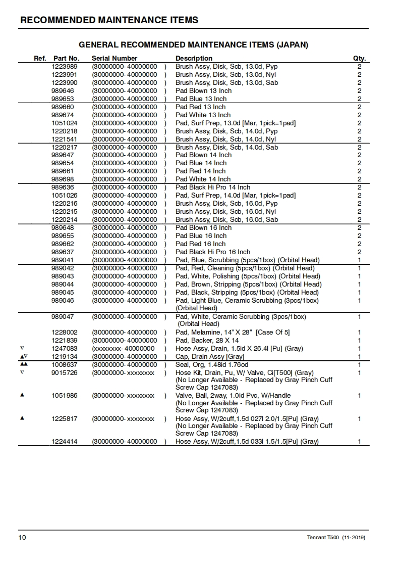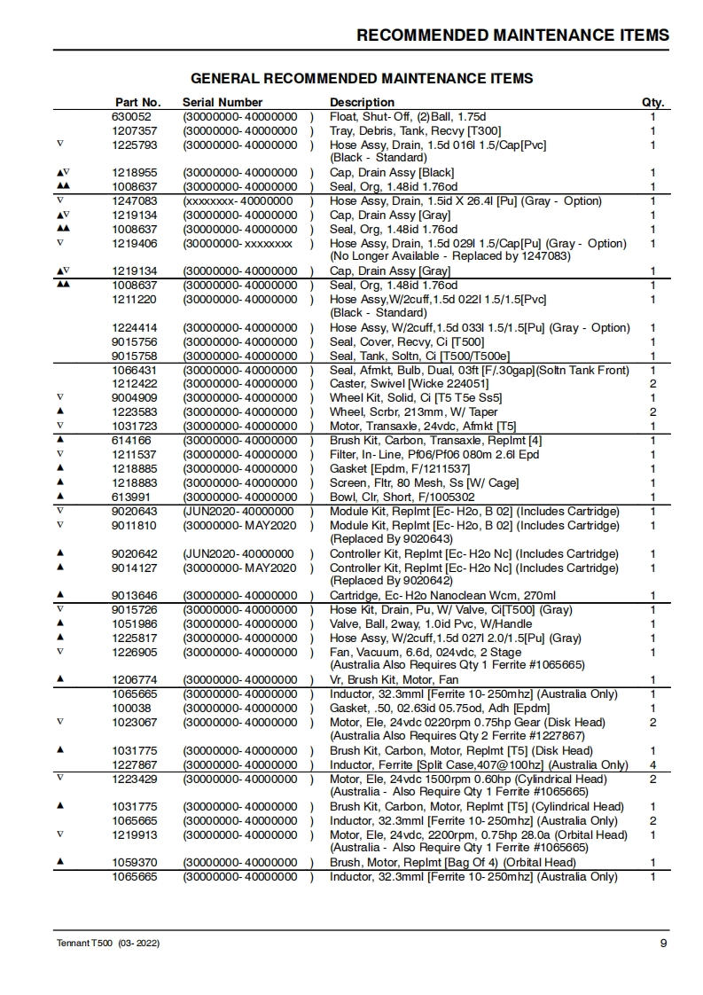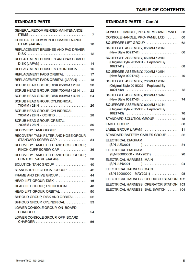 TENNANTT500WALK-BEHIND FLOOR SCRUBBERMachine Serial Number Range(S/N30000000-40000000)Parts ManualHygenic Fully Cleanable Recovery TankTennantTrue®PartsIR/S a Tennant TechnologyPro-Pane/®ControlsInsta-FitTM AdapterSmart-FillTM Automatic Battery WateringH2NanoCleanChina/International /Japan▣i▣For the latest Parts manuals and other9015520language Operator manuals,visit:ReV.04(03-2022)45▣出www.tennantco.com/manuals