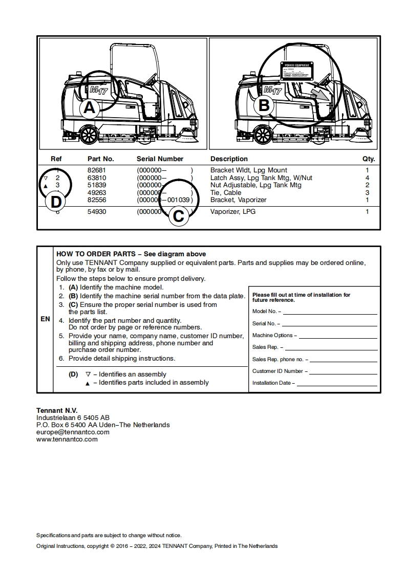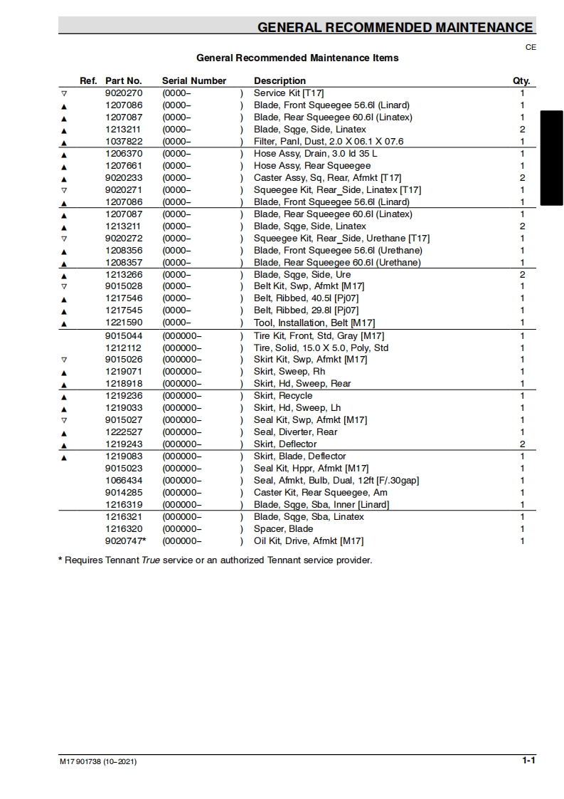 TENNANTM17(Battery)Rider ScrubberParts Manual@0ES Extended Scrub SystemTennantTrue®PartsIRIS a Tennant TechnologyPro-Panel TMInsta-FitTM AdapterAn ORBIO TechnologyEurope/International/JapanFor latest Parts manual or other9017383language Operator manuals,visit:ReV.11(6-2024)www.tennantco.com/manualsM