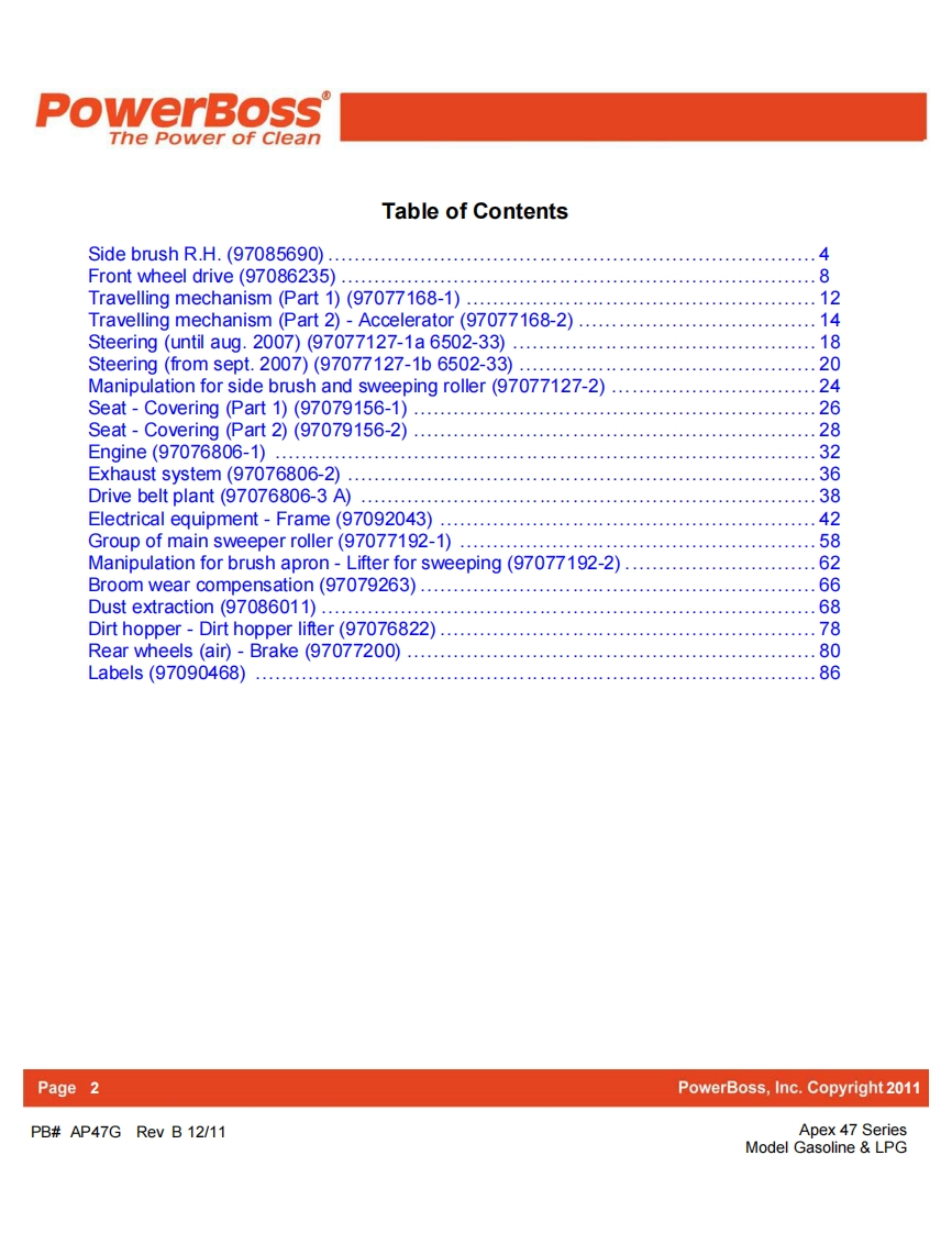 PowerBoss-Apex-47-IC-Parts-Manual维修零部件手册找手册网11小时前发布关注私信3.05MB90页035PowerBoss-Apex-47-IC-Parts-Manual维修零部件手册此内容为付费资源,请付费后查看¥19¥21黄金会员免费钻石会员免费立即购买您当前未登录!建议登陆后购买,可保存购买订单付费资源 第1页 / 共90页 第2页 / 共90页 第3页 / 共90页 第4页 / 共90页 第5页 / 共90页 第6页 / 共90页 第7页 / 共90页 第8页 / 共90页 第9页 / 共90页 第10页 / 共90页 试读已结束,还剩80页,您可下载完整版后进行离线阅读 THE ENDPower-Boss 文本预览 PowerBossThe Power of CleanParts CatalogApex 47 SeriesModel Gasoline LPGPowerBossPowerBoss,IncA Member Of The Hako GroupPB#AP47G Rev B 12/11 查看更多 收起部分 喜欢就支持一下吧收藏