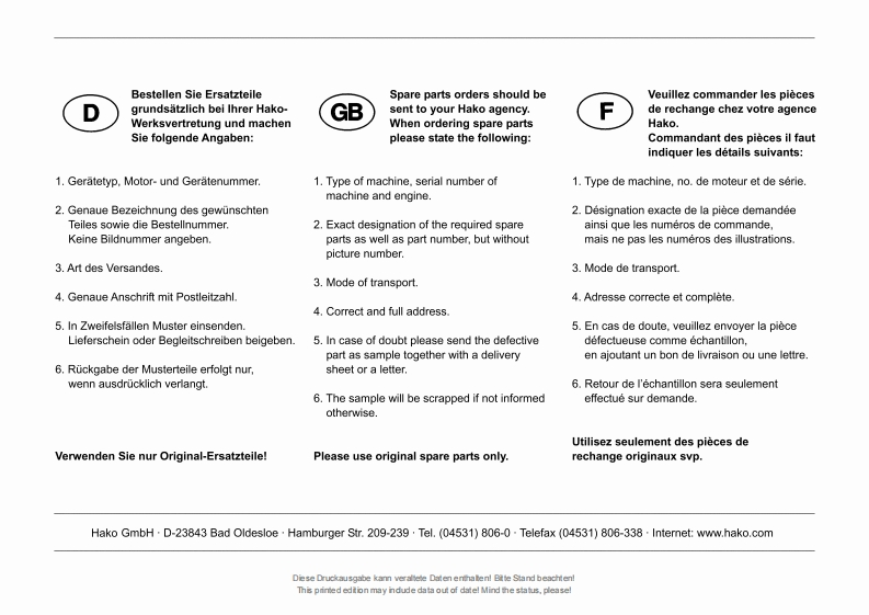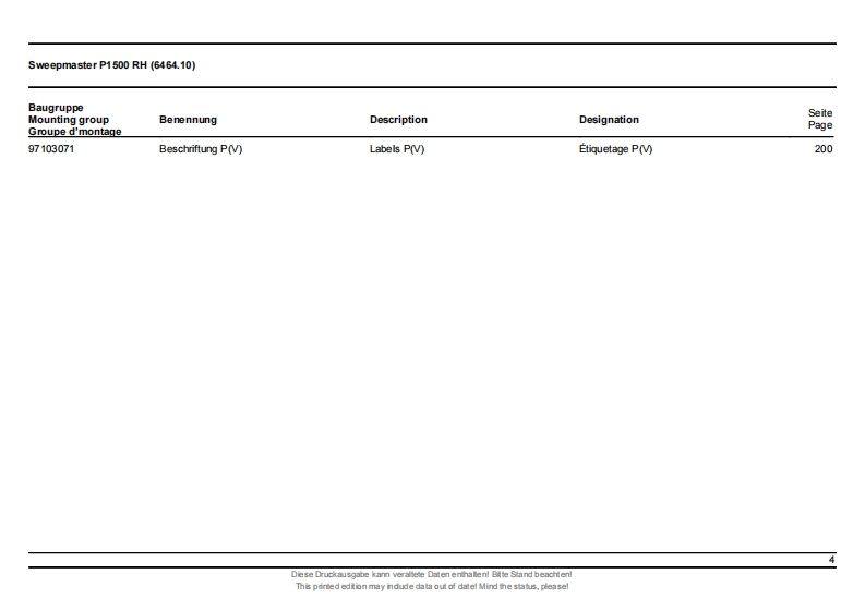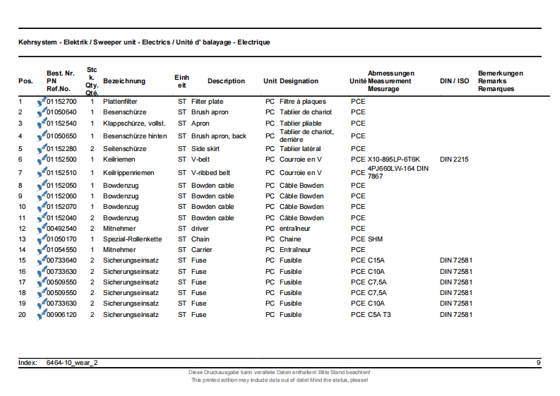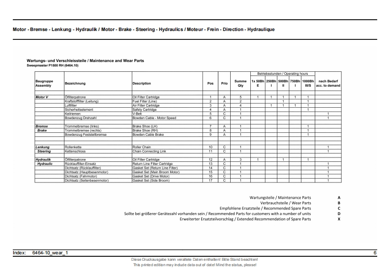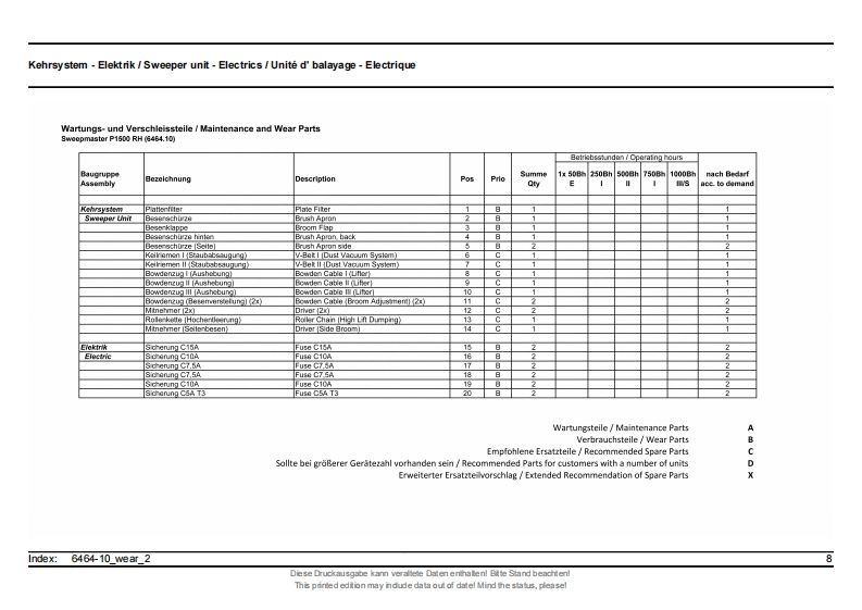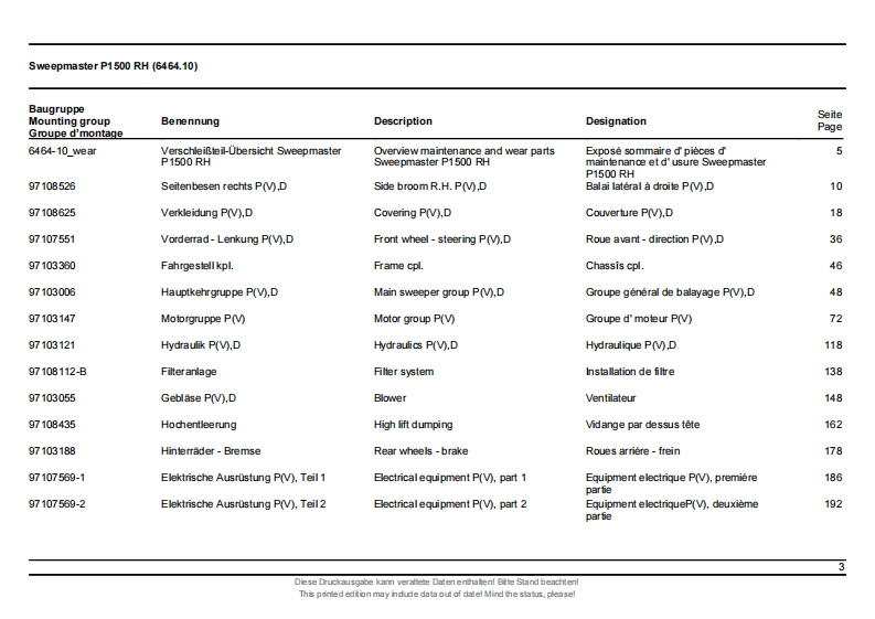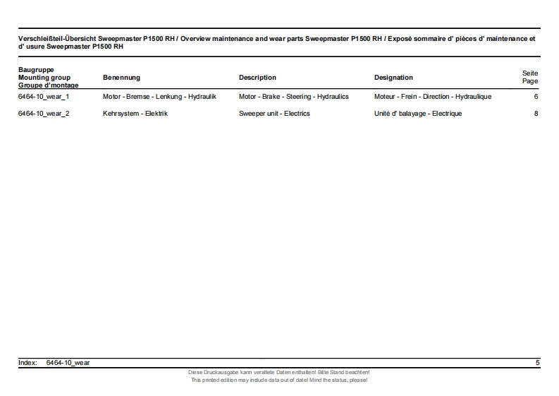 ErsatzteillisteHakoSpare parts listClean aheadListe de pieces de rechangeSweepmaster P1500 RH6464.10)Stand as of:85-00-1993-790Diese Druckausgabe kann veraltele Daten enthaten!Bitte Stand beachten!This primed edtion may ndude data out of datel Mind the status,pleasel