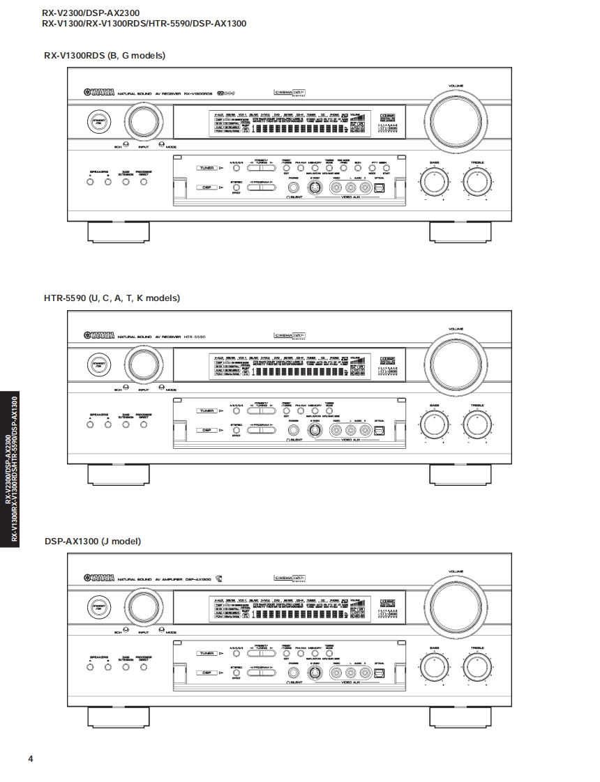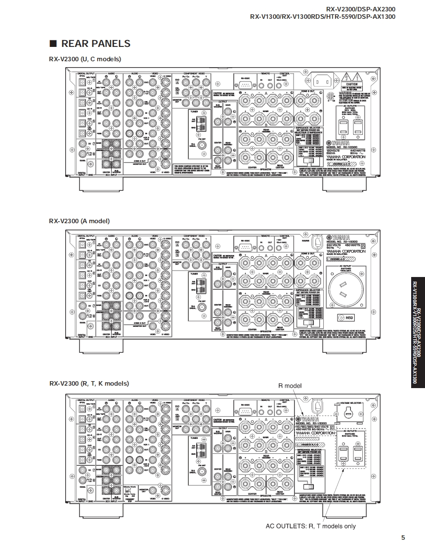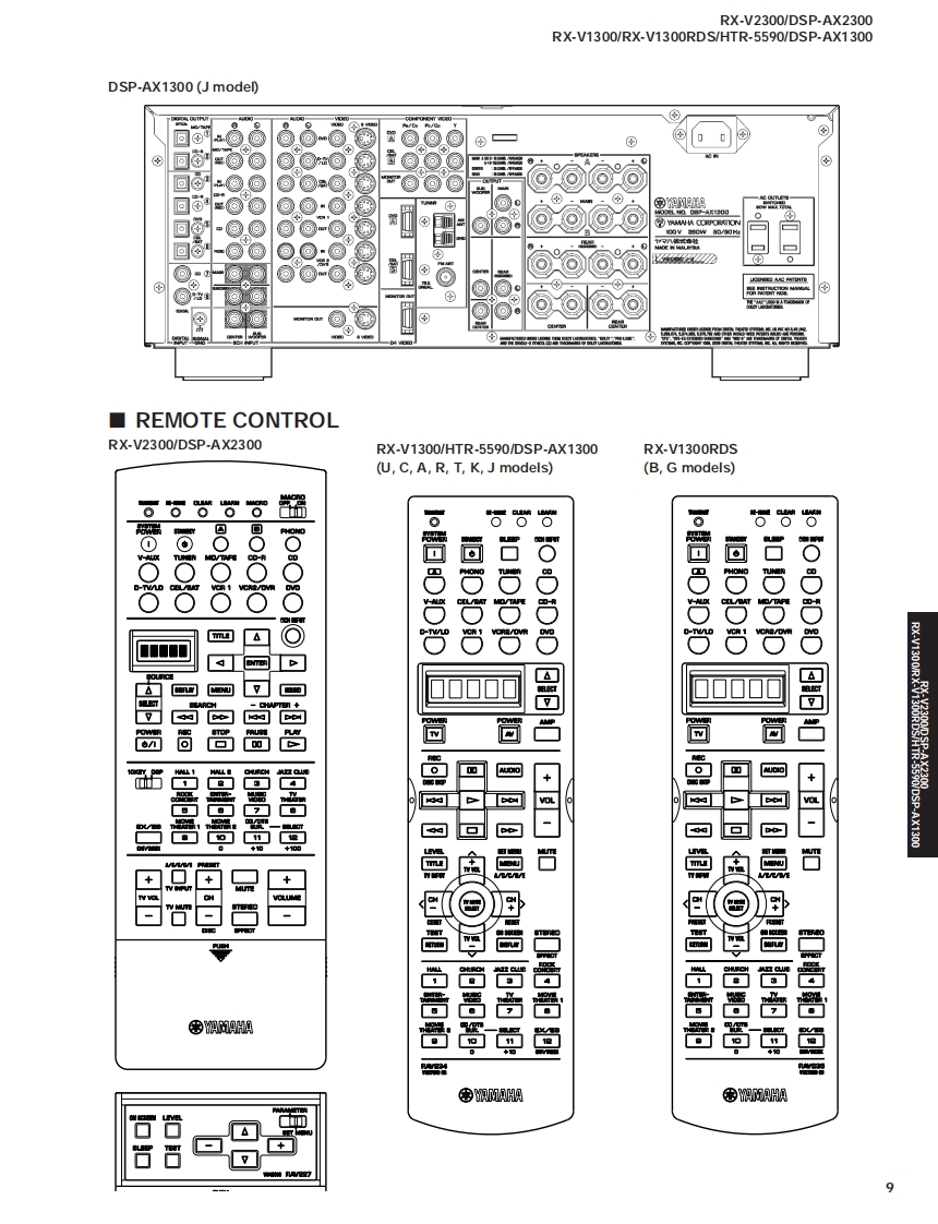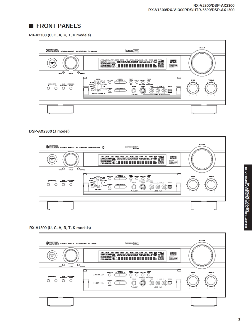 AV RECEIVER/AV AMPLIFIERRX-V2300/DSP-AX2300RX-V1300/RX-V1300RDS/HTR-5590/DSP-AX1300SERVICE MANUALIMPORTANT NOTICEThis manual has been provided for the use of authorized YAMAHA Retailers and their service personnel.It has been assumed that basic service procedures inherent to the industry,and more specifically YAMAHA Products,are alreadyknown and understood by the users,and have therefore not been restated.WARNING:Failure to follw appropriate service and safety procedures when servicing this product may result in personalinjury,destruction of expensive components,and failure of the product to perform as specified.For these reasons,we advise all YAMAHA product owners that any service required should be performed by an authorizedYAMAHA Retailer or the appointed service representative.IMPORTANT:The presentationor sal ofthis manual toany individual or fim does not constitute authorization,cerification orrecognition of any applicable technical capabilities or establish a principle-agent relationship of any form.The data provided is believed to be accurate and applicable to the unit(s)indicated on the cover.The research,engineering,andservice departments of YAMAHA are continually striving to improve YAMAHA products.Modifications are,therefore,inevitableand specifications are subject to change without notice or obligation to retrofit.Should any discrepancy appear to exist,pleasecontact the distributor's Service Division.WARNING:Static discharges can destroy expensive components.Discharge any static electricity your body may haveaccumulated by grounding yourself to the ground buss in the unit (heavy gauge black wires connect to this buss).IMPORTANT:Tum the unit OFF during disassembly and part replacement Recheck all work before you apply power to the unit.RX-V1300RX10DSP-AX1300■CONTENTSTO SERVICE PERSONNEL....…2AMP ADJUSTMENT/了>プ部調整......46-47IMPEDANCE SELECTOR..2DISPLAY DATA.8-49FRONT PANELS....3-4IC DATA..50-53REAR PANELS5-9BLOCK DIAGRAM.....REMOTE CONTROLm.9PRINTED CIRCUIT BOARD56-81SPECIFICATIONS......10-12PIN CONNECTION DIAGRAM.......…82INTERNAL VIEW.13SC HEMATIC DIAGRAM ........83-92DISASSEMBLY PROCEDURES/分解手顺14~18PARTS LIST….93-153SELF DIAGNOSIS FUNCTION (DIAG)/REMOTE CONTROL..........154-159自己診断機能(ダ亻了)19-45Parts List for Carbon Resistors.160二)步一比入マ二1了儿t、工口了一夕玛定再生抵专使用T李亨。This Service Manual uses recyded paper.米YAMAHA100816YAMAHA CORPORATIONP.O.Box 1,Hamamatsu,Japan