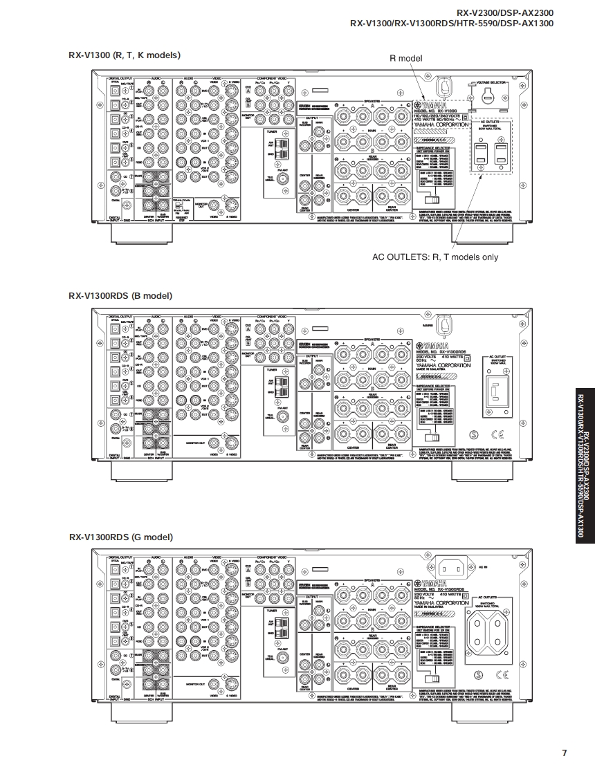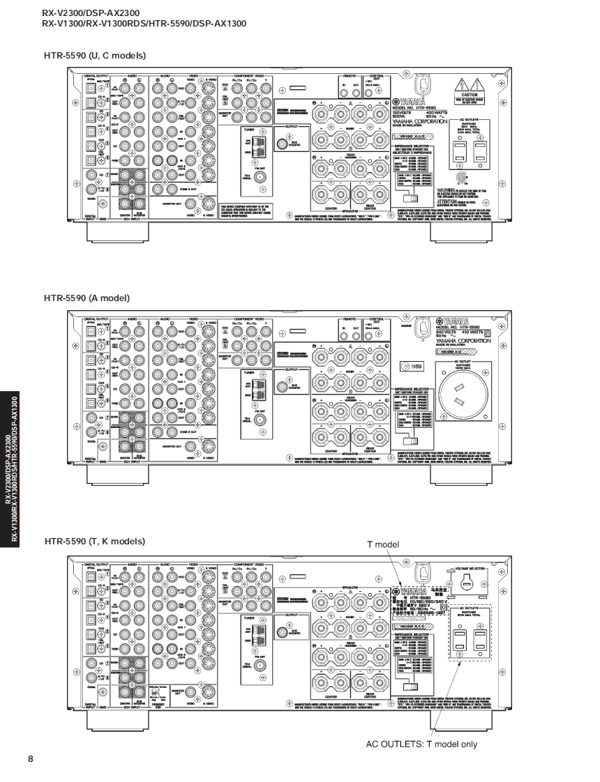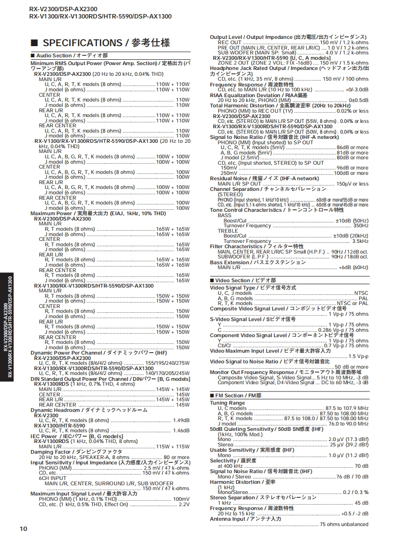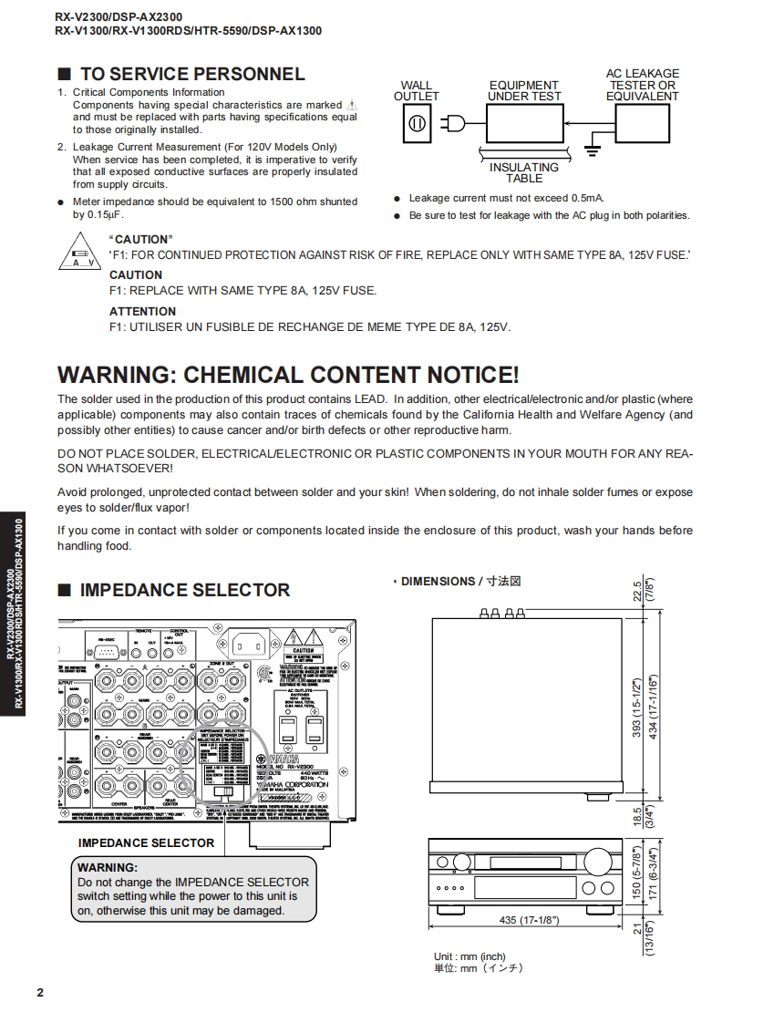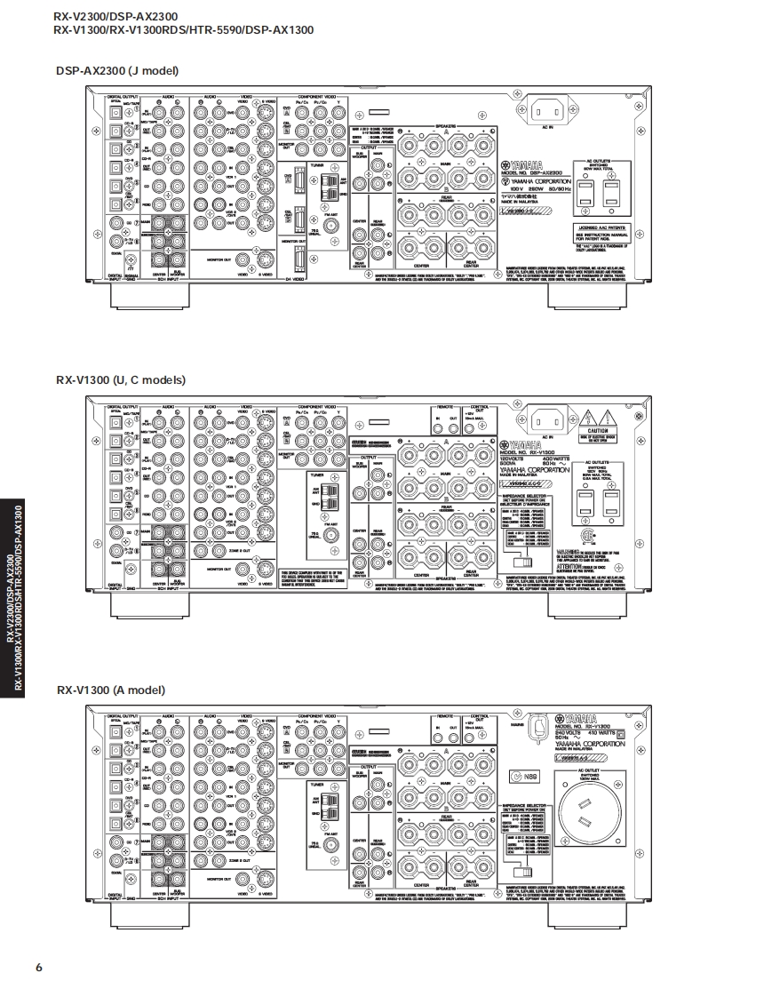 AV RECEIVER/AV AMPLIFIERRX-V2300/DSP-AX2300RX-V1300/RX-V1300RDS/HTR-5590/DSP-AX1300SERVICE MANUALIMPORTANT NOTICEThis manual has been provided for the use of authorized YAMAHA Retailers and their service personnel.It has been assumed that basic service procedures inherent to the industry,and more specifically YAMAHA Products,are alreadyknown and understood by the users,and have therefore not been restated.WARNING:Failure to follw appropriate service and safety procedures when servicing this product may result in personalinjury,destruction of expensive components,and failure of the product to perform as specified.For these reasons,we advise all YAMAHA product owners that any service required should be performed by an authorizedYAMAHA Retailer or the appointed service representative.IMPORTANT:The presentationor sal ofthis manual toany individual or fim does not constitute authorization,cerification orrecognition of any applicable technical capabilities or establish a principle-agent relationship of any form.The data provided is believed to be accurate and applicable to the unit(s)indicated on the cover.The research,engineering,andservice departments of YAMAHA are continually striving to improve YAMAHA products.Modifications are,therefore,inevitableand specifications are subject to change without notice or obligation to retrofit.Should any discrepancy appear to exist,pleasecontact the distributor's Service Division.WARNING:Static discharges can destroy expensive components.Discharge any static electricity your body may haveaccumulated by grounding yourself to the ground buss in the unit (heavy gauge black wires connect to this buss).IMPORTANT:Tum the unit OFF during disassembly and part replacement Recheck all work before you apply power to the unit.RX-V1300RX10DSP-AX1300■CONTENTSTO SERVICE PERSONNEL....…2AMP ADJUSTMENT/了>プ部調整......46-47IMPEDANCE SELECTOR..2DISPLAY DATA.8-49FRONT PANELS....3-4IC DATA..50-53REAR PANELS5-9BLOCK DIAGRAM.....REMOTE CONTROLm.9PRINTED CIRCUIT BOARD56-81SPECIFICATIONS......10-12PIN CONNECTION DIAGRAM.......…82INTERNAL VIEW.13SC HEMATIC DIAGRAM ........83-92DISASSEMBLY PROCEDURES/分解手顺14~18PARTS LIST….93-153SELF DIAGNOSIS FUNCTION (DIAG)/REMOTE CONTROL..........154-159自己診断機能(ダ亻了)19-45Parts List for Carbon Resistors.160二)步一比入マ二1了儿t、工口了一夕玛定再生抵专使用T李亨。This Service Manual uses recyded paper.米YAMAHA100816YAMAHA CORPORATIONP.O.Box 1,Hamamatsu,Japan