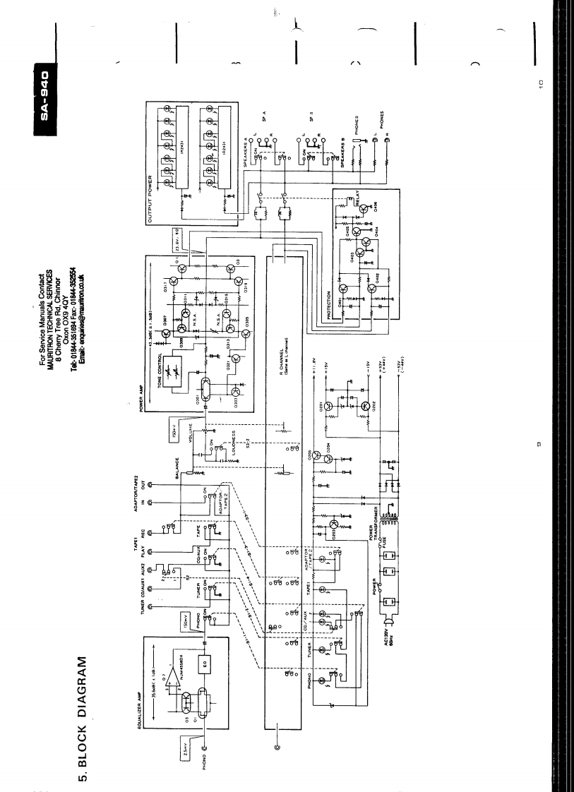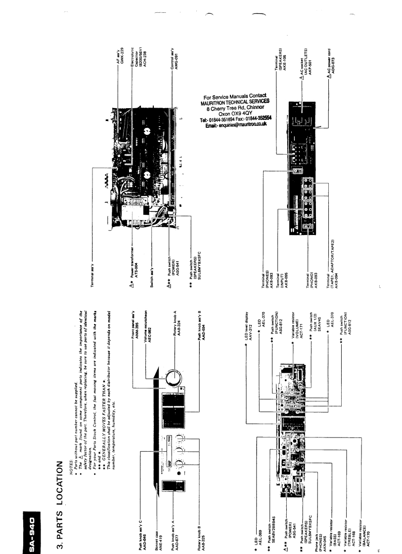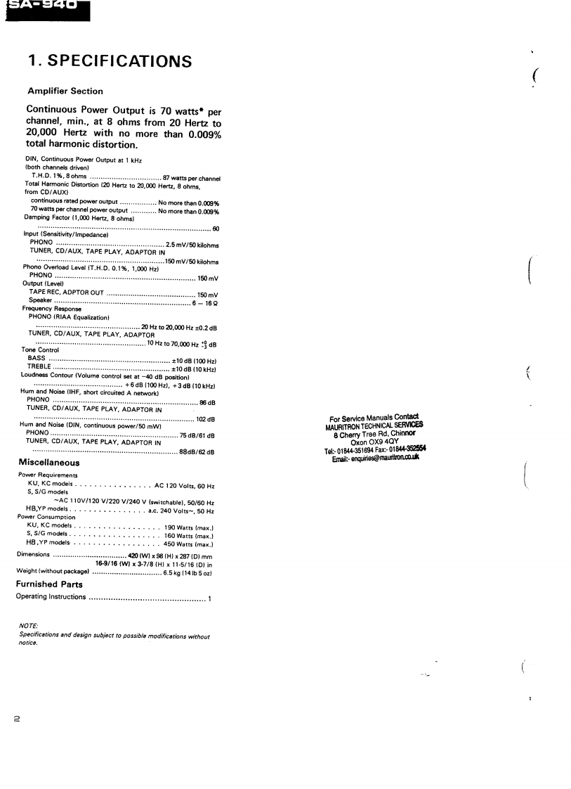 PIONEERServiceFor Service Manuais Contactc ManualMAURITRON TECHNICAL SERVICES8 Cherry Tree Rd,ChinnorOxon OX9 4QYTek01844-351694Fac01844352554Email:-enquines@mauritronco.ukCIRCUIT DESCRIPTIONSREPAIR ADJUSTMENTS·)QORDER NO.STEREO AMPLIFIERARP-298-03A9A0MODEL SA-940 COMES IN SEVEN VERSIONS DISTINGUISHED AS FOLLOWS:TypeVoltageRemarksKUAC120V onlyU.S.A.modelHEAC220V,240V (switchable)European continent modelH8AC220V,240V (switchable)United Kingdom modelAC110V,120V,220V,240V (switchabie}General export modelS/GAC110V,120V,220V,240V (switchabie]U.S.Military modelYPAC240V ontyAustralia modelHEZAC220V,240V (switchable)West Germany modelFor Service Manuals ContactMAURITRON TECHNICAL SERVICES8Cherry Tree Rd,ChinnorOxon OX9 4QYTel01844-351694Fax01844-35254Email:-enquiries@mauritron.co.ukPIONEER ELECTRONIC CORPORATION 4-1.Meguro 1-Chome.Meguro-ku.Tokyo 153.JepanPIONEER ELECTRONICS [USA]INC.1925 E.Cominguez St..Long Beach.Cakfomna 90810 U.S.A.PIONEER ELECTRONIC [EUROPE]N.V.Keetbergoan 1.2740 BePIONEER ELECTRONICS AUSTRALIA PTY.LTO:178-184 Boundary Road,Braeside.Victona 3195.Australiaeren.日clgiurnYL APR.1983 Printed in lapan