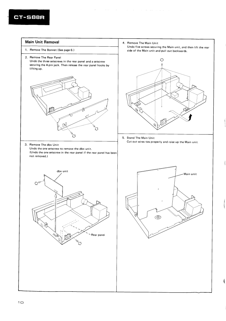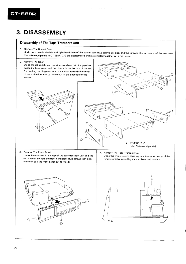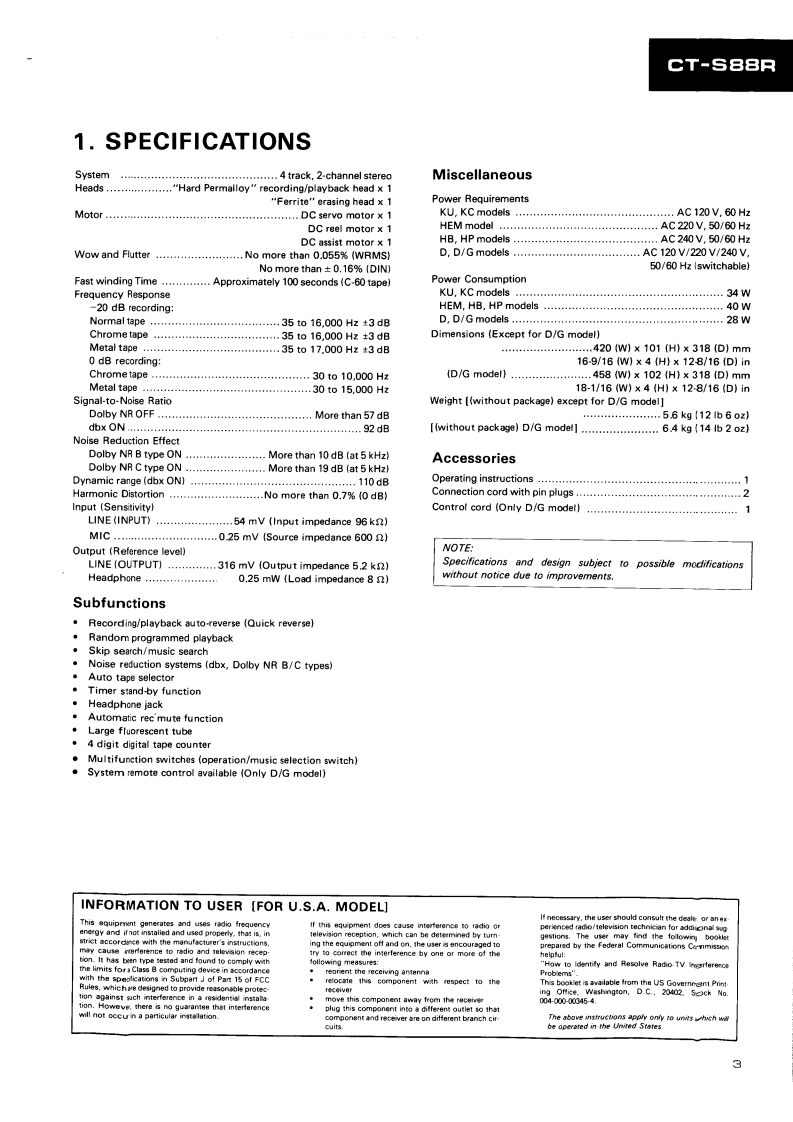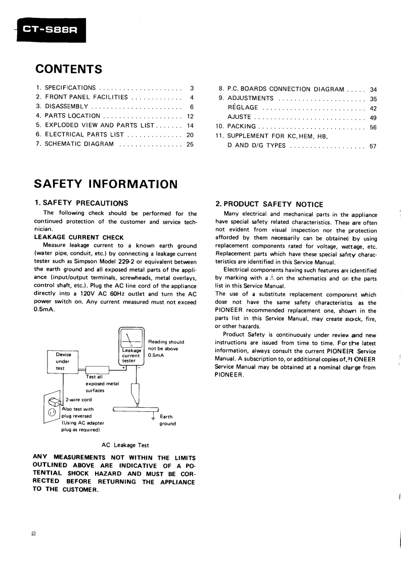 PIONEERD39ServiceManualREPAIR ADJUSTMENTSORDER NO.ARP-835-0STEREO CASSETTE TAPE DECKCT-S88RCT-S88RCBKJ.Model CT-S88R [BK]is a black version of the CT-S88R..Model CT-S88R [BK]/D/G (U.S.Military model)has wooden side panels and the remote control IN/OUTterminals..Models CT-S88R [BK](black)and CT-S88R (silver)come in versions distinguished as follows:Applicable modelTypePower requirementDestinationCT-S88RIBK】CT-S88RKU0AC120V onlyU.S.A.KCOAC120V onlyCanadaHEM00AC220V(240V)European continentHB0AC240V(220V)United KingdomD0AC120V/220V/240V (switchable)General marketD/G0AC120V/220V/240V (switchable)U.S.MilitaryChange the primary wiring of the powertra nsformer..This service manual is applicable to the KU,KC,HEM,HB,D and D/G types..As to the KC,HEM,HB,D and D/G types,please refer to pages 57-61..As to the circuit descriptions,please refer to the CT-S88R service manual (ARP-836).Ce manual d'instruction se refere au mode de reglage en frangais.●Este manual de servicio trata del metodo ajuste escrito en espanol.PIONEER ELECTRONIC CORPORATION 4-1.Meguro 1-chome.Meguro-ku.Tokyo 153.JapoPIONEER ELECTRONICS [USA]INC.P.O.Box 1760,Long Beach,California 90801 U.S.A.TEL:B00421-1404.o1237-0424PIONEER ELECTRONIC [EUROPE]N.V.Keetberglaan 1.2740 Beveren.Belgum TEL:03/775280BPIONEER ELECTRONICB AUSTRALIA PTY.LTD.178-184 Boundary Road,Braeside.Victoria 3195.AustraaTEL:1031590-9911YHMAY 1985 Prated in Japan