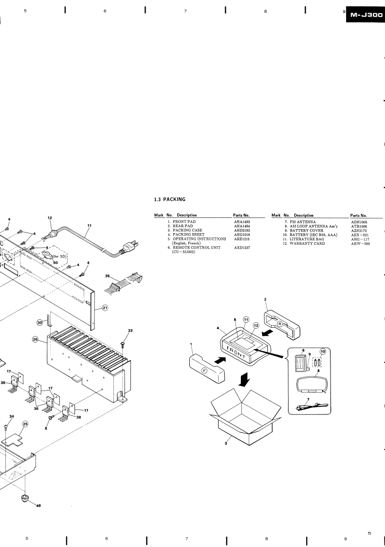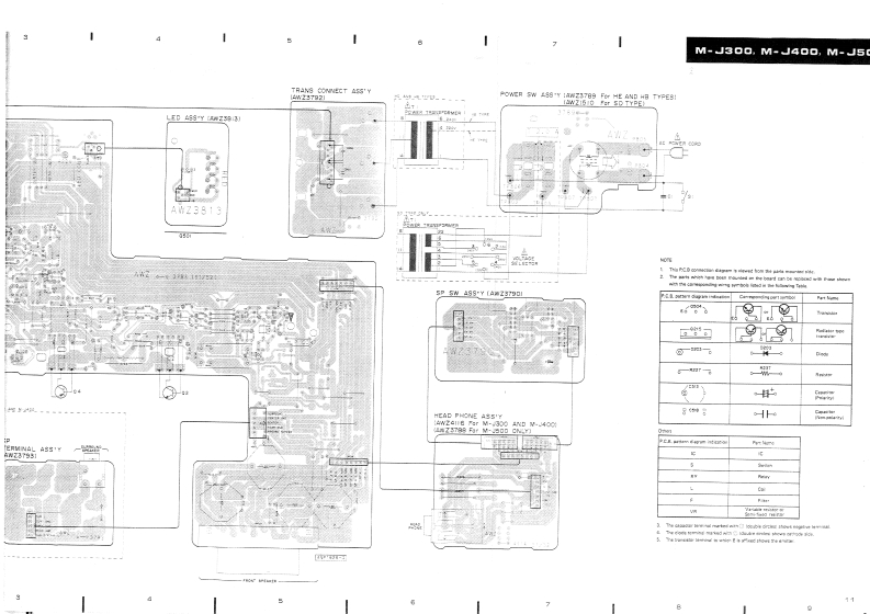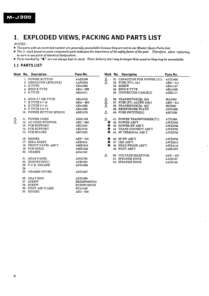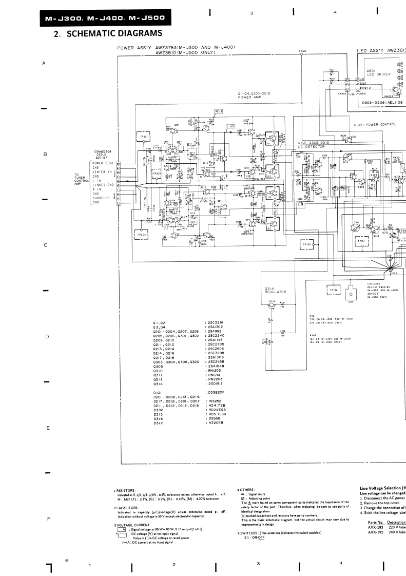 PIONEERThe Art of EntertainmentServicecManualORDER NO.ARP2382STEREO POWER AMPLIFIERM-J300MJ8品M-J 300,M-J 400 AND M-J 500 HAVE THE FOLLOWINGModelTypePower RequirementRemarksM-J300M-J400M-J500HBO00AC 220 V-230 V.AC 230-240 V(switchable)*HE00OAC 220 V-230 V,AC 230-240 V(switchable)*SD00AC 110 V.120 V-127 V,220 V,240 V(switchable)Change the connection of the power transformer's primary wiring.This manual is applicable to the M-J 300/HB,HE,SD,M-J 400/HB.HE,M-J 500/HB,HE and SD types.As to the M-J 300/HE,SD,M-J 400/HB,HE,M-J 500/HB,HE and SD types,refer to page 17..These products are components of systems.As to the system composition,refer to the system manuals.Each of these products does not function properly when independent;to avoid malfunctions,be sure toconnect it to the prescribed system components,otherwise damage may result.CONTENTS1.EXPLODED VIEWS,PACKING AND PARTS LIST ......22.SCHEMATIC DIAGRAMS..63.PCB CONNECTION DIAGRAMS94.PCB PARTS LIST…155.FOR M-J 300/HE,SD.M-J 400/HB.HE,M-J 500/HB.HE AND SD TYPES...-----.........-176.PANEL FACILITIES......197.SPECIFICATIONS11…19PIONEER ELECTRONIC CORPORATION 4-1.Meguro 1-Cnome.Meguro-ku.Tokyo 153.JapanPIONEER ELECTRONICS SERVICE INC.P.O.Box 1760,Long Beach,California 90801 U.S.APIONEER ELECTRONICS OF CANADA,INC.505 Cochrane Drive,Markham,Ontario L3R 8E3 CanadaPIONEER ELECTRONIC [EUROPE]N.V.Haven 1087 Keetberglaan 1,9120 Melsele.BelgiumPIONEER ELECTRONICS AUSTRALIA PTY.LTD.178-184 Boundary Road,Braeside,Victoria 3195,Australia TEL:[03]580-9911PIONEER ELECTRONIC CORPORATION 1991FJ DEC.1991 Printed in Japan