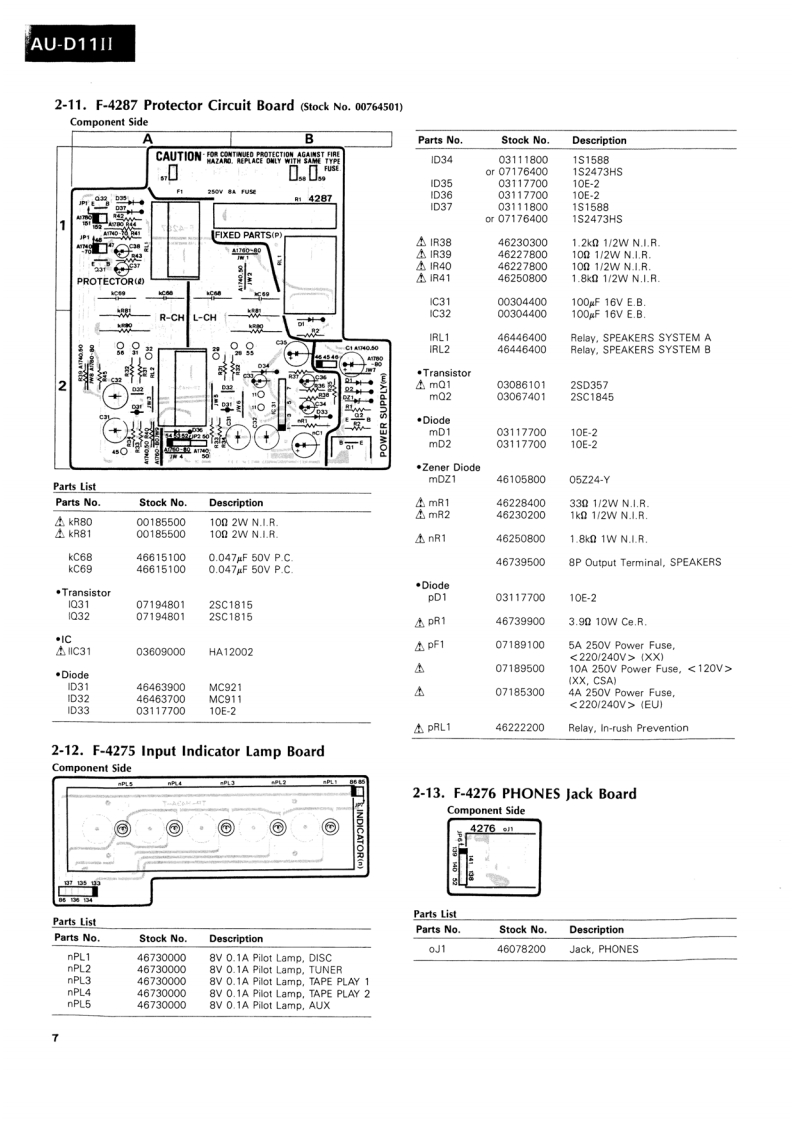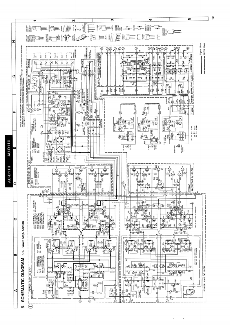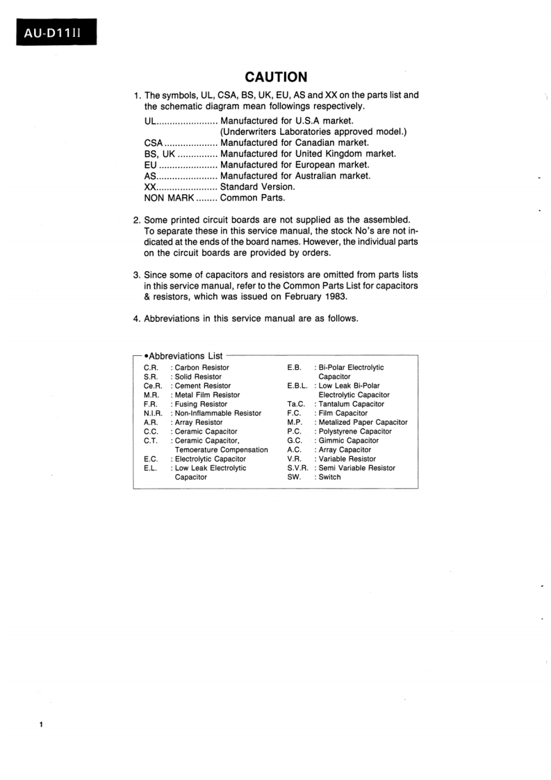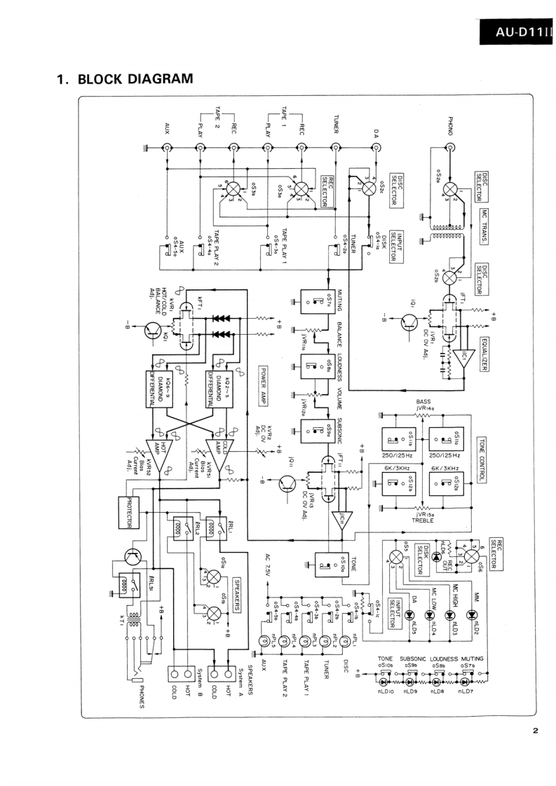 AU-D11IlSERVICE MANUAL·SPECIFICATIONSPower outputMin.RMS,both channels driven,from 10to 20,000 Hz,withno more than 0.0028%total harmonic distortion.INTEGRATED AMPLIFIER130 watts per channel into 8 ohms.Load impedance.........8 ohmsTotal harmonic distortionSANSUI AU-D11I...less than 0.0028%at or below rated min.RMS poweroutputIntermodulation distortion(60 Hz:7 kHz=4:1 SMPTE method)..........less than 0.0028%at ratedpower outputFrequency response (at 1 watt)Overall (from AUX).....DC to 300,000 Hz,+0 dB-3.0dBRIAA curve deviation (DISC-MM,20 Hz to 20 kHz).+0.2dB,-0.2dBInput sensitivity and impedance(at 1 kHz)DISC-MC-HIGH........250 V/40 ohmsDISC-MC-LOW............70 uV/3.2 ohms(Max.input capability (LOW):25 mV at 1 kHz,lessthan 0.01%total harmonic distortion)DISC-MM.......2.5 mV/47 kilohms(Max.input capability:200 mV at 1 kHz,less than0.01%total harmonic distortion)DISC-DA......…150mV/47 kilohmsAUX,TUNER,TAPE PLAY-1,2..150 mV/47 kilohmsOutput level (1,000 Hz)CAUTIONTAPE REC-1,2............150 mV into 47 kilohms1.Parts identified by the symbol on the schematicSignal to noise ratio(short-circuit,A-network)DISC-MC.diagram and the parts list are critical for safety.80dBDISC-MM..90 dBUse only replacement parts that have criticalAUX,TUNER,TAPE PLAY-1,2characteristics recommended by the manufacturer..110dBControls and Filter2.Make leakage-current or resistance measurementsBAS5±10dBat50Hzto determine that exposed parts are acceptably in-Tone selector..125Hz,250HzTREBLE...sulated from the supply circuit before returning the.±10dBat10kHzTone selector........3 kHz,6 kHzappliance to the customer.SUBSONIC-3 dB at 16 Hz (6 dB/oct)MUTING-20dBLOUDNESS+8 dB at 50 Hz(VOLUME:-30 dB+6 dB at 10kHzposition)Power requirementsPower voltage...120/220/240V(50/60Hz)For U.S.A.Canada.120V(60HzPower consumption....470 watts 560 VA Rated700 watts MaximumDimensions..........466mm(18-3/8)W161mm(6-3/8)H431mm(17)DWeight.17 kg (37.4 Ibs)net19 kg (41.8 Ibs)packedDfiic to chnge h ice ormSansuiSANSUI ELECTRIC CO.,LTD.