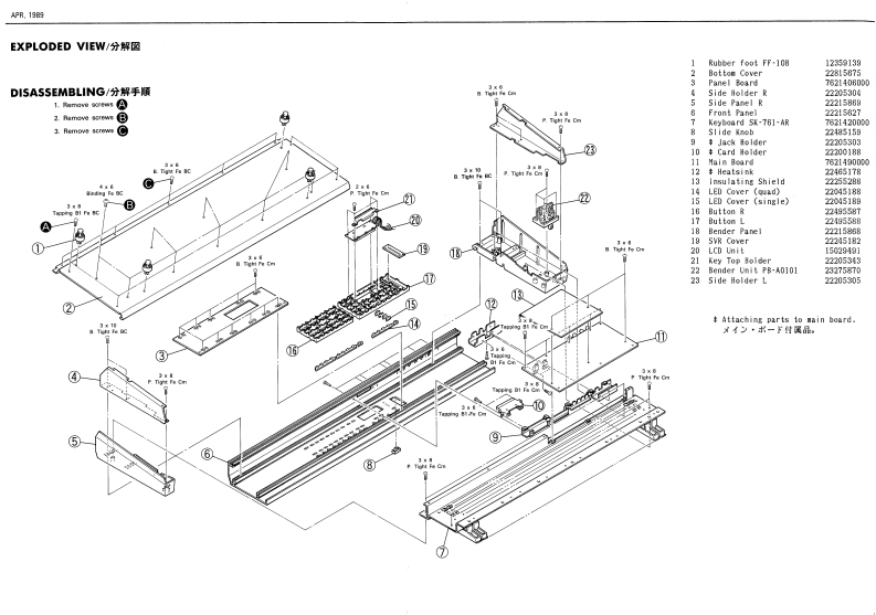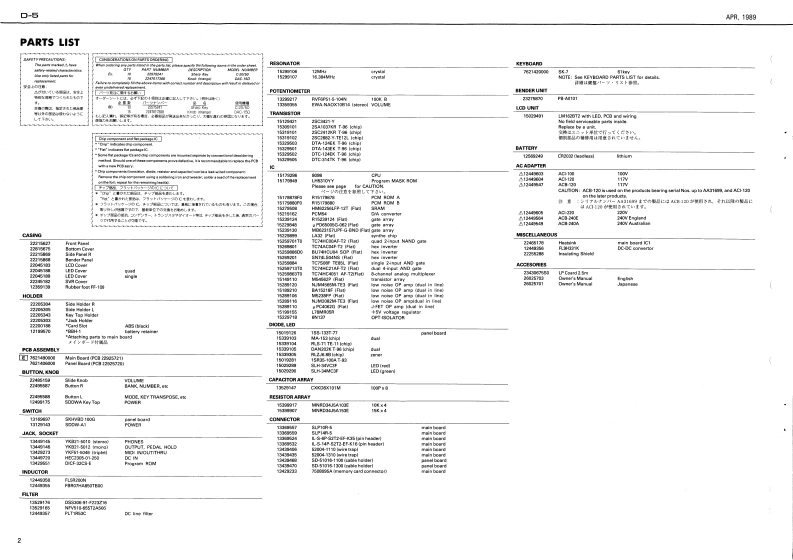 APR.1989D-5▣5SERVICE NOTESMULTI TIMBRALFirst EditionLINEAR SYNTHESIZERACB-128SPECIFICATIONS/仕模的2理体作易mG1nGdomory CadiMsin Mises!Patohes5Tirboosn首n结年。0网Slide KnobLED Cover (quad)TABLE OF CONTENTS目次Page1224451502204518图SVR CoverSPECIFICATIONS廿样22245121PARTS LIST=夕少天卜2EWA-NAOX10814LCD CoEXPLODED VIEW分解国31355CDKEYBOARD EXPLODED VIEW键触分解区4E队DCK DIAGRAM7口y2回72448SKHVID 100G261131699971TEST MODE学天卜毛-卡611MAIN BOARD天才求=相12.13PANEL BOARD《未几求一下14IC DATAIC子-15.16CHANGE INFORMATION变更案内15HEC2306-01-250(134497200UuttonSDDWA Key Top12490170Ja线triplewcF51-6046VKB21-6012134910SODA A11322273013129140LED CoLEDBender UnitCover (single)22045189Side Pumel R23278四22455801222186gLEDSLH-J4VC3F (red)1502928的SUH-34VC3F Igreen)Card SlotBender Panel(222091周川2221585815022280Card Connecoor7508295424.50Rubber Foct413292aF年-01811316969741344914512391RolandPrinted in Japan BA-2 (CR)1