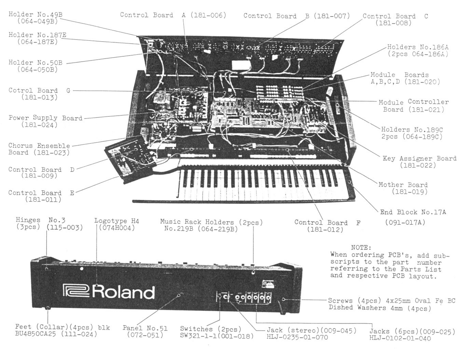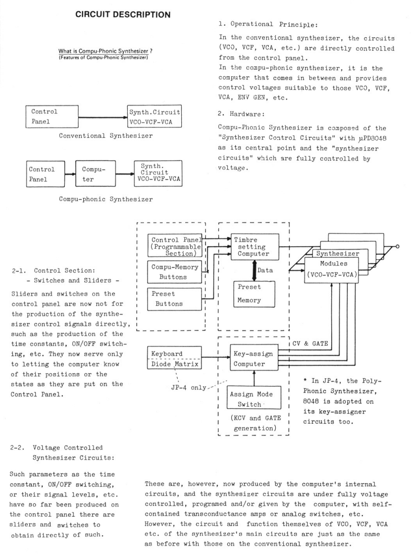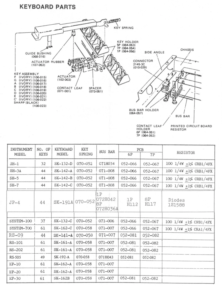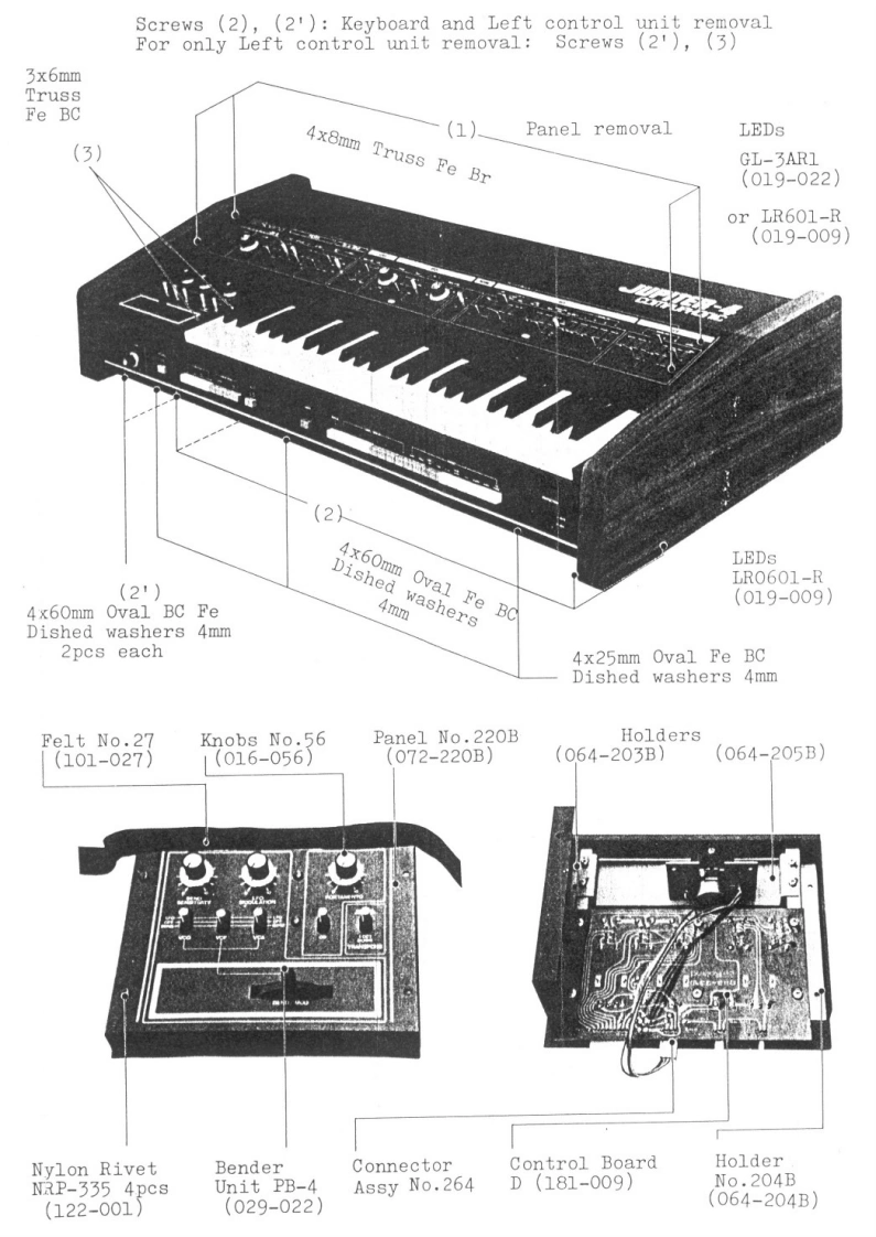 FEB.23.1981JP-4JP-4 SERVICE NOTESSecond EdittionSPECIFICATIONS·KEYBOARD·CONTROLLER(49-keys,4 octaves,C scale)PORTAMENTO (1 sec/8va.)..1·SYNTHESIZER MODULESTRANSPOSE INORMAL.1 Oct DOWNI 1VCO(VOLTAGE CONTROLLEDFIRST READVCO:over±IOctOSCILLATOR)PP.12-2&VCF over+2 Oct.(RESONANCE PITCH)VCO RANGE 116'.8'.4VCA:ower±12dBPUL SE WIDTH (50%.40%.20%10%116-2INFORMATION。TUNING(±50cent.±1%).,-1VCF(VOLTAGE CONTROLLEDFILTER)ON·CONNECTION JACKSHPE CUT OFF (40HZ 5KHzOUTPUT JACKKYBD F0LL0W4i0,40%.704.,100.1DESIGN CHANGESMONO,STEREO).2·LFO(LOW FREQUENCYOUTPUT LEVEL SELECTION SWITCHIAVERAGE OdB at position H)OSCILLATOR)HEADPHONE JACKLFO RATE (OVER O 1 Hz BOHzI(stereol.·ENVELOPE GENERATOREXTERNAL CONTROL JACK(ENVELOPE GENERATOR)for theDAMPER (DP-1).VCF.(FV-2)VCF.VCAEXP.(FV-2:0--30 dB)ATTACK TIME (0.6 ms-3 Sec)EXTERNAL CLOCK [OFF:ov/on min.DECAY TIME (14 ms 10 Sec)+1V pulselSUSTAIN LEVEL (0.100%1POWER REQUIREMENTS........30wRELEASE TIME (14 ms 10 Sec)OVERALL·TRIGGERS1ZE·····946w)×410(D)×179H)mmTRIGGER RATE (1Hz -25 Hz)NET WEIGHT…19%R·DELAY/BENDACCESSORIES.2 5m hookup cords:2DELAY TIME 10-10 Sec)1SwitchSDG5PPanel No.218GKeyboard Ass'y(001-156)(072-218G)】SK-191AKnob No.56Knob No.81(016-056)(016-081)Knobs No.57Knob No.33Pot.(016-057)(016-033)VM1OAK15 100KBCabinet Ass'y(028-1078)(081-108H)ButtonsNo.86RedNo.8Gray(016-008)(016-086)No.87Green(016-087No.81Black016-081)No.88Ye11ow(016-088Panel No.219GNo.85White(016-085No.89Blue(016-089(072-219G)1Printed in Japan AE-2