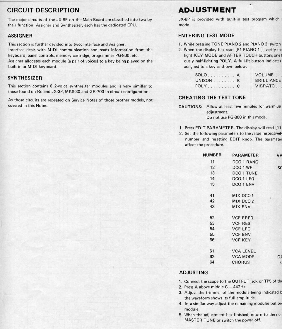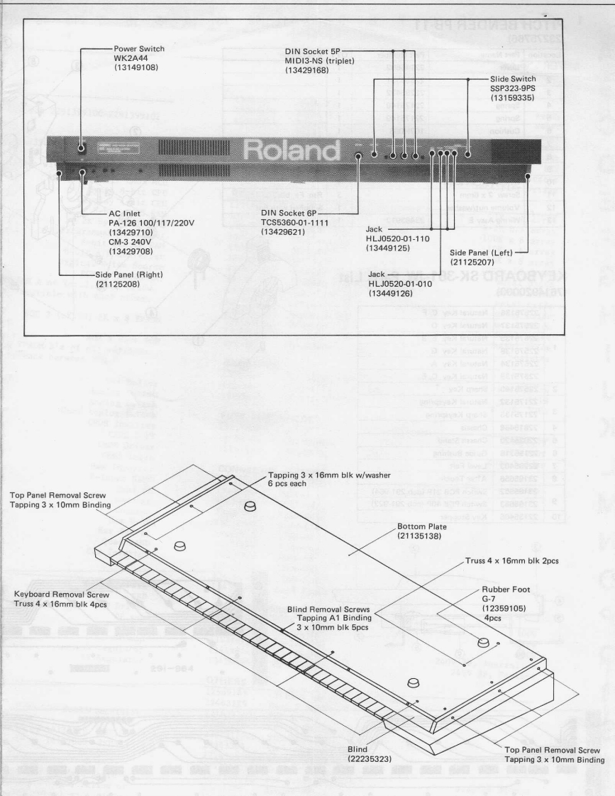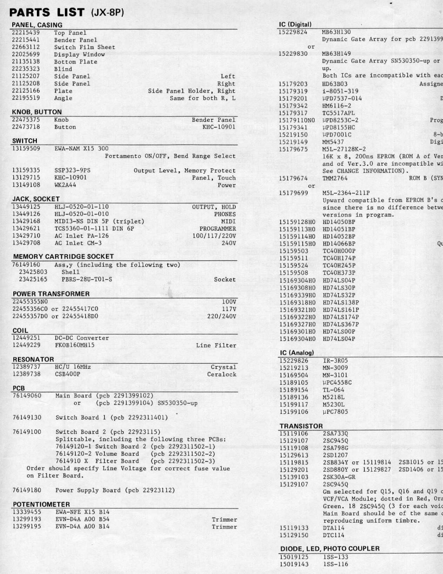 MAY.1985JX-8P/PG-800JX-B尸/尸G-BOOSERVICE NOTESFirst EditionSPECIFICATIONSKeyboardDimensions61 keys977(W)×375(D)×92(H)mm38-7/16"W)×14-3/4"D)×3-9/16"(H)Memory CapacityPreset64 Patch ProgramsWeightInternal Memory32 Patch Programs11.5kgExternal Memory32 Patch Programs25 Ib 60 oz(Memory Cartridge)ConsumptionOutput25W只Stereo/Mono:52528Headphones81,StereoAccessoriesConnections Cables x 2OptionsProgrammer PG-800Memory Cartridge M-16CPedal Switch DP-2Carrying Case AB-2Switch-Display WindowTop PanelKHC-10901(220256991(22215439(13129715)DisplayButtonFIP 16A 5R224737181(15029710)Pot.Switch Film SheetEWANFEX15B14(22663112)10KB(13339455)Knob(22475375)MemoryCartridgeSocket*(76149160)SwitchEWANAMX15-300(13159509)Knob(22475375)-Keyboard.SK361-JW(7614920000jBender UnitBender PanelPB-11(22215441}(23275766)*Detailed on P.2Roland(JAN.1988 C-2 2nd)Printed in Japan B-3 1