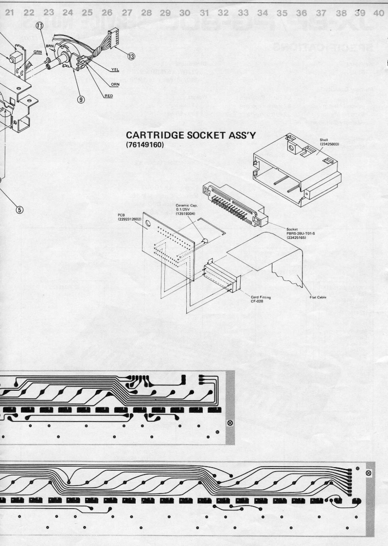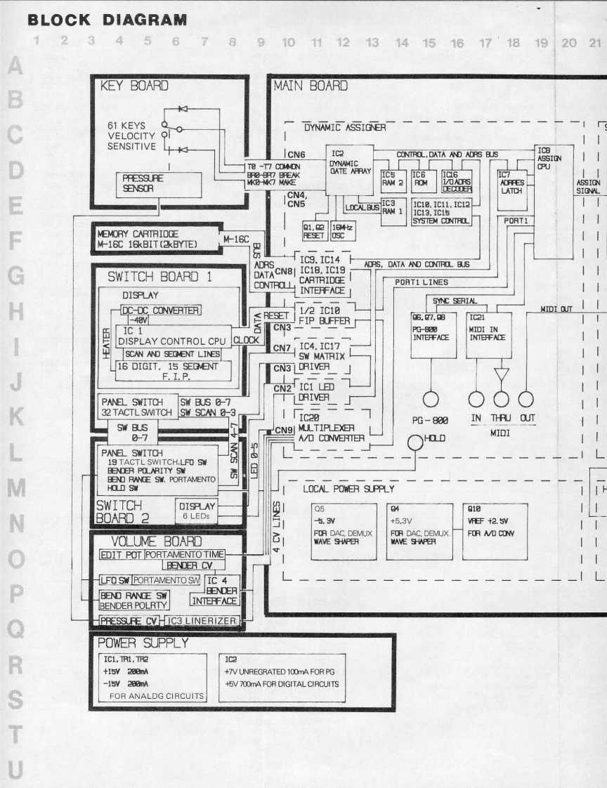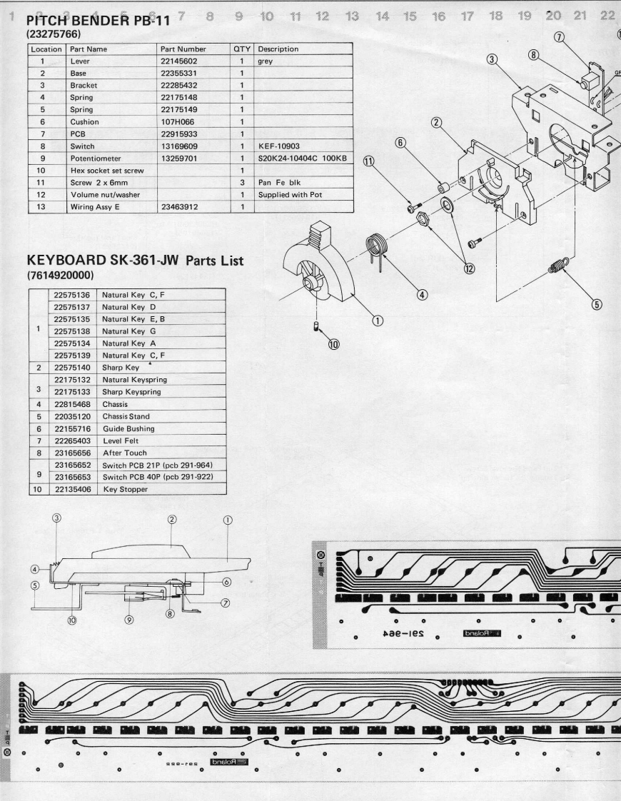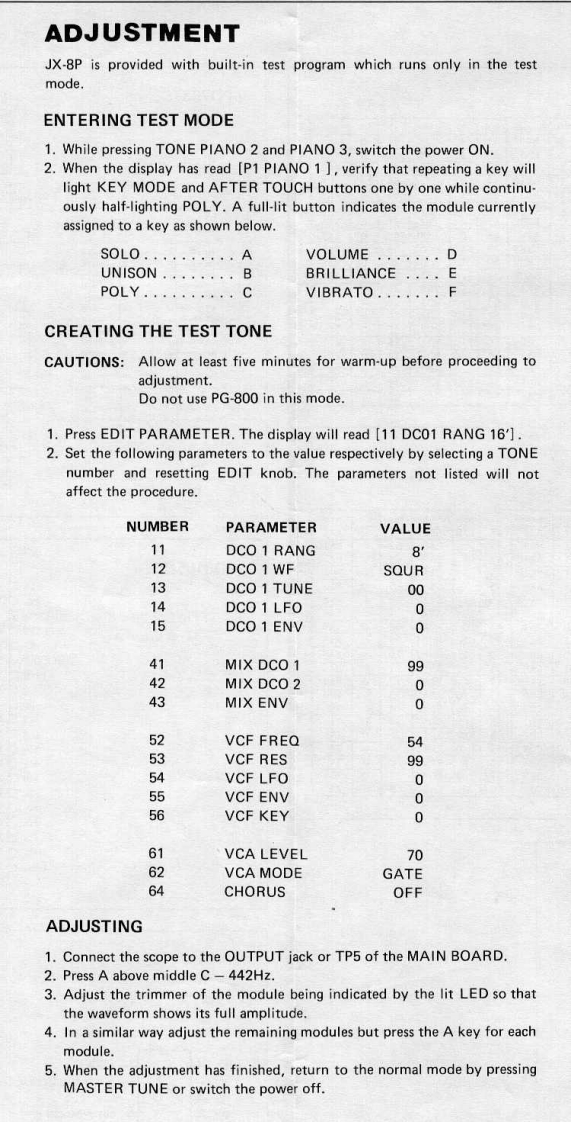 MAY.1985JX-8P/PG-800JX-B尸/尸G-BOOSERVICE NOTESFirst EditionSPECIFICATIONSKeyboardDimensions61 keys977(W)×375(D)×92(H)mm38-7/16"W)×14-3/4"D)×3-9/16"(H)Memory CapacityPreset64 Patch ProgramsWeightInternal Memory32 Patch Programs11.5kgExternal Memory32 Patch Programs25 Ib 60 oz(Memory Cartridge)ConsumptionOutput25W只Stereo/Mono:52528Headphones81,StereoAccessoriesConnections Cables x 2OptionsProgrammer PG-800Memory Cartridge M-16CPedal Switch DP-2Carrying Case AB-2Switch-Display WindowTop PanelKHC-10901(220256991(22215439(13129715)DisplayButtonFIP 16A 5R224737181(15029710)Pot.Switch Film SheetEWANFEX15B14(22663112)10KB(13339455)Knob(22475375)MemoryCartridgeSocket*(76149160)SwitchEWANAMX15-300(13159509)Knob(22475375)-Keyboard.SK361-JW(7614920000jBender UnitBender PanelPB-11(22215441}(23275766)*Detailed on P.2Roland(JAN.1988 C-2 2nd)Printed in Japan B-3 1