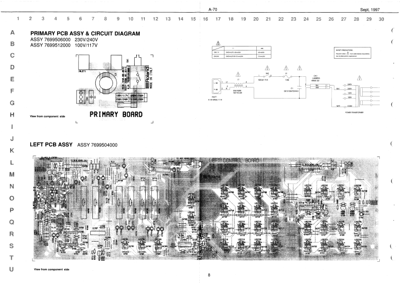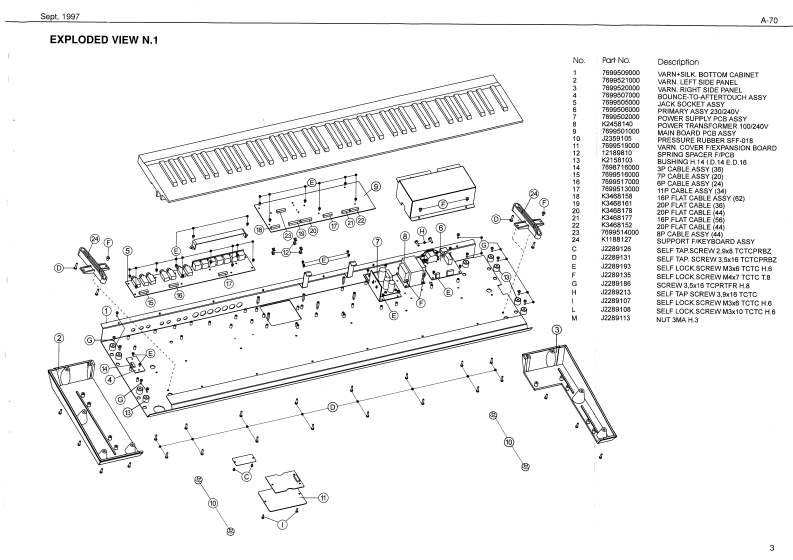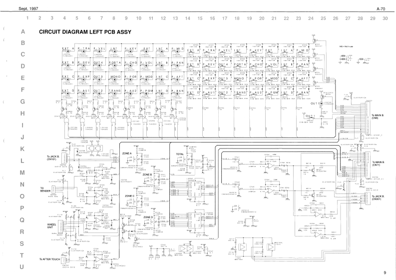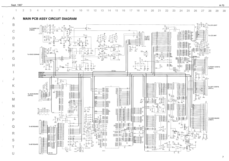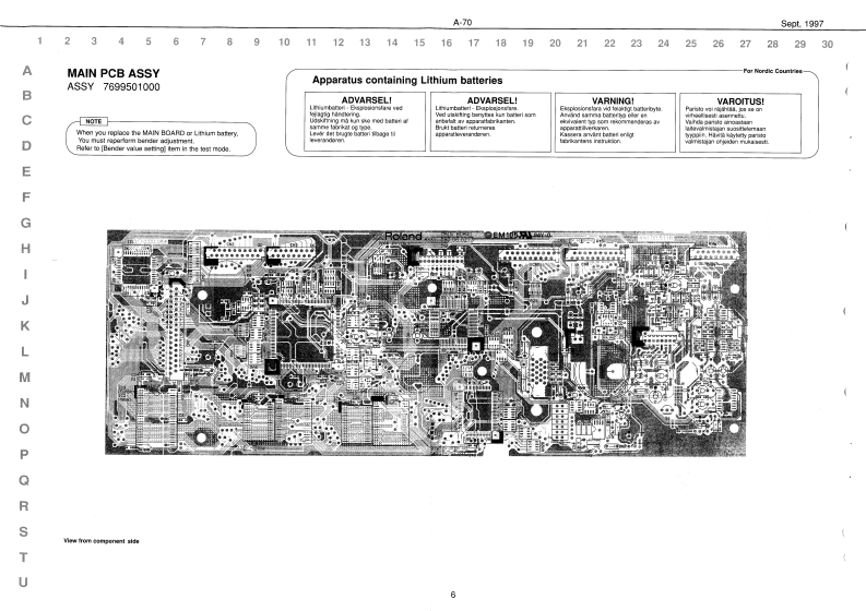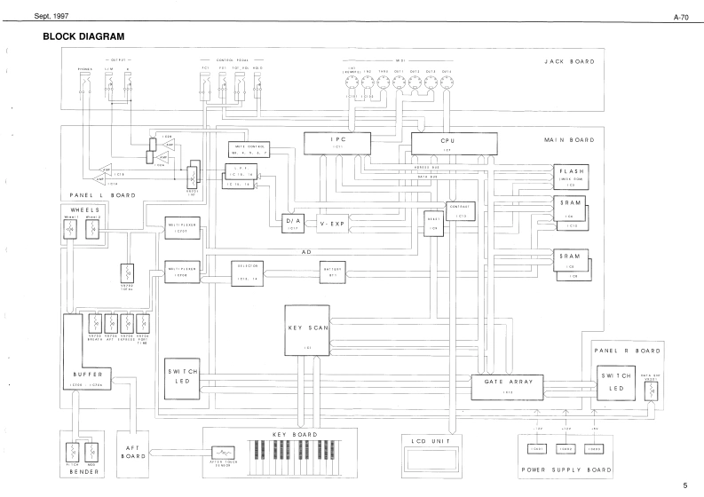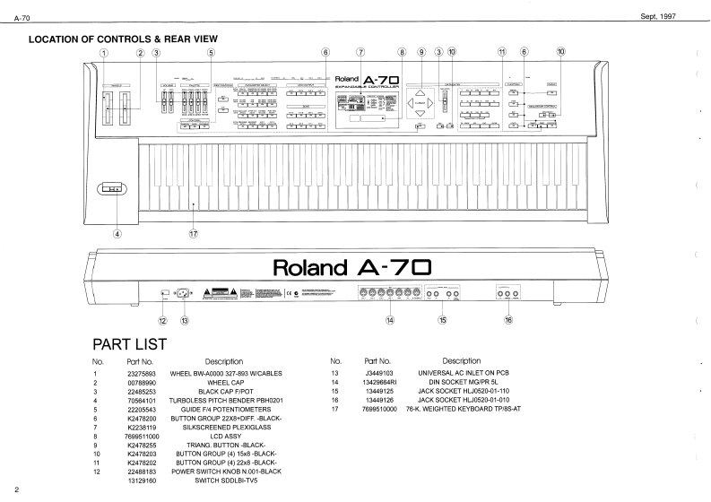 Sept.1997A70A-7▣SERVICE NOTESSPECIFICATIONSA-73A-TOEX camtrollerFirst EditionA-2EX Soard Sectian IVE-nDI)EXPA▣ABLE C口NT口LLEIssued by RESun Palppho用,【fectoTABLE OF CONTENTSPageSPECIFICATIONS:中ae作DISASSEMBLYLOCATION OF CONTROLS REAR VIEWEXPLODED VIEW N13.20n神EXPLODED VIEW N24KEYBOARD PARTS LIST4P1得at Nare Na:7EBLOCK DIAGRAMMAIN PCB ASSY67.DisptayCIRCUIT DIAGRAM(MAIN PCB ASSY)7CtB.2 Line (back老LGPRIMARY PCB ASSY CIRCUIT DIAGRAMLEFT CONTROL PCB ASSY,n#n华#La4nds4e10 Kabm er OreatetcarnectanCIRCUIT DIAGRAM(LEFT CONTROL PCB ASSY)9AFT PCB ASSY CIRCUIT DIAGRAM10Total Yalurse Pecal JackRIGHT CONTROL PCB ASSY10CIRCUIT DIAGRAM(RIGHT CONTROL PCB ASSY)1AC INet jAC1IB,A02的,e4WPOWER PCB ASSY CIRCUIT DIAGRAM2MIDI PCB ASSY2.Diterslons1245w夏371可溪38得CIRCUIT DIAGRAM (MIDI PCB ASSY)3量e妇t:AEE程36rw行RIGHT CONTACT PCB ASSY WRUBBER CONTACT CIRCUIT DIAGRAM14LEFT CONTACT PCB ASSY WRUBBER CONTACT CIRCUIT DIAGRAM14TEST MODE1520PARTS LIST2021M时5CaEC0545034TRANSLATION FROM ENGLISH INTO JAPANESE2227e4o神e3a9时n第h3ardDISASSEMBLYRolandSN00018K6018299Printed in ltaly (AFOO](AD)1Copyrght 1997 by ROLAND CORPORATON