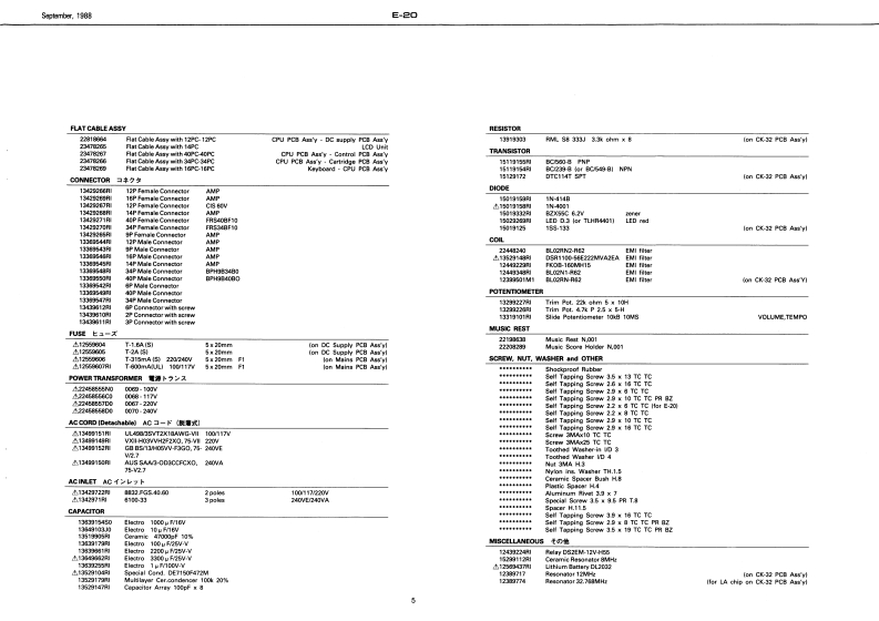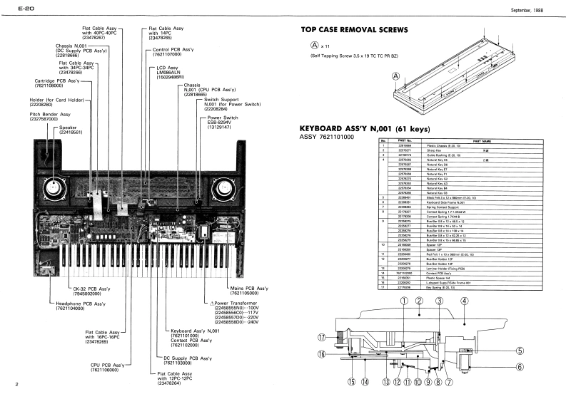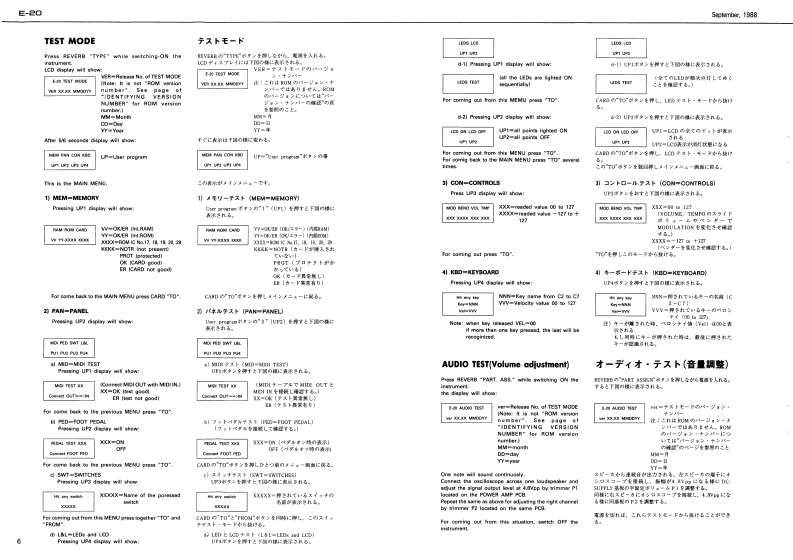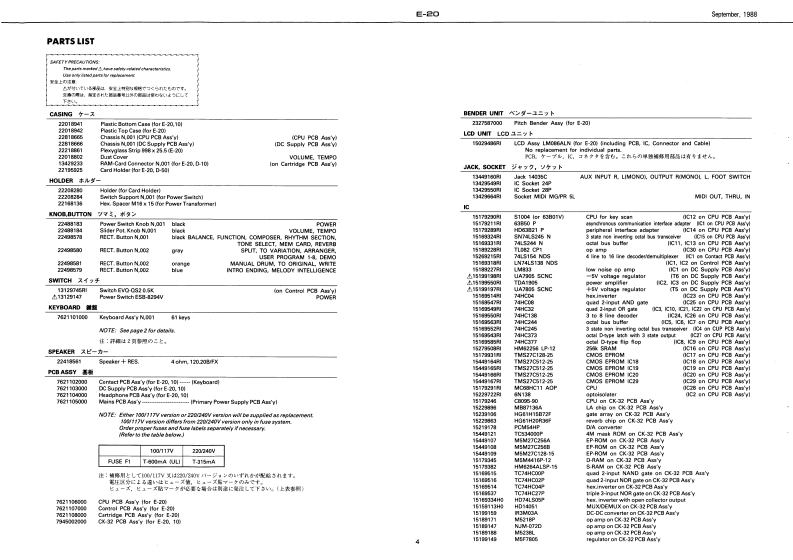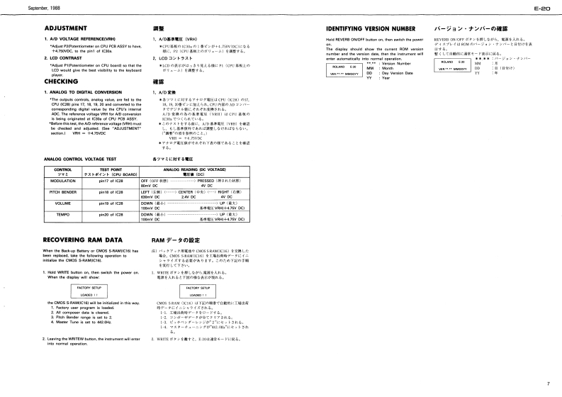 Seclrber,1g6阅E20E-己▣SERVICE NOTESTABLE OF CONTENTS目次PageEXP阳ODED VIEW分解区2First EditionKEYBOARD健啦2BLOCK DAGRAMSPECIFICATIONSERRATA SUPPLEMENT is attached at the end of the page.7口y夕区3最夏正表&追加情多生寸,PARTS LIST-Y)45ADJUSTMENT/CHECKING调整·准固6TEST MODE于又卜毛一F6,7CPU PCB ASS'YCPU蒸板89CK-32 PCB ASSYCK32板1011CONTROL PCB ASS'Y3卜口一儿蒸餐1213CARTRIDGE PCB ASS'Y力一卜少基匠12,13CONTACT PCB ASS'Y了夕夕卜基板13DC SUPPLY PCB ASSY重源&下一ブ基垢MAINS PCB ASS'Y一次侧量添基医14HEADPHONE PCB ASS'Y八?下本基板IC DATA10宁-15n001cCard Holder221625句1224周10Powur SwitchHoler (or Card Holderl2分00河00E5B8294VRAM-Card Connestor113147Socket MiDN.001Swieh SupportMGPR 5L1319211N.001C13429G4R刚122418561川222082841PCB As'y点115029485H29Roland E-己▣17521101000月sk.0 attom Cas8220189411小ck10011722WI28esl14035CPtch Bender Assy7,FG54060(14阁168用1232580e011342972280240VE/240VA [3poles8100-1313429721R01224967N.001 Iblack224间18133191fRect Bucton41312745R月.日u1on%.E2由aN.0022249g579111501912249RolandPrinted in Jspan Al-2 ICR)