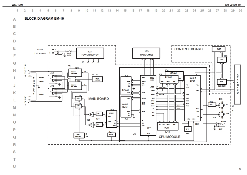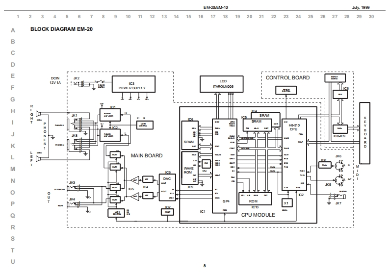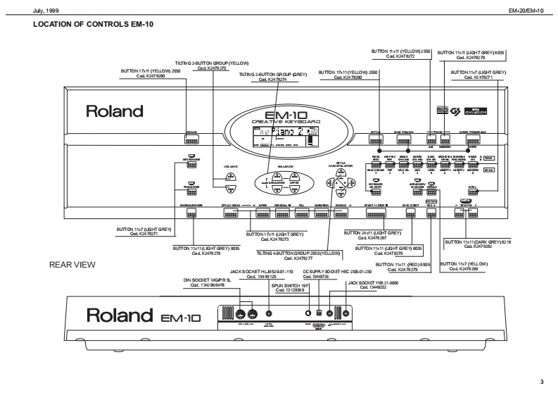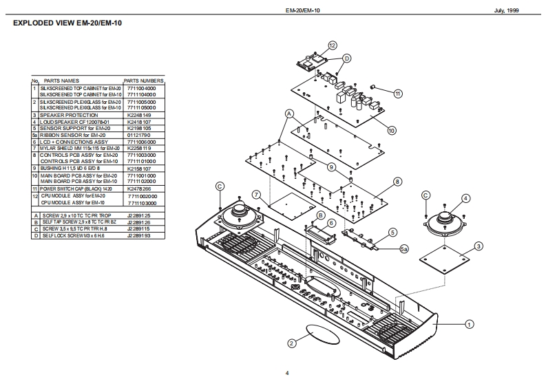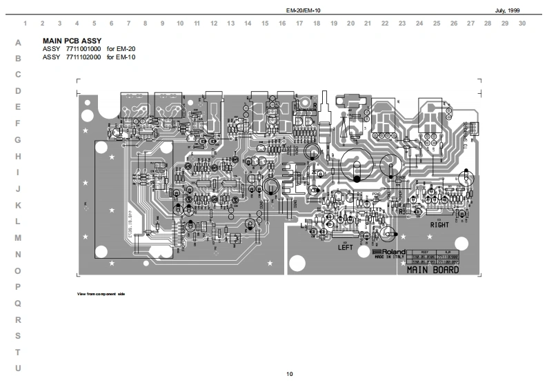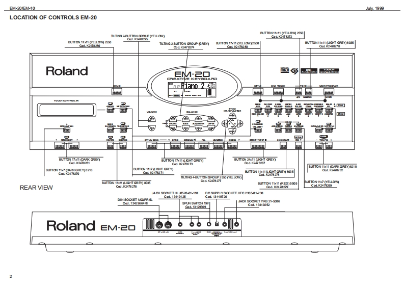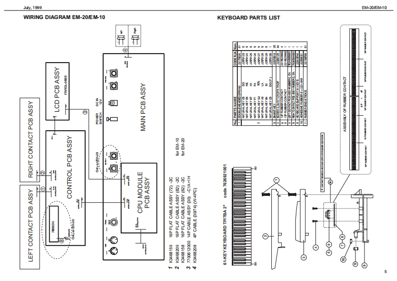 %1999日M-20EM10EM-己▣/EM-1▣SERVICE NOTESSpecificationsEM-20EM.10CREATIVE KEY日▣A▣Issued by RES61-框Y61-框YTOUCH红WaI/E KEYDOARDTOUCHSENSITIE KEYDOARDTOLCH CONTROLLER Rbbon Conirolar)TABLE OF CONTENTSPageTWO TRACK ROCORDER (nd TrackgTWO TRACK ROCORDER (nd TracigCLT5TOM口LwBACKLIT CLSTOM DISPLAYSPECIFICATIONS2x5 WRMS OUTPUT POWER2x】W5 OUTPUT POWERLOCATION OF CONTROLS BM-202造L红RPR0特M造5■RPR▣RwMLOCATION OF CONTROLS EM-104 BALANCES24LNC区3RC/E风&C0R5tdCHOR5RCR面thEPL00EDEW日M-20日M10MELOOY INT回山区M,Rp码WLOOYIRL山TWIRNG DIAGRAM日M-20EM10■8SN口R5ONKEYBOARD PARTS LISTC∠NR月ON &50.NC5C∠CR月ION &SOUND5PARTS LIST EM20VEM-10En24 VOICES POLYPHONYMVOICESPOLYPIONYBLOCK DIAGRAM(日M-20甲16T机RFA对56 VLLmMRAL FART止54 TONES AND 12 DRUM KITS2 STONES AND9C风MKTSBLOCK DIAGRAM(日M-]Tonaa-PCM Sa年kag(INO PCM Sa年a0MAN PC8A8SY日M-20EM010GN-GS COMFATOLEGGS OOMPATDLEORCUIT DAGRAM MAINPCB ASSY (EM20)11STLDSTYLCORCUIT DAGRAM MAINPCB ASSY (EM10)64 STYLES ONROM64STYLES ONRONOPU PCB ASSY EM-20VEM-1013STrLE MANFULAT OR (Style Morphing+ye Progeaalon)TYLE MAN凡OR=Mophing2hPaORCUIT DIAGRAM CPU PCB ASSY (BM-20)14MODEMOCEORCUIT DAGRAM CPU PC8AS9Y(日M-1间15Aranger,Orgn M.DrumArranger/M.Drumm00NTR0P088SY日M-20168 ONE TOUCHfor euch atyleORCUIT DAGRAM CONTROLPCB ASSY (EM20)通ONE TOUCHfor each00R0PG8AgSY日M-108CONTROLL ERSORCUIT DAGRAM CONTROLPCB ASSY (EM10)19PT@H正E工R-MOC灯ON SWTCHESTOLNERGHT CONTACT PCB ASSY WRUBBER CONTACT CIROUIT DIAGRAM20CGT风VOLELEFT CONTACT PCB ASSY WRUBBER CONTACT CRCUIT DAGRAM20CONMDCTOMS0Cn05TEST MODE212REAR POWERSWITORCARPOWERSWITCHCK OUT PUT (Lhono-同AUSTANFOOT SMTCH5BT4 NFOOT SMTC同ARCP0r5a川2x,CA受■C口rA受■9口52VCON-OUTMCO N-OUT0POWER SUPPLY tV 0mA ACN Adaptor 0V)For he oher voltageae on p果TDI DNSIONS■W,50执5920x0Px1通0)m200WMx30@)x1通0)mWEICHTWOCT.0 KgT00向ACCES SORIESAC工50时S5ed址s on page7DISASSEMBLY■学面卫日SCREW 2,9X13 TC TC PR TROP COD.J2289130Copyight 1999 by ROLAND CORPORATIONRolandSN00029K018357Printed in ltaly (AC00)(AD)