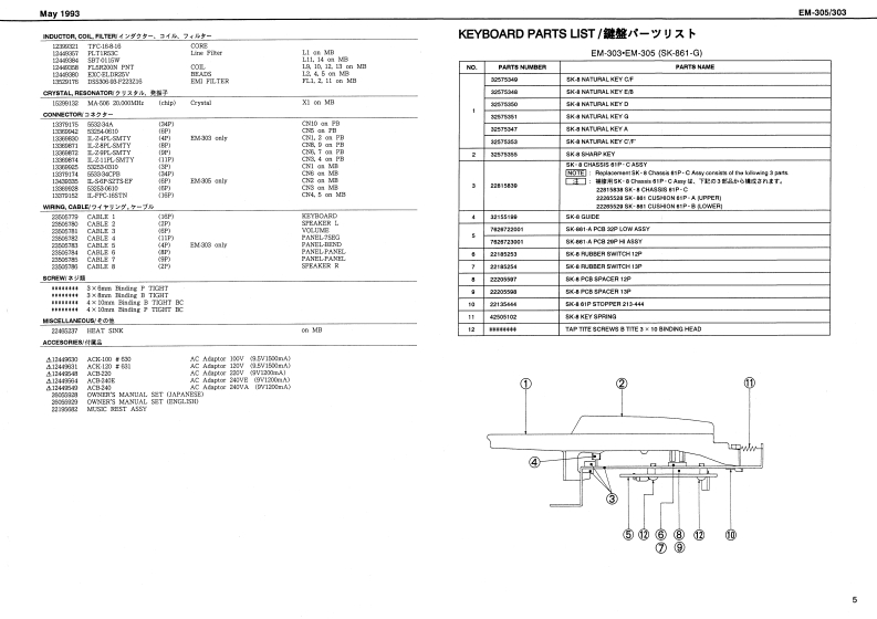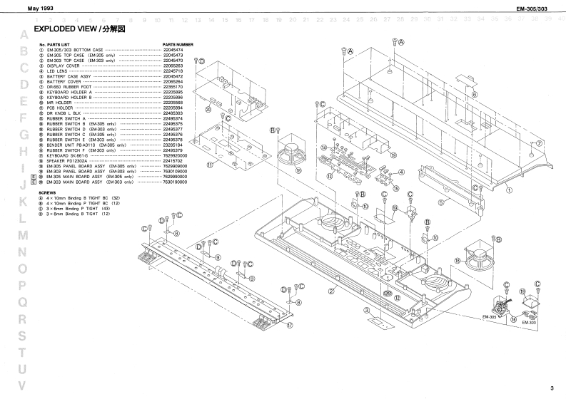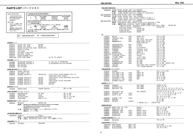 My1993EM-305/303EM-3▣5/SERVICE NOTESSPECIFICATIONS/仕樣EA-百口B●K的8d量指……1风时y81里(风曰子4一特8)First Edition●5end8U8a音源44a:111a11411a11a1i1111m11t1nt1:元+下INTELLIGENT SYNTHESIZER垂国titun Pelyphot量大网4星鲁8H2yekN24香●urber of tonas音色数-4444444444444u4e441114:rel-saecia:25zr0aC克重家:2程者表Dn值向hcyY卡与A:七g卡B七,卜【天夕4EkTABLE OF CONTENTS目次Page圣战引娇e内家ia一9,夕:又◆易-:6组科天步4SPECIFICATIONS仕檬●lacordar使4-35omyW门-岁一0使日-50办1=*-110h1+号g夕PANEL民末儿图2EXPLODED VIEW的和0节A特g6cew2捷日边门料G0音3●Da97(又f:444 411181 1AE1011m1ii11u:3T-er LEDO4T女岁xy卡LEDPARTS LIST=夕刂又卜…45--PHONES.OUTPUT L [MONONR PEDAL HOLD.DC IN MICI INOUTKEYBOARD PARTS LIST键蟹(一y少又卜●534天E-方1m111r1==+1气通w0012时x君7梦1N室2KEY DISASSEMBLY键整分粮手厢44446.7●0dapV究精进力:5Wx量IDENTIFYING VERSION NUMBER《一梦a十代一心隆恩方法.E面4别代)TEST MODE于又h毛一N111111111t48一10BLOCK DIAGRAMブ口岁夕网CIRCUIT BOARD (MAIN)基板回MAN)4-44w150x4700号n寸mW和U重量t11111n11=1+t==4=*=+74g1国CIRCUIT DIAGRAN (MAIN)巨路☒(MAIN)040144444444404444444444444444413CIRCUIT BOARD (PANEL】基板因(PANEL)CX.1009-12440630CIRCUIT DIAGRAN (PANEL)目路图《PANEL)15C-12023W1d4C1卡卡带考数方有物1月数1月数有1非月卡1非1■非4单CIRCUIT BOARD(KEYBOARD)基板☒《KEYBOARD)16C820229-124455484444444444=440ACB-Q40E 240V124465e4CIRCUIT DIAGRAN (KEYBOARD)回路☒(KEYBOARD)99=919911171916C自40231244654254552Ownar's Maranl aet [Englth侵锅明英文780596.6Musig sost Ae相置立t122552●Cto1a别品Pedal gwich代+x卡,乎0P20Cerrecon coblanl装想夺=ブA严-1MDLEDSDDWA Keytop(13417到22413CW-303:22447[Rear Panel]leck (smole内"BchE4305303日2有5734SDDWA-1367A1344113126125.-DC JackYF51-5000HGaa5-01-0420921244b23月门44p248K6510F79-0:EM305019s690cc0Roland17059703Printed in Japan (DP)AGED 1Copyright C 103 by ROLAND OORPORATION