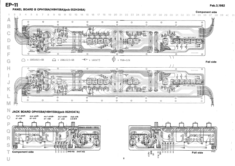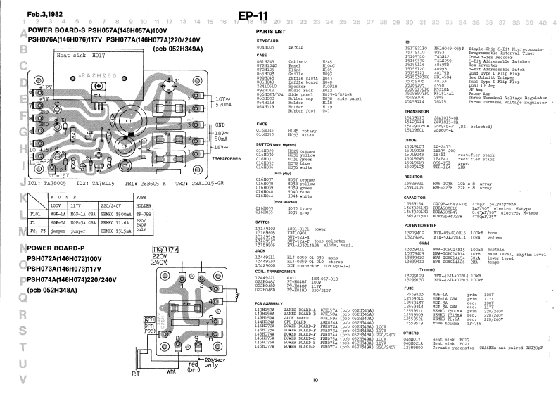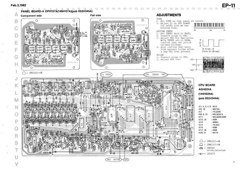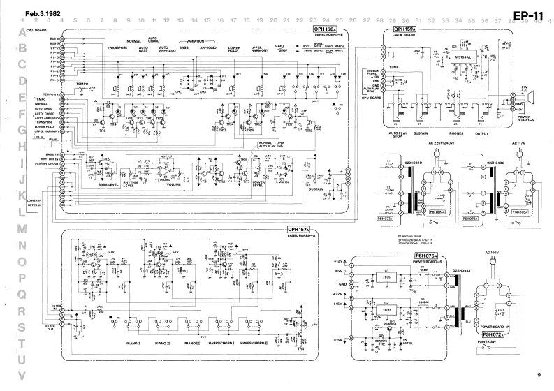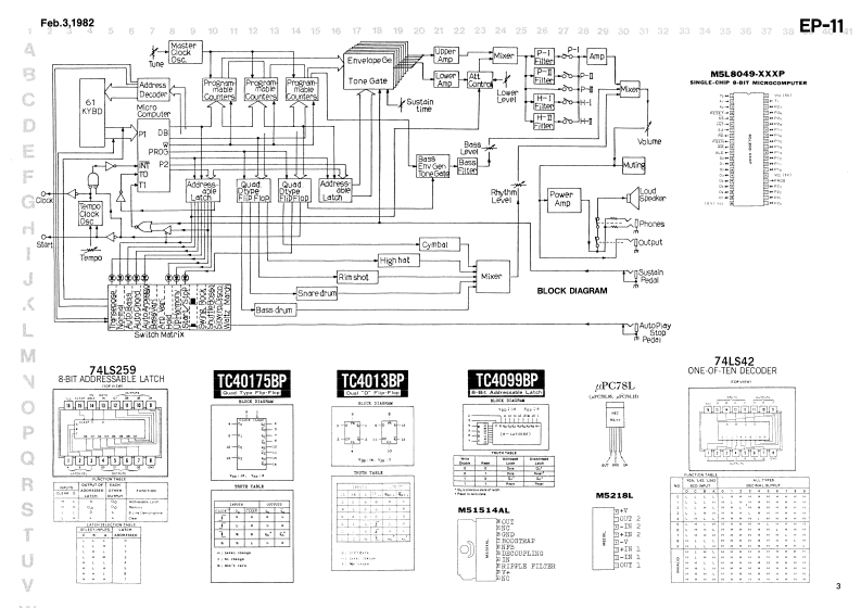 Feb.3,1982EP-11EP-11SERVICE NOTESFirst EditionSPECIFICATIONSKeyboard---61k%,50sPower Consumption ..15 wattsSpeaker ..........10 em,2 wattsDimersions...9120W×115Ml×32501mmHeadphone Jack......8 ohms,sterei-.9.2kCebint H745 1031H3451POMER BOARD (See Pans LimTunable range---.-,-·生0 cents爱联桥器究等.edeg◆5AcM10021Th3黑t012敏H斜11108th8P62LT11312427列h时torw行L与OPOWER DOARDS ISe Part LinlPH134G帕2H09X:Self Tapping3×6mmround wssherO:4x6mmtu移⊙-:3x 16mm flat:Rubber Cap H038 1068H038)o电34帮DneH64gA.gVA-T04G14相15100d111330411EVA.TOHCN4A2A131411Pet.EVA.TOHES4k1a1B陆N15】1b406Ao1.FVATOHC14R14 104R T13330400l91.EVA-TOHCI4AS41hV4A00C44GA1315g0509E-561B《004305》E B Y S O A R DPART34AH机029月0143种0421t0NO JAR2 NO CEBCRIPIIOSNO PART ODK5CRIPTICN1106H326 Navaral key c 7701044Contaot leof三441106H227Natural key·B0m051BusbareP51DNa4wcTC0250-1-4G13361106H028 Nataral key 30刀o54SusbarSP541 106H029 Natural key549c078viteh tit 12?初1.EVH0T451516008132kMLU0E001010I124451W1 Natural key0439809Svitch uit 13P特1105Hmatu1k0"T10064093Dusbor holder92】2105032%arp key b1e11062☑024Gha8男1鄂racketH24307029置47Fr1=g9129aC6Xey atopper6406106A4aa1n95A15052H283-5 Matrix board203-550604Gadebaing414107H5959Roland(HAR,1885E-2)Printed in与P的AH216101丑41Lere1fe1t1141