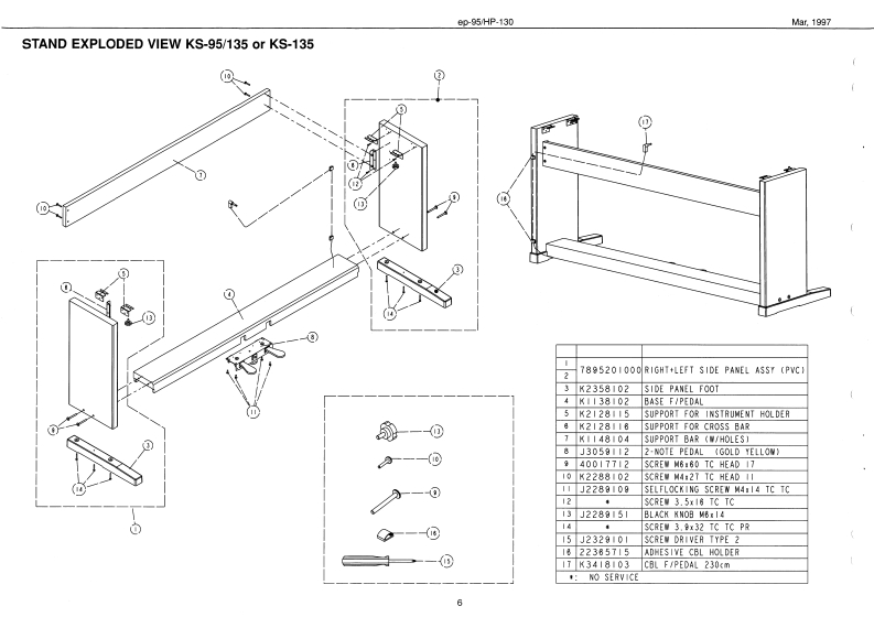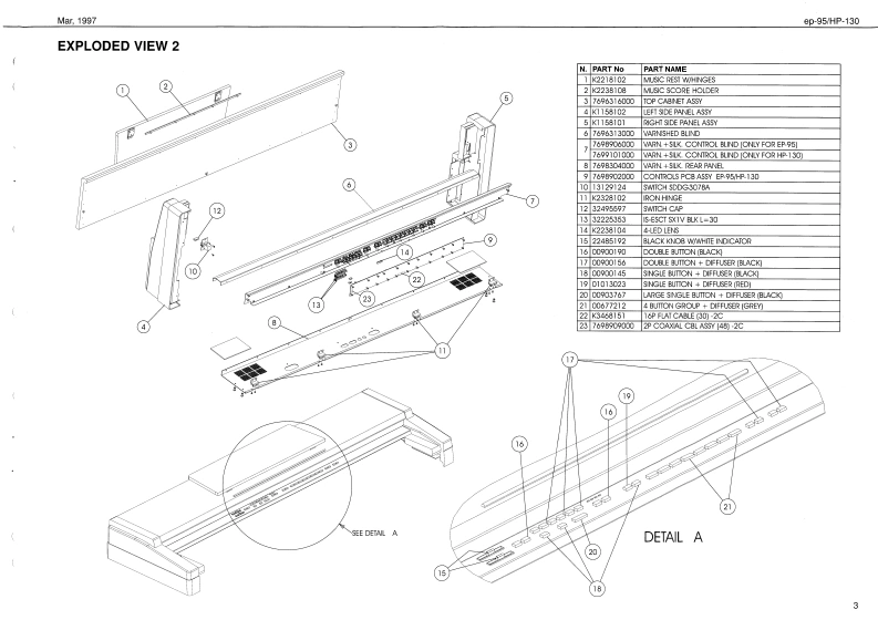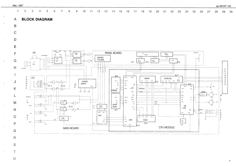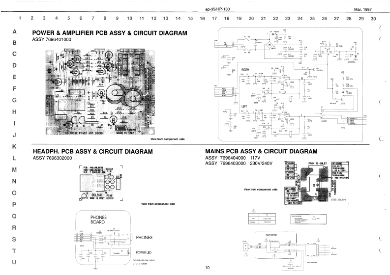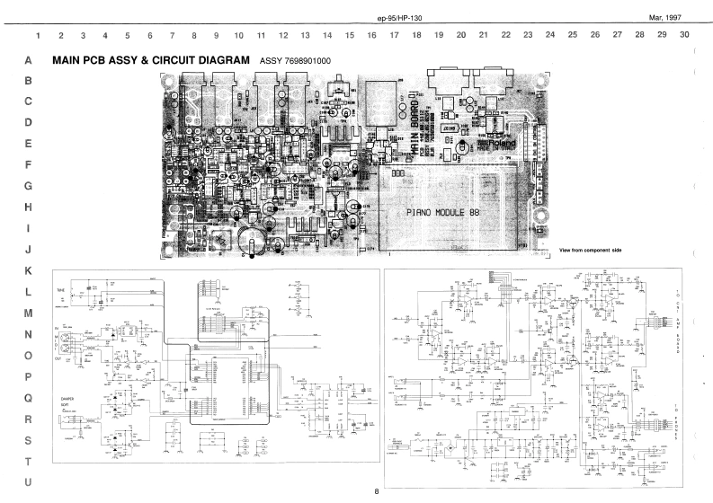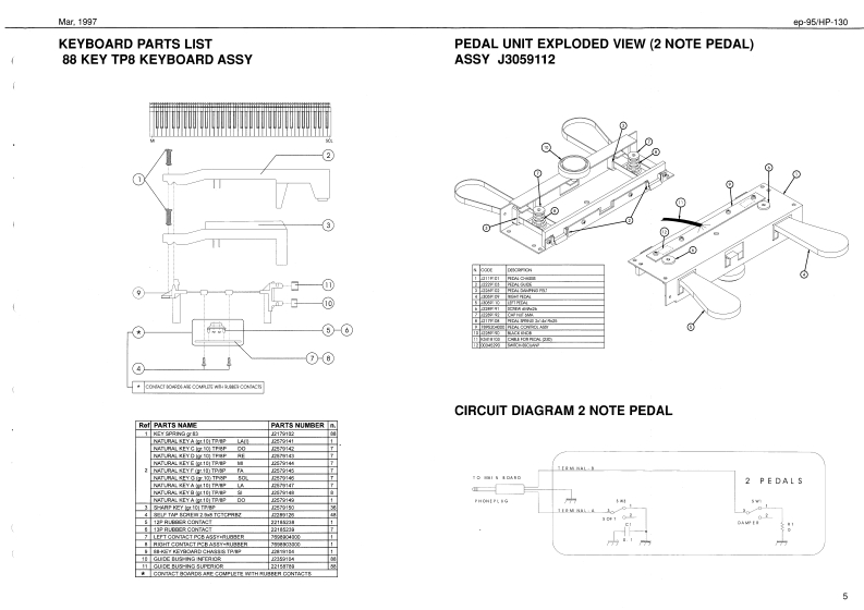 Mar,1837ep95HP.130e0.95SPECIFICATIONSDIGITAL PIANOSERVICE NOTESFirst Edition-Keyboard88 keys,velocity sensitive-Polyiphony28 voicesHP130-Sounda8 selectable via dedicated front-panel buttons (PIANO1,PIANO2.Digital PianoIssued by RES(Only for US market)E.PIANO.VIBRAPHONE.HARPSICHORD.ORGAN.STRINGS.CHOIR].241 Tones +9 Drums Sets (selectable via MIDI)TABLE OF CONTENTSPage-Digital effectsDigital Chorus.Digital Reverb-RecorderSPECIFICATIONSRecords and plays back note and pedal data as well as tempo chan90a.18099±1000n0198】REAR VIEW1.Tuning function±50 conts(TUNE knabEXPLODED VIEW 12.ControlsBRILLIANCE slider (brightne8s).VOLUME slider (global volume).EXPLODED VIEW 23Pianist VOLUME A/buttong,Music Style selection buttons (Ballad.Pop.SI Swing.Swing,日DSaaN,月oek'N Shulfia。SI月ock.Latin,S1PARTS LIST4Waltz.Rag Time),METRONOME (on/otf]button,INTRO/ENDING butKEYBOARD PARTS LISTton,TEMPO/KEY TRANSPOSE A/buttons,KEY START/STOP butPEDAL UNIT EXPLOOED VIEWton,Rocorder REC,PLAY/DEMO buttons.Tone aelection buttonsSTAND EXPLODED VIEW(Piano1.Plano2.E.Piano,Vibraphone,Harpsichord.Organ.StringsChoir).CHORUS,REVERB buttons KEY TOUCH LIGHT/HEAVY bulBLOCK DIAGRAM7tons (Rear panel).TUNE knob.MAIN PCB ASSY CIRCUIT DIAGRAM-FinishSimulated月o5 ewoadCONTROL PCB ASSY CIRCUIT DIAGRAM-ConnectorsAC inlet.MIDI IN/OUT conneators,PEDALIDamper/Soft]jack (stePOWER AMP PCB ASSY CIRCUIT DIAGRAM10reo).INPUT (L/Mono,R)jaoks.OUTPUT (L/R]jacks.PHONES jack(front side).HEADPHONES PCB ASSY CIRCUIT DIAGRAM1016cm x2MAINS PCB ASSY CIRCUIT DIAGRAM10-Oulput power201W2RIGHT CONTACT PCB ASSY WRUBBER CONTACT CIRCUIT DIAGRAM1Dimension:Piano14360×4561D)X176{HmLEFT CONTACT PCB ASSY WRUBBER CONTACT CIRCUIT DIAGRAMStand143610×4561D)x63g4Hm14360×4561D)x814Hm=IDENTIFYING VERSION NUMBER12-WeightPiane:32 Kg.Stand:15.3 KgTEST MODE12/1380W117V0-45W(230/240V1AUDIO TEST1.Supplied aceessoriesKS/135 stand (including pedals)FACTORY SETUPOwnee's.Marual ISP/DUTCH EP85/9513K6018254Owner's.Manual IEDF)EP8515K后01日2mOwner's.Manual IE/SPF)HP-130/EPB50T828MIDI GuideK6D1s160CA9 LE XVILH的VWHF2xn5-VI用233CABLE BS/13005V-FJG 075-V233ECAILE SAA-CA3OCFC 3X0.75-V413499150R0240hCABLE 488/30JT 2X18 NWG-C17343912117vOptionsHeadphone:月H-120,RH-80.月H-20REAR VIEWEMONO印0r453cct2列554STEREO13429824J7101-013010111449263082964oRolandSN00013K60162B1Printed in Haly (AGOD)(AD)1Copyright 1997 by ROLAND CORPORATION