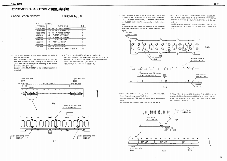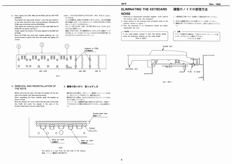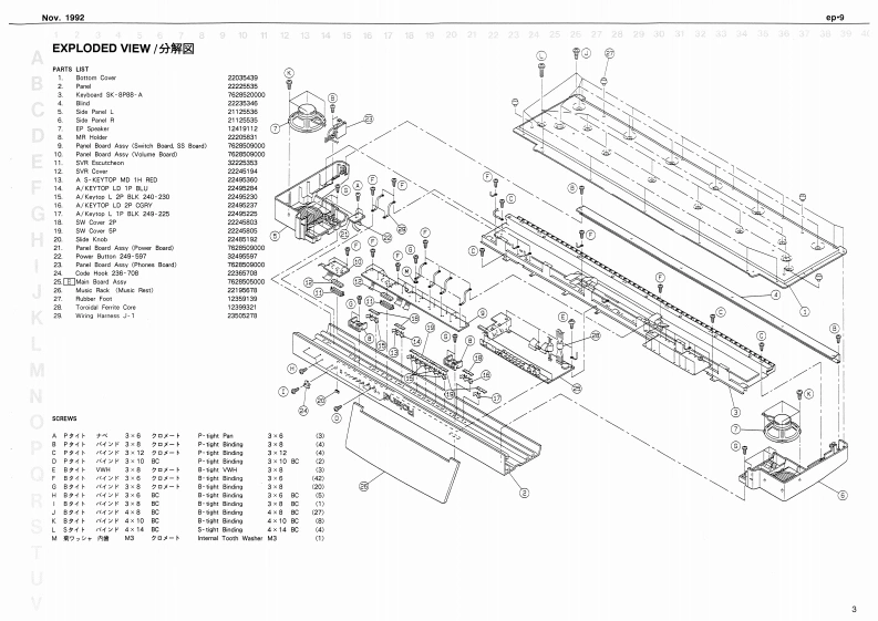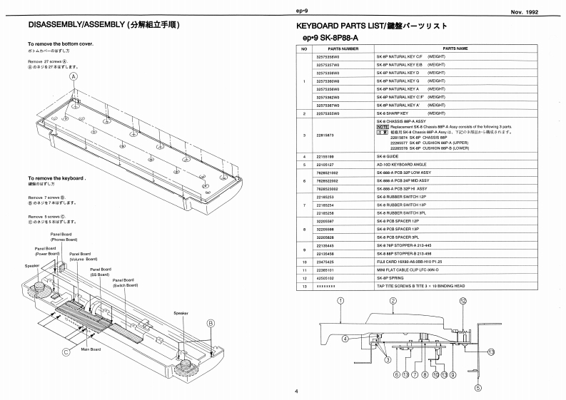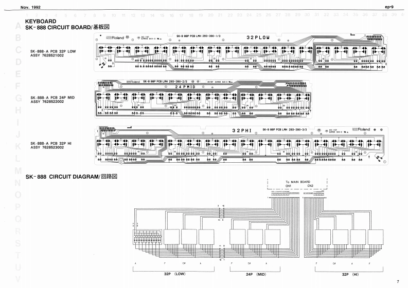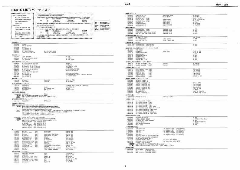 Noy.1992ep9e0.9SERVICE NOTESSPECIFICATIONS./仕樣DIGITAL PIANO1+1m=停s日引s2First Edition0e:8满g量0444444u1离g线00×1eeTABLE OF CONTENTS目次Page4…134Ge城Ds一…=hwt明1“昌0G47SPECIFICATIONS仕样MX·01w1日440LOCATION OF CONTROLS《木儿配置回11111111111””……………2MDCE SELDCT 1-4ACK-100 I20wdered!EXPLODED VIEWa▣2过高线ACTHBIOE B0NDISASSEMBLY/ASSEMBLYD料4Me:过4的sKEYBOARD SK-8P88-ASK86-A1a111,4k图切1PARTS LST0 Sor's Mmad Br llapareye1和OISASSEMBLY点0=个e知rc:EUMNATING THE KEYBOARD NOISE2边/沙撞方法·…·0S5D-城:4-tOROUIT BOARD:4E.S4sB目-A线4口1网LT下8hPARTS LIST队OCK DIAGRATE从4时本gN目DIAGRAMnMAIN BOARDE:Bekr is he灯TA网F样:4国FIC DATA伞过智N生CIRCUIT DIAGRAMMAIN BOARD/DEziol CieuitlVI KCIRCUIT DIAGRAM回☒《MAIN BOARD/Arelee Cle·--·-·I2ISNT /0PANEL BOARD CIRCUIT DIAGRAMPAA整板回七情园:--…13ISWITCH S5.POWER WOLOE.PHONES)ULSMITCH GS POL VELUME ITMEITEST MOOETRDUBLESHOOTINGIDENTIFYING CPU VERSIONRECORDER DATA BACKUP山与一梦一二最音吉打在7一夕功·22DIMENSIONAL OUTLINES FOR SPEAKER/又E一力一D规格☒STAND EP-AK-423PEOAL DP-2PEDAL DP-6以岁儿0P-…24112州量±22州00中3a时Pa四a9L出力看正代=:*+1=1151193提士20Q,480aP0sa0F时ey白deN6n/出力准压波昏样料--:.-…的、t4688H向2对5知0/国蓬0g内1Sooak■5aN有P012200MR Holdar 20120G4124191120122205831)(124191124之153由anLPanel数生他日anl几211255360222595G2112否535》-#13汽Kayboard Amyd9-8阳8-A2223534676201203090Roland17059673Printed in Japan AGE0(DP)1