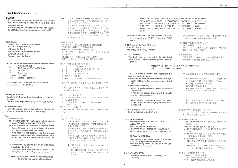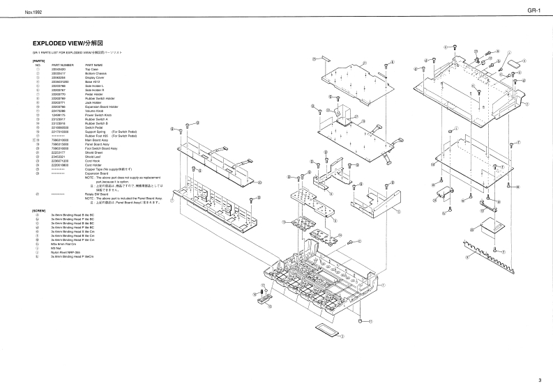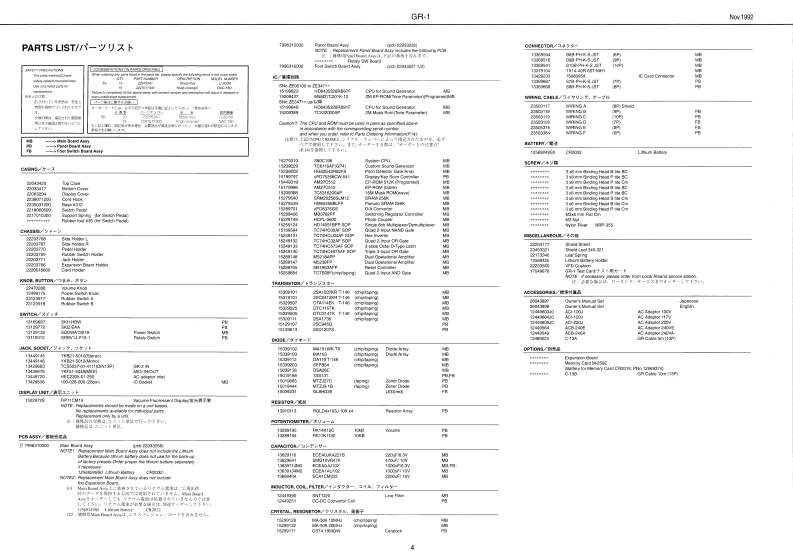 Naw 1000GR-1G只-1SERVICE NOTESFirst EditionGUITAR SYNTHESIZERSPECIFICATIONS/仕模TABLE OF CONTENTS目次Pagea4u-卡4t/·老-8SPECIFCATONS+...仕择111111111111111111111111为nbn Modol子L子1于4代-日图94.4来LOCATION OF CONTROLS .-.-.............../字配道圆……………224694EPLODED........................0LOCKDAGRAM-.-...-.-.-.-.-..............7口77☒………………5.......................e4克工行天用之。之:车,卜纳的DENTIFYING VERSION NUMBER ............Preteur2.LOADIN8 THE FACTORY PRE5 ET DATA·-·-·-·-7下7卜)一·丁)在7卜·于-0口-卡方法…53--7SAVING AND LOADING METHOO OF GR1DATA··子一90也一上口一卡方法…5一7子又卜天-K111111111111111▣B。9内蓝3一学-国5MA0ARDMAW04月D…………………10110st717卡同m400P%NEL0AR0…·PWEL日0AHD12,13·0d儿3tp ret ms,0 TonoeFOOT SWITCH BOARD.....................FCOT SWITCH BOARD...............12.13T0UBE8H00TING…k7ブ儿y1-子y---14PARTS0 ADERING INFORMATION·才-岁-上少注数-144Ts4脚ner多学e银3-yDXP%NSION B04 AD INSTALLING METHOD·工夕天/罗=·末=下DR付方法=====15·n/2e的市特5白a边-F:5:0U3-F4>少为法财2五-0x,72同」4线增c年面3强增分0y身4级直再w劳5,,,的的场年甲74Aff0军年0nC秋0Ao000797y7en3Q48wea2=tn量材国画FNo250686%a1343480n例先星Roland17050984Prined in Japan(AFHOCR)