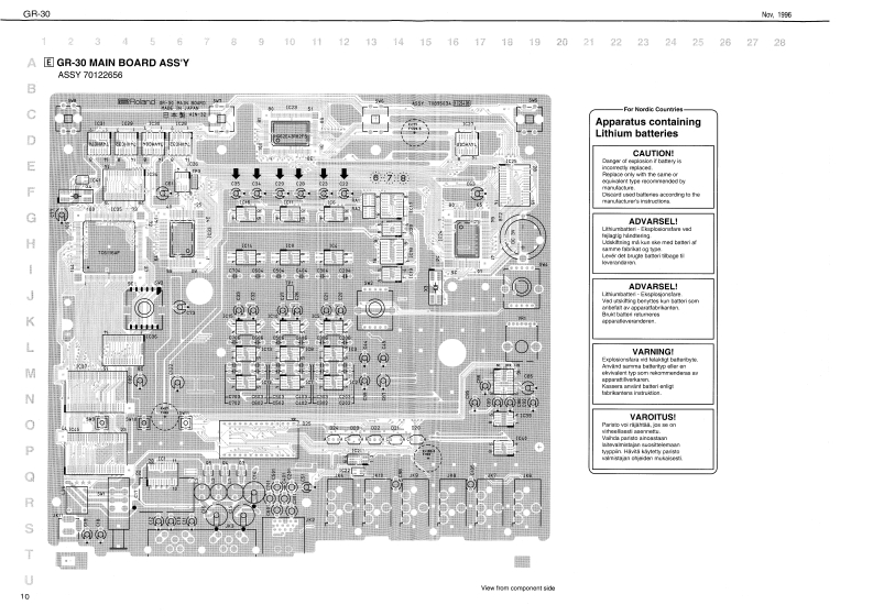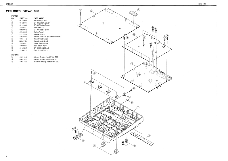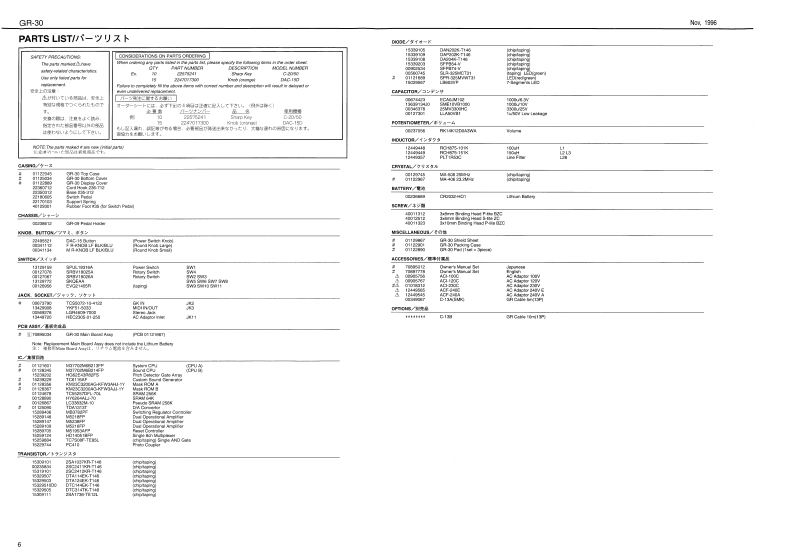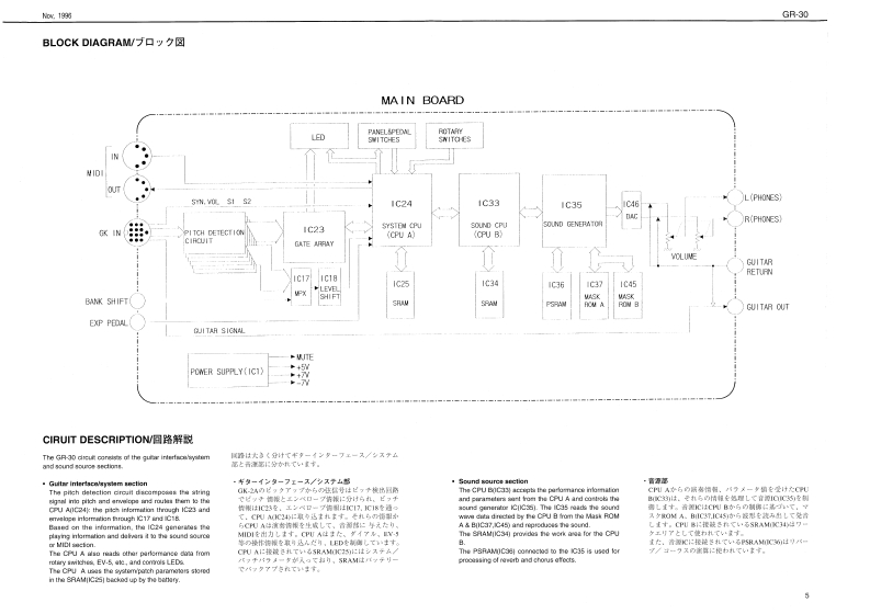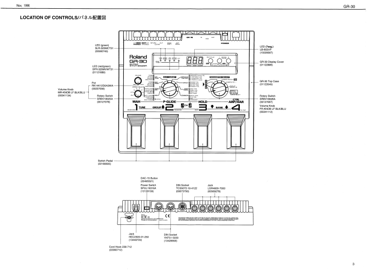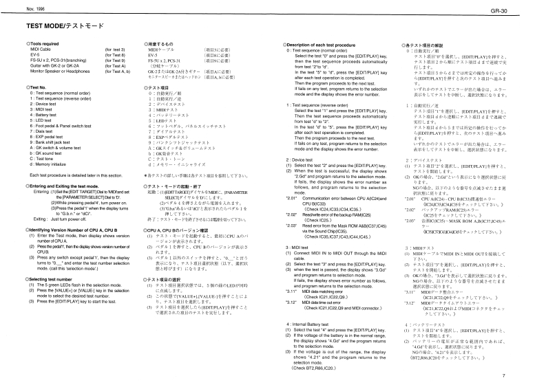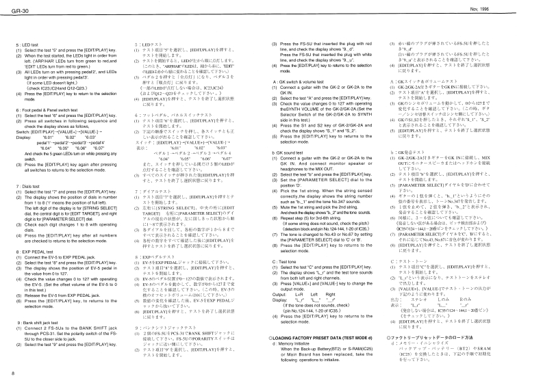 Nov,1996GR-30G只-子口SERVICE NOTESFirst EditionGUITA吊SYNTHESIZERIssued by RJATABLE OF CONTENTS目次PageSPECIFICATIONS…仕樣……2LOCATION OF CONTROLS·/パ礻儿配置☒…3EXPLODED VIEW…分解☒…4BLOCK DIAGRAMブ口y夕☒…5CIRCUIT DESCRIPTION…回路解脱…5PARTS LIST…-y)又卜…6TEST MODE…デ又卜E-ド…7、8LOADING FACTORY PRESET DATA(TEST MODE d)·フT夕卜)-ブy七y卜デ-夕)口-ド方法·8、9DATA SAVE AND LOAD·デ-夕)七-ブ之口-ド方法…9MAIN BOARD……火ボ-ド…1015■Z■■RolandG7日▣m冒骨号臀目胆209AR沿ARRoland17059861Copyright c1996 by ROLAND CORPORATIONPrinted in Japan AFAO(CR)1
