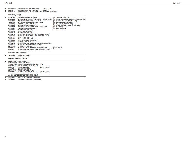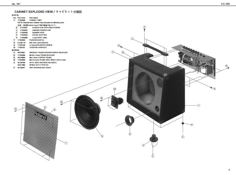De第7KC-100KC-▣▣SERVICE NOTESSPECIFICATIONS/主在仕横First Editionc-004CH MIXING0视为a时ewg0u标d/定格9方Issued by RJA$标kg/天E一力一9方:60N8GKEYB▣AH▣AMPLIFIE7⊙nm1见现y的/手中之来寿1道度多有7:-50u8mhu20超m⊙nmd1阳aT8/手午》来1标草3有子:-50u8mmu-20超m⊙anmd214-208mTABLE OF CONTENTS目次PageSPEC月CAT0S-“”主拿仕模“1Oen0标uLwd/规交旦方业代寿静女LNE0UT/24之77k:+48mPA目LY0UT月来配置@“20超m-077SmmmCABINET EXP00EDEW····车中之名y卜分解园:““3CHASSIS巨XPL00 ED VIEW:之一之分解回40#akg/天心一力一PART兮LT月一7X}5,6:30127x1+Twetor x1........................Centroh/了之卜口-kCIRCUIT DLAGRAM-........:Chinndl 1 MCAINE Vd山mdChinnd 2LNE VdumeChinnd 3LNE VdueLOWTREBLEMasarVCLUVEPOWER SwichCeam cto3/挑提端平Chinndl 1 Irput JackChinnd2 IrputJ业RolandChinndl 3 IrputJackChinndl 4 IrputJackLNE OUT J女PHONES JadOPewer Comump/消食重方:40w0C100060wC1172②0M200O0 mcns/外卷寸法:4782I30043000mm1&-781034016-15160HhmO指中/重量:14g3240k6m8随/付量品Cuner's Mrua (Engih (17055092Cuner's Mrual (lapanme)(1 705503)008/揽品Copyright 1997 by ROLAND CORPORATIONSpeulberStand SS-115AAll rights reserved No part of this publication may be reprodaced in any fom withoutthe writan permission ofSpeakberCp SS-CAP (H1017017)ROLAND CORPORATIONWhen uing an SS-115Aipealber stand,be sure to ue a本害四一帮.儿《仕坐帮花每断t被写·无载有舌二上老北主才,Roland 17059908氟天E一力一天多?F上SS-1154老使同有3摩位.必Prnedn Jpan (CR)ADO 1天一力一寺中字乃S-C0老件同儿t使下3,