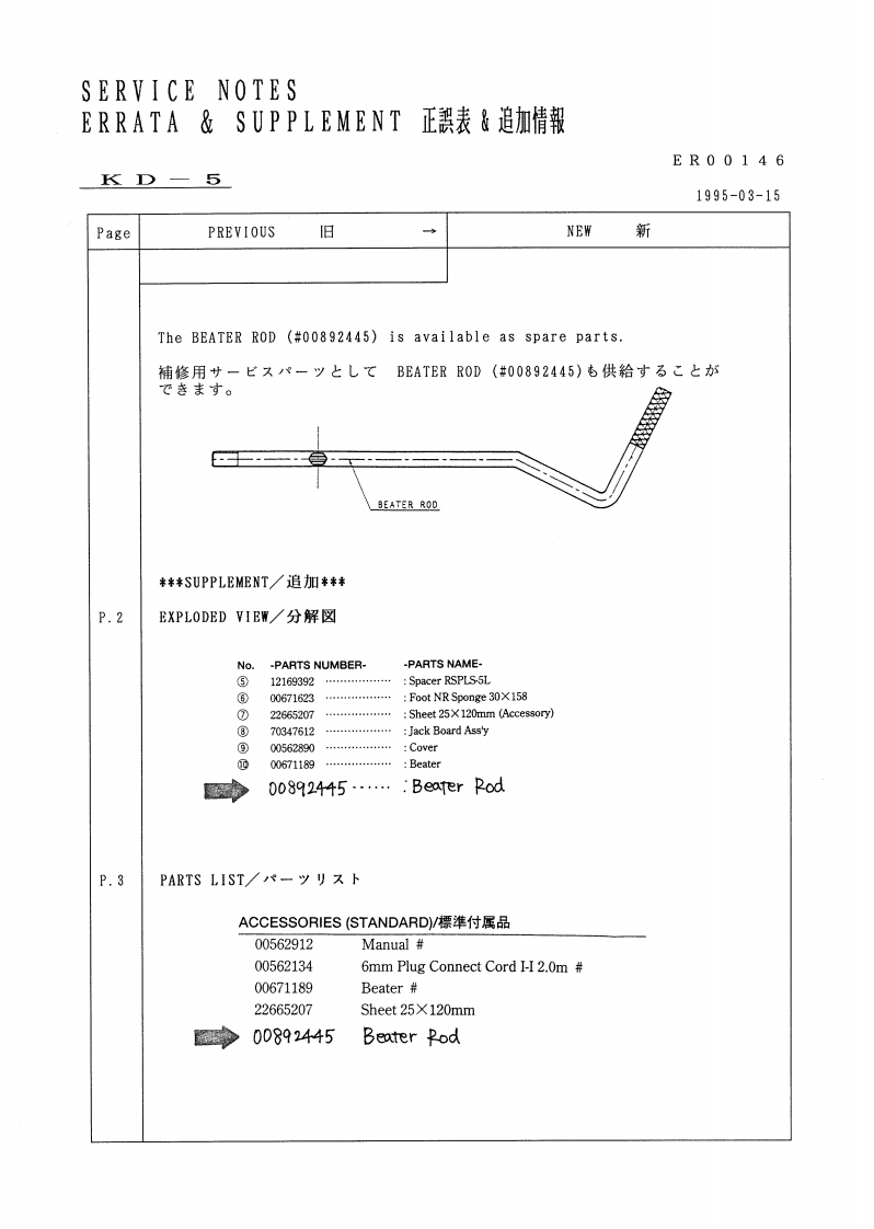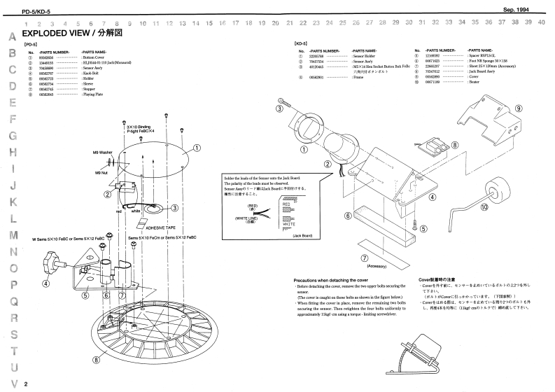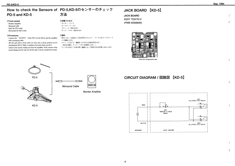 Sap.1994PD-5/KD-5尸口-5/K▣-5SERVICE NOTESSPECIFICATIONS/仕楼MODEL PD-司PA▣KICK TRIGGER UNITFirst Edition●0m13n:22W0×2e×圆0m国装桥ee呼64w)×IL/DX3/L6用+a●w一一:3年TABLE OF CONTENTS目次PageGENERAL MEWFN:20542811SPECIFICATIONS1bern Mag Canect Cord H20m%a2114EXPLODED VIEW2PARTS LIST/-之又卜11919w111m11999=49=*99=49=9*99MODEL KD-5可How to check the Sensera of PD-5 and KD-5P0-5KD-50七之梦-》子工y7方法-4●0ma38一:172M×112①4×100由rJACK BOARD梦与y7求一下【KD-5】一一B卫V1×4/LWx31W1用+mCIRCUIT DIAGRAM●w城一一:1 dacding the beaker)2s lloe (nchdi the berkerlPNe005E822Berr水0切11里UPNE-00662134Shert2X120mn%m23TGENERAL VIEW/概観☒【MODEL:PD-5l[MODEL:KD-6]Roland170659756Primed in Japan AF0D [DP)1CopegM 1994 ly ROLAND DORAORATON