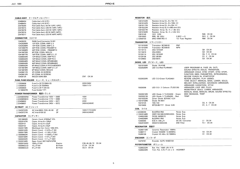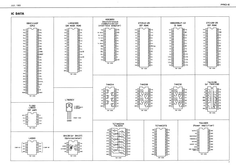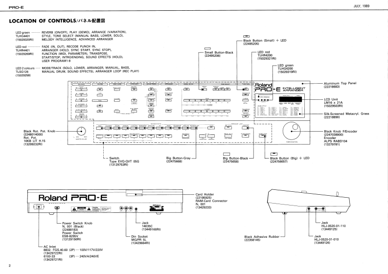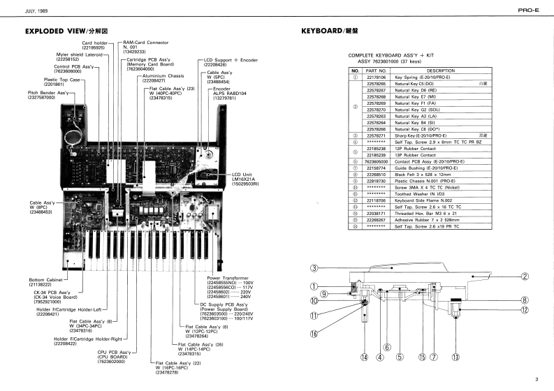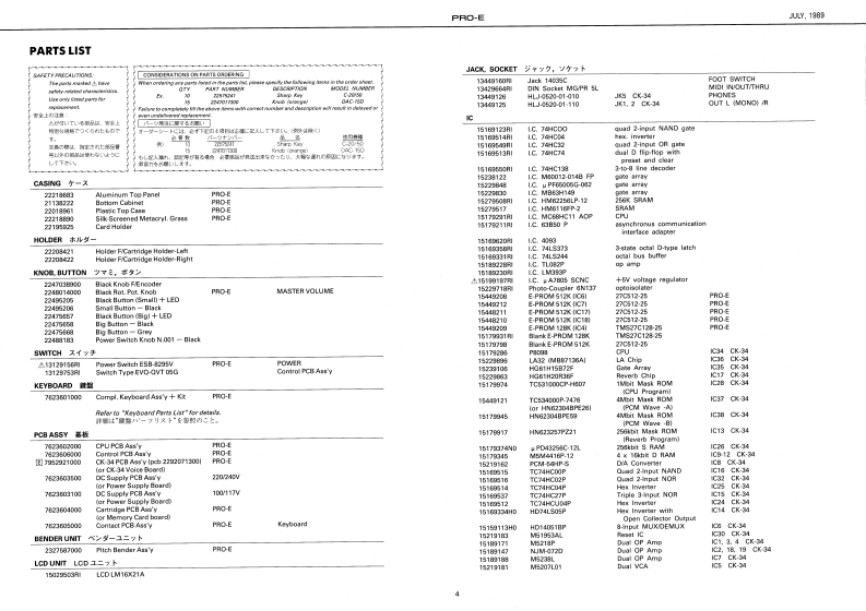 UY,19B图PRO-E尸月▣-ESERVICE NOTESTABLE OF CONTENTS目次PageSPECACATIONS仕摆First EditionDISASSEMBLY分解法INTELLIGENT ARRANGERLOCATION OF CONTROLS代京九配若区2EXPLODED VIEW分娟回SPECIFICATIONSKEYBOARD健超PARTS LIST-y天4-6IC DATA1C学-7-9.语enhTEST MODE于A卜毛一N1011RECOVER刑NG RAM DATARAM罗一9)段定11DENTIFYING VERSION NUMBER代-3·十1-》猫规11ADJUSTMENT时整11CHECKING球经DATA SAVELOAD子=岁也=/口一下12BLOCK DIAGRAM口y2同13CPU PCB ASS'YCPU基酸14.15DC SUPPLY PCB ASS'Y量源&下基板16CK-34 PCB A5S'YCK-34基板15.17CARTRIDGE PCB ASSY IOLDI力-卜)y基板(日)CARTRIDGE PCB ASSY INEWI力一卜)y梦基板(新)17CONTROL PCB ASSY门卜口一基板18.19CONTACT PCB ASSY口夕夕卜基板18.19Silk-Screaned Matacryl Graos222188900Alminium Top PanelPlastie Top Case2221083wDISASSEMBLY/分解法220189611TopC4e月amoval Screws1.@%2(29×16mm,5 crew No2S0990015)2B x 5(29%16mm,Screw No2061329160ABoctom Cabinet211222782360100Pitch Bender Aaay232758700*See poge 2 for detail.Viow from Bottom常辅以2明空影期②二上RolandPrinted in Japan Al-2 1