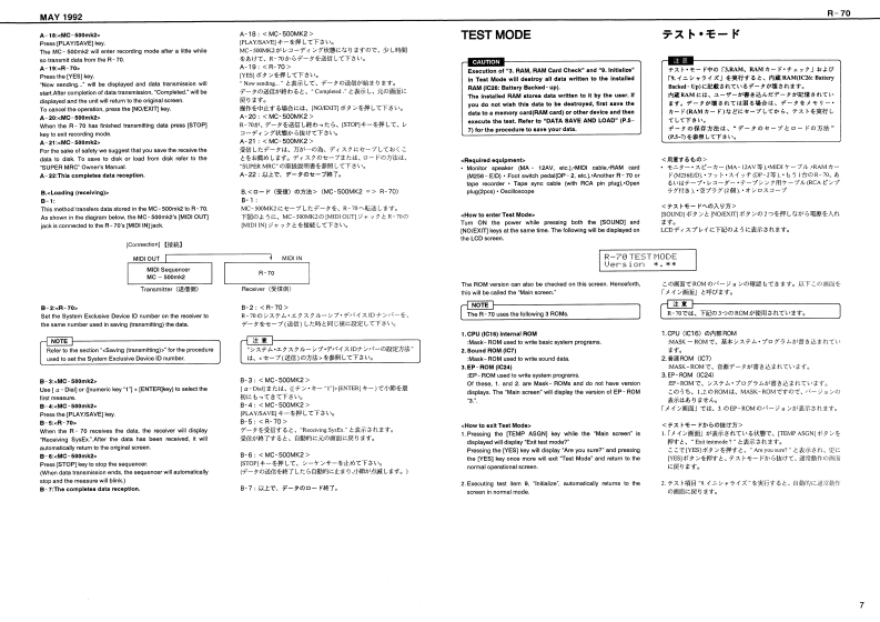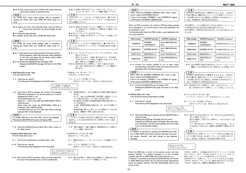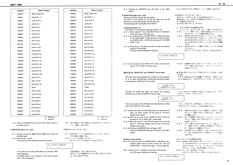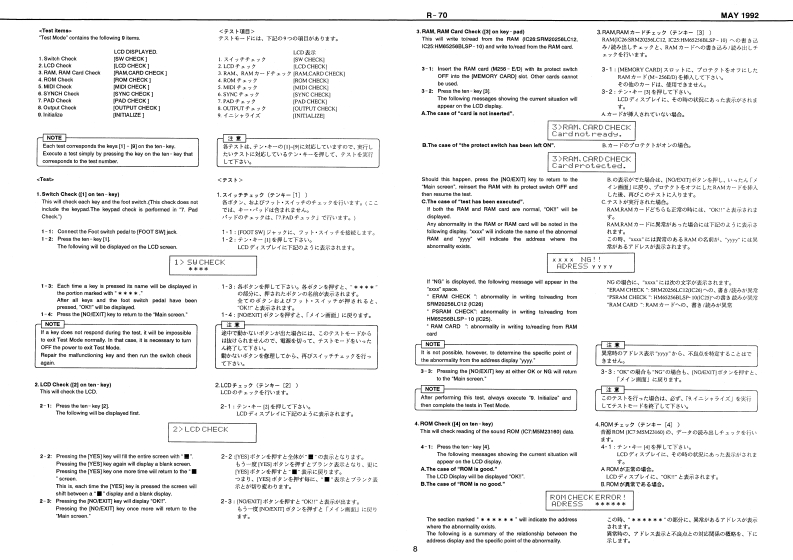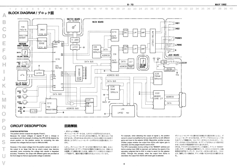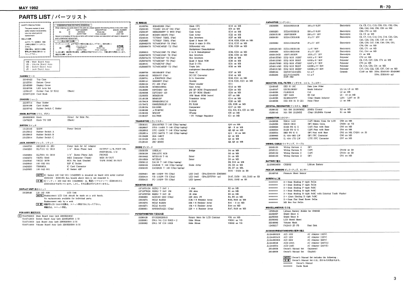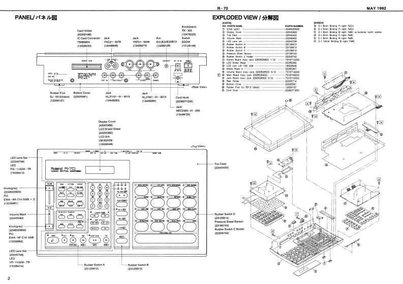 MAY 1992A-70只-7▣HUMANSPECIFICATIONS/仕樣RHYTHMSERVICE NOTESC▣A尸▣sERFirst EditionNursber of Tomes音色数-4444一4i41i1m1m1m:上2特+32伦ywuw3花-看酒}5484w里21w320002a的e1TABLE OF CONTENTS目次Page韩Ck灯nBa颜阅9日y孕网分音村SPECIFICATIONS仕漾449,1●TTp于求-40e20垂D与子手又了f41111111=*-s0 characte得x2ns色c女aC可IC DATAG于-夕4=4=44444444=444444444444448文字美2杆1用¥2号不卡村信儿G0PANEL《末儿网44111151551551551115115115115115155155行2EXPLODED VIEW分☒4=44444144444小2Nolse Leeel/x✉风h-…Lnn-)B心N从C的S5emAa:DOPARTS LIST一学少入卜3●P:4e4/夏海BLOCK DIAGRAM▣?夕因4111111114s40×a-151可关2-a10rcnCIRCUIT DESCRIPTION350×227底。H州mIDENTIFYING VERSION NUMBER一沙▣·十バ一D2方法垂有好性国144/24好LOADING THE FACTORY PRESET DATA7x夕卜月一·寸9也y下D●46#440什属昌Owter's Morol 80mdopaneted;Pthe2091mOwtar's Manu Sa():e280403n口一N0方法DATA SAVE AND LOAD子一夕①北一寸口一时而方法…5-7g-I01uI000-方012g5h5.1249●040TEST MODE于X卜·毛一N97-10A-(11TVA1-2212四0Pe.1240050CIRCUIT BOARD(MAIN)基区(MAN)C8-249A4gh;FW.124052CIRCUIT DIAGRAM(MAIN)回☒(MAN)12ACB-243EP1244CIRCUIT BOARD(SW,JACK.VOLUME)基版区(SW,JACK,VOLUME)13Card M-354ED (RAMICIRCUIT DIAGRAM(SW,JACK,VOLUME)回路☒(SW,JAGX,VOLUME)14Pedal Swich DP-2.FS-BUCHANGE INFORMATIONS蜜更案内0时n.TT5竹APPENDIX付绿IC DATA/ICデ-夕4140T(门1142期Rolond 702e0其0129Roland17059633Printed in Japan AFHO (DP)1Copyright o 19952 by ROLAND OORPORATION