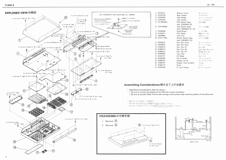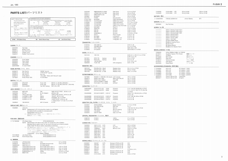 Jan 1903R-8MK I7-日MKISERVICE NOTESHUMAN RHYTHMFirst EditionC▣AP▣SE7TABLE OF CONTENTS目次PageSPECIF1CAT门05---111t1f仕样-11i11111SPECIFICATIONS/仕株L0CA几ON0FC0T月C风81mm11…/早配图回i…-1EXPLODED VIEW-11111t44…Exnenian Podul EAd以00XDA0月AM1t1n1n114。ブ口y7☑4-------…4CIRCUIT DE3C月iPT0N3tm1m1m4:..。可落相u:4---,-:-.,:-.-:-.--.-.-.,5CPUB04月DA3SYr1r1111m1n11u14CPUE0 ARD ASSY---…--·---·6JACK B0ARD A8SY..................JAcK BoARD AsSY-..........-..-.-..........ASWITCH BOARD ASSY........................SWTCH BOARD ASSY7TE3TM00E&ADJUSTEMENT于天卜毛-K.明整-10一140 ENTIFYING VERSION NUMBER·5-a>②w8方法…----…-…13LOA0 ED FACTO0 RY PRESET·工喝出荷畔D子-夕2口一方法…130 ATA SAVE儿0AD11a111444·7-夕0七一ブ之口一方法…14-一16LOCATION OF CONTROLS/Y礻L配置☒LCD UNEOiselly Carr[10O944周225237e218g1A909K1118KB0571-1-1Card重iga Connactor127元8951144P12246511%11345921门1HLU65210100114424108LED2246511例50.2012AA-10K15029251335341)Sockai IMDl常220241113296(132972wHL4306-01-303344KE21-029(1344124785女BwitohLJ2521-1-11D500A31312915049N02E401002E010K的TpA41344913305F119181293918N62E50e00229防214229521802249652145A力SatrhKey Pad AanyEVC33306KEVD-39905.22284111312☒743(13127743Koy Pa Cov2202410Roland17元59883Pt回n Japan (A标段1