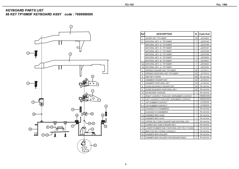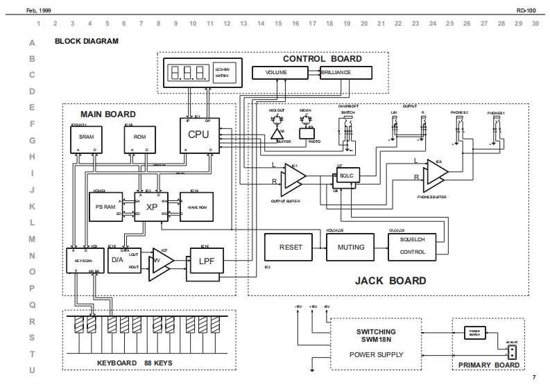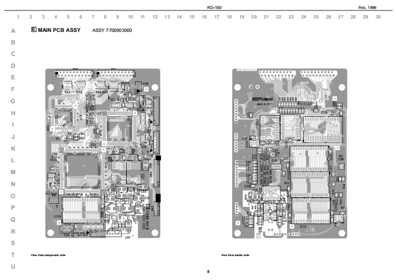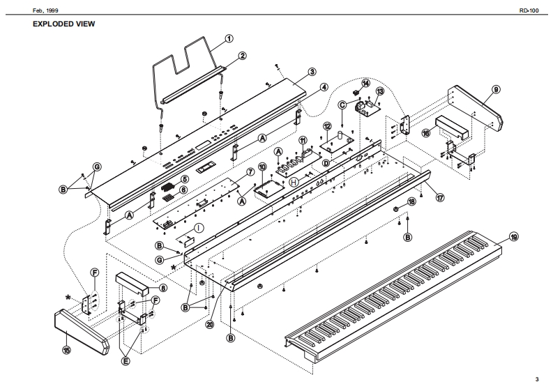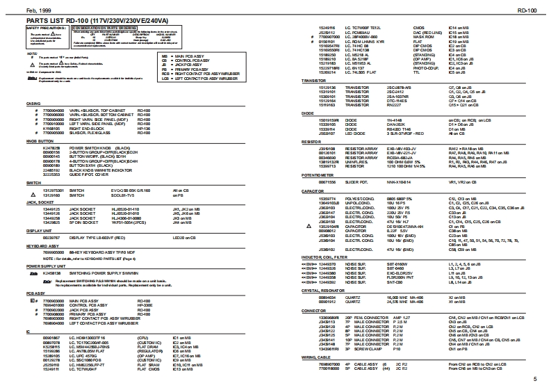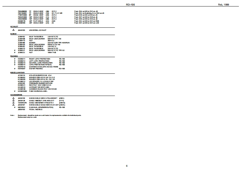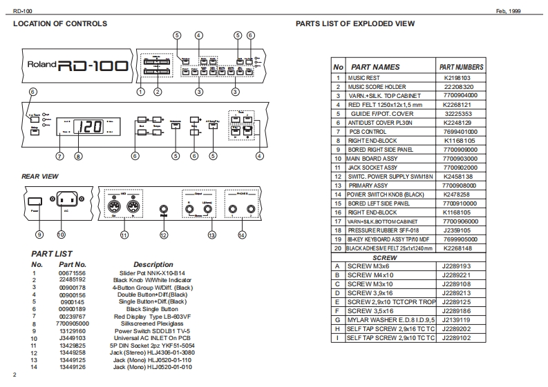 Feh.1999RD-1007▣-1▣▣SERVICE NOTESSpecificationsKg志od.--8图e8▣IGITAL PIAN▣First EditionKeyboard actioe ..........Hammor Action machanismIssued by RESSoud Soue ..----.5刷ae运pdyphonicTones ...................Pianot.Piand2.Harpsichord...Piano2.Pipe Organ Honky Tonk'(inDudl modelD....7-60gmontLED /3 charactorsDiital aeets----------..chons (7 typaslRovort (7 tpes)TABLE OF CONTENTSPage---SPECIFICATIONS1Key Toueh ..............-.3 lovdts (Ligh fodium/Haavy)LOCATION OF CONTROLS23K写Ta华的0-+5 somitones (Keyboard antrybution Entry)EXPLODED VEWSeenoe..Tracks (in Track iting Functimn)Agprox nKEYSOARD PARTS LISTe6ef------.04243Y4445A.64.743868a28a4u出edum0了ev坐Lad justablo tomp0=20-20PARTSLIST5BLOCK DIAGRAM7Dampor30tM0o出lak-o过c边eFED以iaBa80)MAN PCBASSYFh。.........Ehkg0bkORCUT DAGRAM MAINPCBASSY9Power Coesumptboe .......8W (100VL8W(117VL8W(230%240V)PRIMARY PCBASSY&CRCUT DAGRAMD5-------f30x21美36mNM行射0240gCONTROL PCB ASSYORCUT DAGRAM CONTROLPCBASSY0p地5sie rest,MSC saries MD出≤KC sorias kayboard amplra假RH saries head phonJACK PCBASSY12ORCUT DAGRAM JACK PCB ASSY超RGHT CONTACT PCB ASSY WRUESER CONTACT CIRCUT DIAGRAM14LEFT CONTACT PCBASSY WRLBBER CONTACT CRCUIT DAGRAMTEST MODE1516DISASSEMBLYe▣SELFLOCK SCREW MX10 TCTC TFR 9.5 COD.J2289221Copyfght 1999 by ROLAND CORPORATIONRolandSN00027K6018346Printed in ltaly (AC00)(AD)1