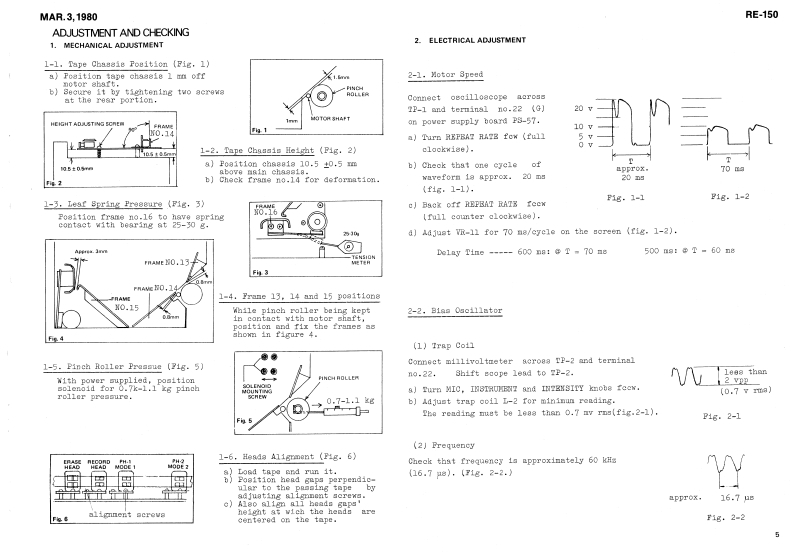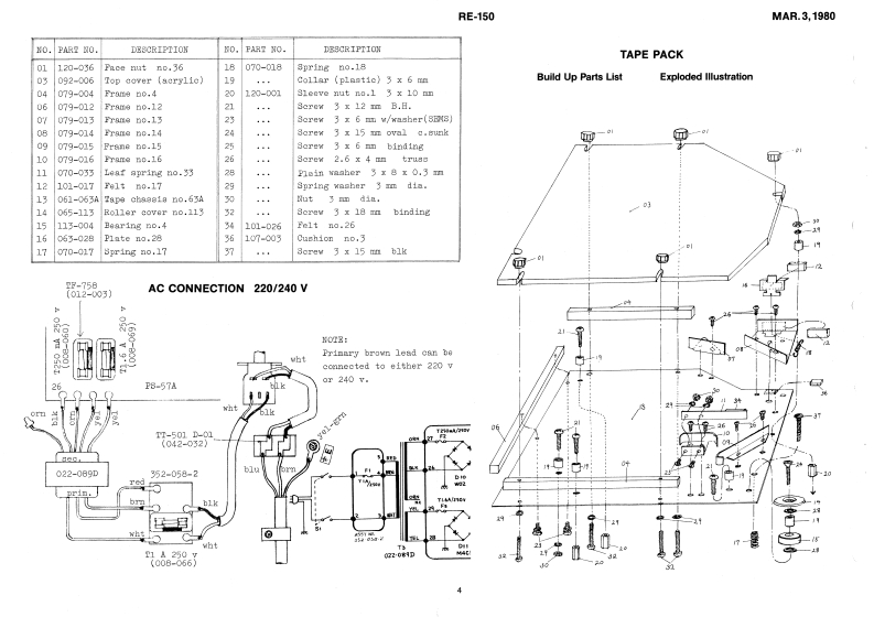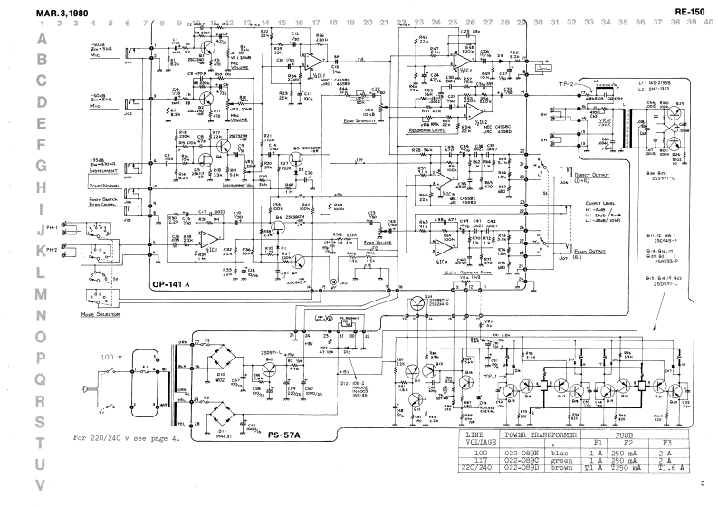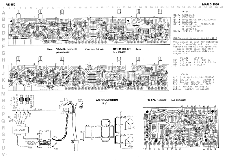 MAR.31980RE-150RE-150SERVICE NOTESRE-150 BLOCK DIAGRAMFirst Edition5 econd Prin6euy121因3E引Input SenaitivityKI0:3.16wmB(-504B】7B10E72:17.8wma〔-354B)Input InpedanceMIC:5 k-ohm:D3U它T1470k-o0Outpuat Level---1:178rπ《-25.d2:M:56.2mvm3{-25B):17:8vmB(-5djLees than 2 k-ohn81gnal/Ko1ae Rat1o-----Better than 60 dBEcho Delay Tine -------60m8-600n8Power Conaumption -----16 watt8D1n8a1n------一-415(w)x185(h)×310(d}延8.26PotontiometereYace serex no.12MIC.INSTRUMENT,ECHO:BVCI3APL5 20 kB(026-478)《125-012}REPRAT AATE:BW0T3AF151kB(026-476)IN2EN8ITY:Y0T3AF1510t5(026-4T7J品2-2a7vitoh3w20463E15(001-281】81 teh SDe5P-c01〔001-156】Knob na.58(016-05e,Button no.9 blk (016-009]Knob no.57日and2eH-15Meter EMT-2410Top panel no,181c86-018)(016-057J《108-004){046-004}Foot 0-9(111-00)Cabinet00,134(081-134》可自过Jack-1-252(009-D05】2监品JackWaaher no.18LED SLP-13185321-1-1red(121-01B】(019-015}(01-018Ma8h8F,019。TJ-23-9rm(12-019)(0c9-008】RolandPrinted in Japan A3 1