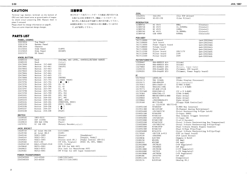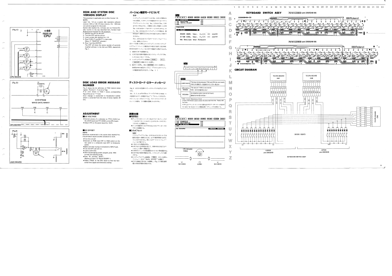 JAN.1987850s-5▣SERVICE NOTESFirs!Edition@@GoQ0雪@SPECIFICATIONS4t起ed:1长程棕翰HOLD/HEC STARTMenory Capscty L Patth sBGL物IaL2356t1表PEDAL EWS0V-5Va我A,是Tcr组,3nkD-aTammi白24A¥GU"ROk TTL ItuN Horironta Frg 15J5KHaMerory Sysltm35400NONOCHNDVE DOVPOSITE IVP-E×T CONTHOLLE满TTLImvl1.16M3量D1x92Hn8-7门gX1315W16x3-11n81m,4anMe时的+do IL山hG1n8.11心@@①@@自@①2ppy DiCa1 TER LEYT05YT的。程kXh0的As5a于m,Qurar's unall#T10时.D122493104F7.F82249310位-20dn naNAKDratructions an CRT市HEC.MIX2249510】IDIIOLAL OUTa种hASHEFT22471661A=+1ama0线①CPTIONSP划h:C2电海22416h0IT,1球224911060■4c0mmaw/1D01ew1DT-1007Expreion Pedsl EV-G22675445FLAY249j10像C=+2m1月民D +6cpm mas3xCths3Ca转8,91247113011475163H0860sn白agRGD 251 Forpis wb5,62431%21475662G-PAGE.PAGE1247176151R2N75666349J162143799224756602249310722473750224T3714FCD Co1,4214707992249319LPAIE SD.224151601640g132792EM RPEX10 15519394694145122739TABLE OF CONTENTS212244湾17120000P1联Pa四PVKF4经01EVU EXE2 CSCAUTIONS2ADJUSTMENT1H3422量211377080R一YK1142H7Y2H-0090PARTS LIST2,3KEYBOARD922213m8J442822124214000DISASSEMBLY号CPU BOARD10-131844KEYBOARD PARTSJACK BOARD14.1544BLOCK DIAGRAMVOLUME BOARD15军印oooCIRCUIT DESCRIPTION5-7PANEL BOARD16,17CHANGE INFORMATION89POWER SUPPLY BOARD18.19SOFTWARE VERSIONRGB CABLES20131410CMJ12290m1340WIDENTIFICATIONRGB SIGNALS TIMING DIAGRAM204N4In2134884H100WCe4e8细225的t联10WG13421YKB21-8011DISK LOADIC DATA21.22ERRORMESSAGESMIDI23,24Roland