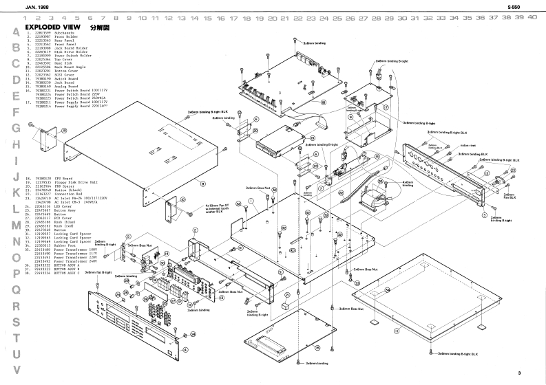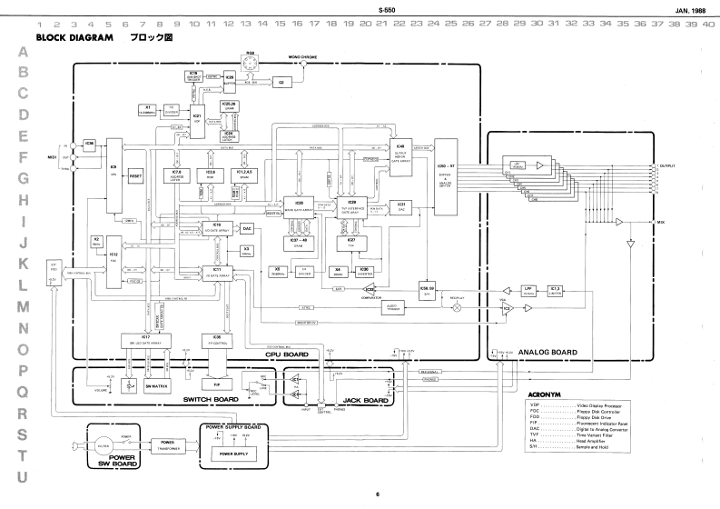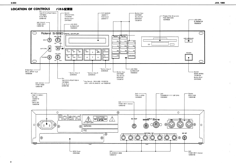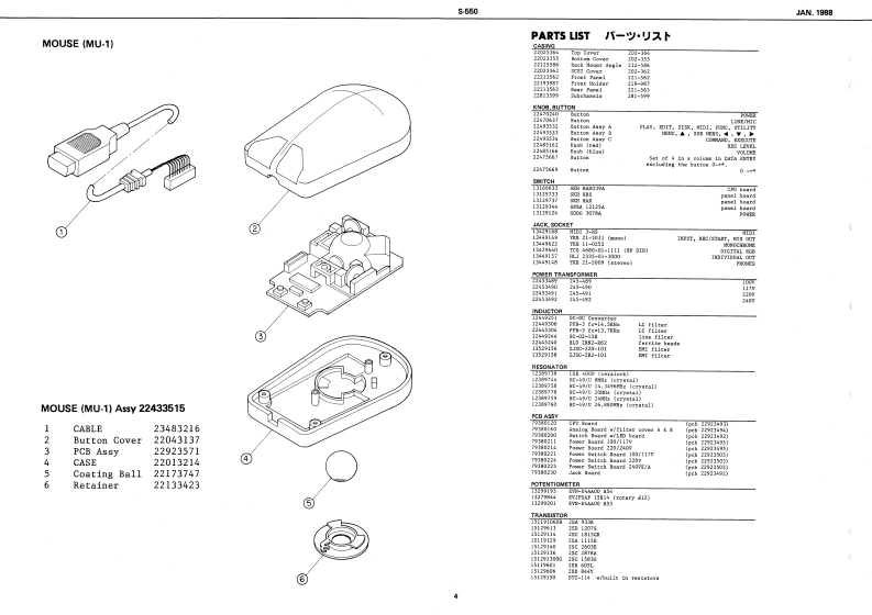 1AM,198855505-55▣SERVICE NOTESFirst EditionSPECIFICATIONSTABLE OF CONTENTS目次Page0t售装e积n转SAMPLIG SYSTEMLOCATION OF CONTROLS/礻儿配置因2DA CoA工S有IE年EXPLODED VIEW分解图3Cr1es0c村7s1TMa.2343055x4斜已hg1me1tn,.45160引41na.2241117MOUSE (MU-1)77入4Uay Dhk xtWU-引tNa.22415IB国wuer's ruenael0制-CfwGa花as或wWHDPARTS LIST1-4.5OUTPUTOPTIONL1-1月m1o年m辆Ameoee Ceevotw R 100BLOCK DIAGRAM加y7圆6NGB ConnDISPLAY OUTR2a5IFu量ht山AGI TTL LEVEL HOAIZONTAL FREO 15 950CIRCUIT DESCRIPTIONS回路解战7-N0CHc4吧0w05TE1PCHECKING AND ADJUSTMENT点棱及心调整11-CHANGE INFORMATION銮更案内15POWER SWITCH BOARD/7-又y于求-下16POWER SUPPLY BOARD7-#ブ5术-k16SWITCH BOARD又y于水-17JACK BOARD力术水17Taa Cove006964FDDA2GIACK130635CPU BOARDCPU-18-21ANALOG BOARD下寸口球-N22RGB CABLERGB竹-プ九23RGB OUT TIMING CHARTRGB出力夕?于-卜23IC DATAICデ-24,25D649n-P停1EA55丙12377222411t7Rolandnd-nting Now,球a-2》Printed in Japan8A2LH