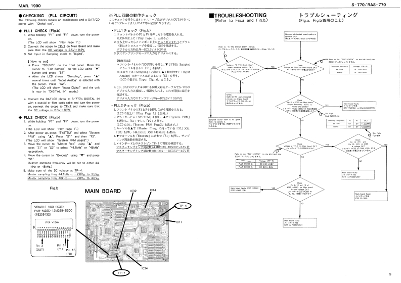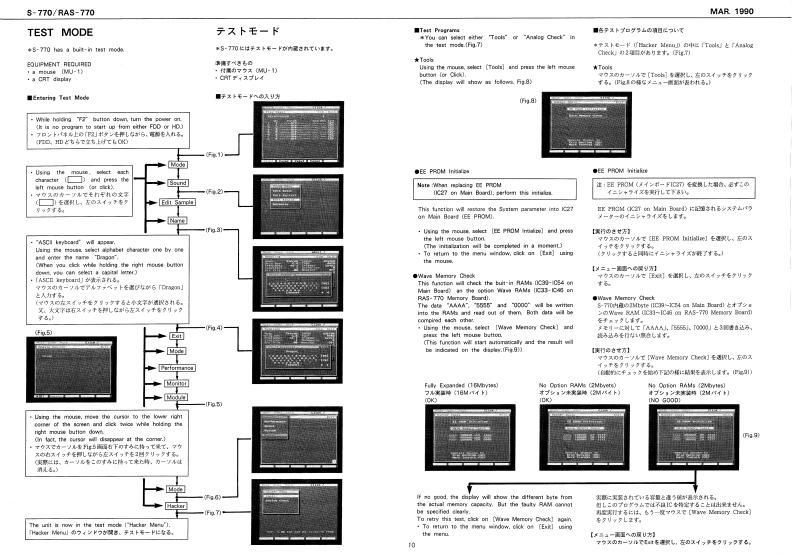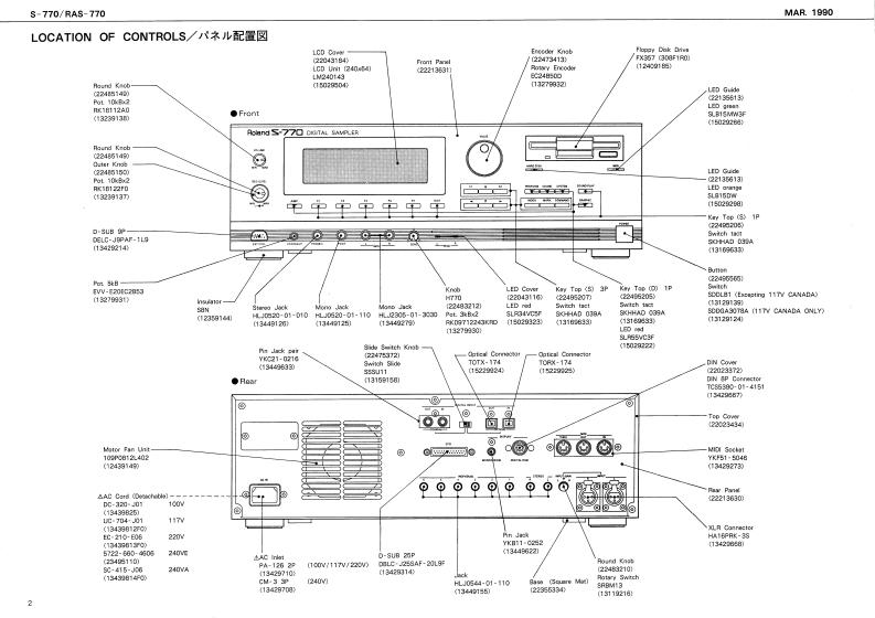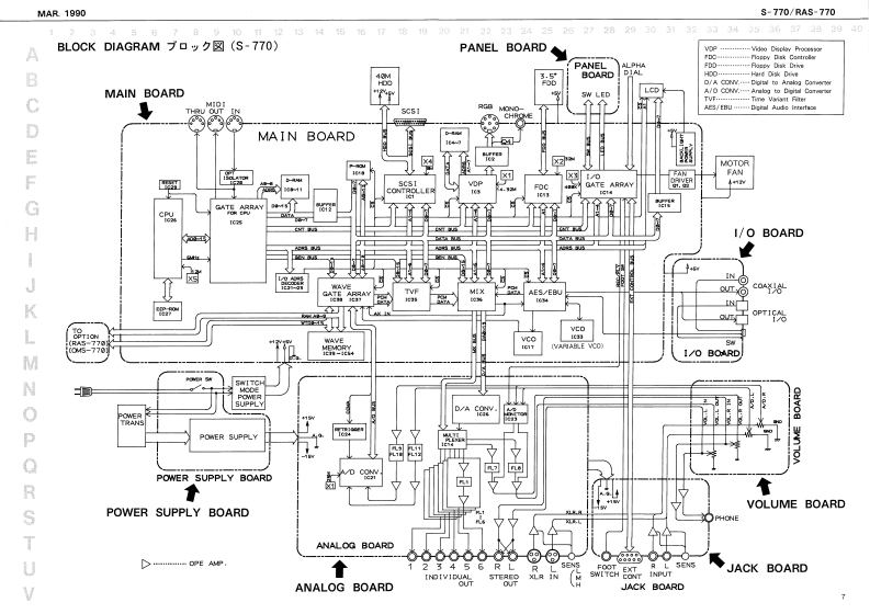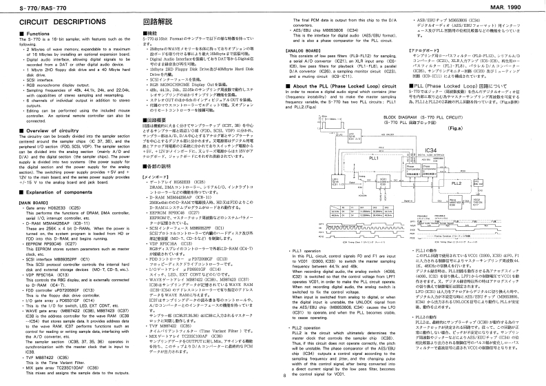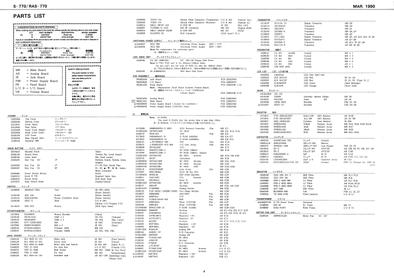 MAR.1990S-770/RA8-770S-77▣/A577▣SERVICE NOTESTABLE OFCONTENTS目次PageDIGITAL SAMPLER/MEMORY B0AAOFirst Editions770S-770SPECIFICATIONS (S-770)LOCATION OF CONTROLS代京儿配置闪2EXPLODED VIEW分因‘PARTS LIST=岁少之卜MOUSE (MU-1)72入MU-1)DISASSEMBLY PROCEDURES7w分解手顺BLCCK DIAGRAM口y國87CIROT DESCRIPTIONS国路解以CHECKING (PLL CIRCUIT)助作于x厚夕PLL回)89TROUBLESHOOTINGTEST MODE于天下无=书10.11"S-770 CHECK DISK"MANUAL岁-770 CHECK D5X“取保时男12-14NOTE (REPLACENG INTERNAL HARD DISK)肉量y一K于(又夕交镜時0生意14IC DATAC严=夕ANALOG BOARD了十口夕术一1617POWER SUPPLY BOARD面薄术一K16.1MAIN BOARD18.19.21SWITCHING POWER SUPPLY入千罗子少夕覆源20I/O BOARD/O术-Np-T7ERGB CABLE08ヶ-ブ儿21JACK BOARD5卡岁夕求一N1PANEL BOARD辛是术一NVOLUME BOARD求)ュ一4术一NRCHANGE INFORMATION贵更率内RAS-770RAS-770卡41线1P"SPEC白FICATIONS天风2夕0m0间02%141事州地有到1PARTS LIST《一岁少x卡1MEMCRY BOARD毛)一湘一F2,3TIMING BOARD多术三岁求一N2.3Top CawrFiont Pandl22023434122213311一F0um0knwt35T30gF100Panel Cover (Lefo(124001852202348220223459mNate Soe 0og0 2 ter more doras。CAUTION:an5nen&uo coov od hand disk白tn生量!:八-F(三步8T,97y了多止3T《老a4RolandPrinted in Japan Al-2 (DP)1Cepyright 1190 by NoLAND CORPORATION