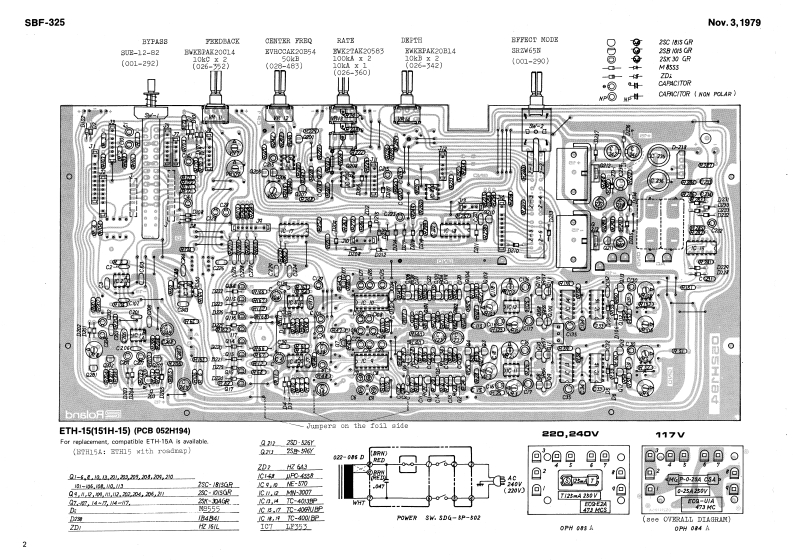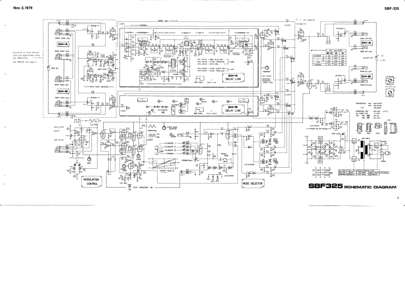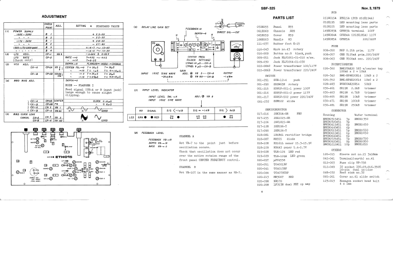 Nov.3,1979 [NOV.7.1983 2nd printinglSBF-3258日F=325DISASBEM回LYSBF-325SERVICE NOTES囹◆SPECIFICATIONSFirst EditionF一M4X0腿Power transformer022-086G100/117t◆Dy10W05T6=156022-086D220/2407CHORUS mode:5ma-7m泰lreutimgedencel(13xn》●+soueney ees04n对Delay linel:over 100k ohma两女-14k归〔+3=8到Dateut leval45knH:+4dB I+20dBm mealRUBBER FOOT-dB dnm maxd02849K-3111-057GO/E55Ns59MACHIN SCREWF=4×2L04H9四8witch3DG5P-001-11007(001-215】3IG5P-c01-21177JackJ程0红m时-0254-01-030《001-216]ⅢJ-0261-01-050Lever ewitah(009-00)8D35P-502220/2407(009-07188-022(001-232,the esue on rear(001-27)Button no.9 blackBLOCK DIAGRAM(016-009)10k5MCHACH-ACHACHASS/S0EIHONKNCBMACHINE SCREHCH-BCH-BCH-BNG-G43情一M7X6The figures and lettere-FRONT FANEL072H035in parenthe8 shovn inthe Specificationa &ndBlock Diagran:-LFO-applieabie to the unitaTOOTHED LOCK WASHERScontaining XTE15/15A.HEXAGON SOCKET HEAD BOLTSRoland4=M4×Fr123-013(1983 E2)Printed in Japan A3