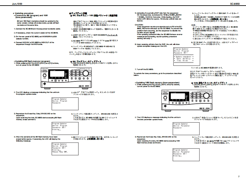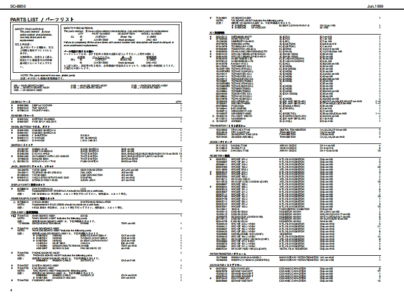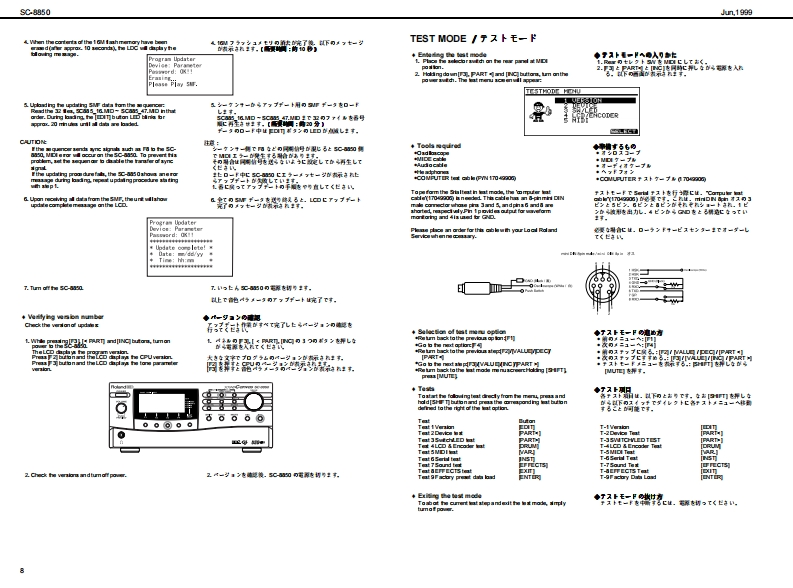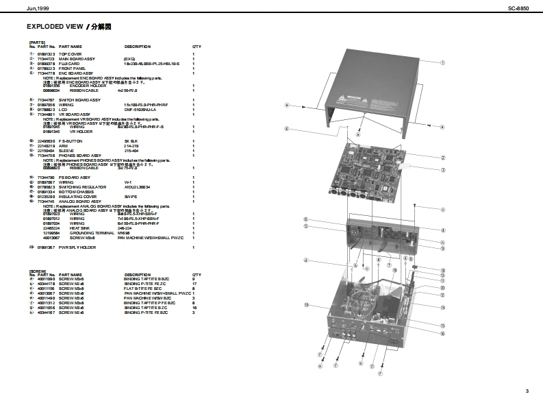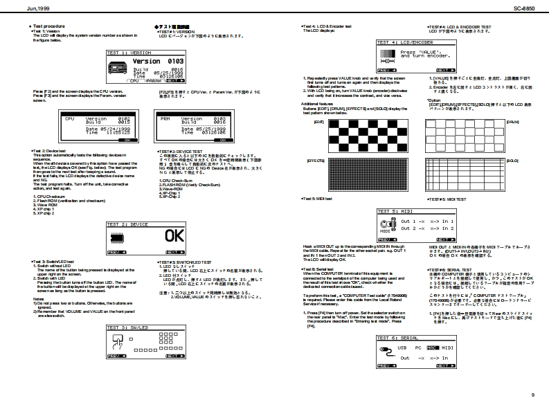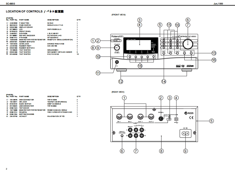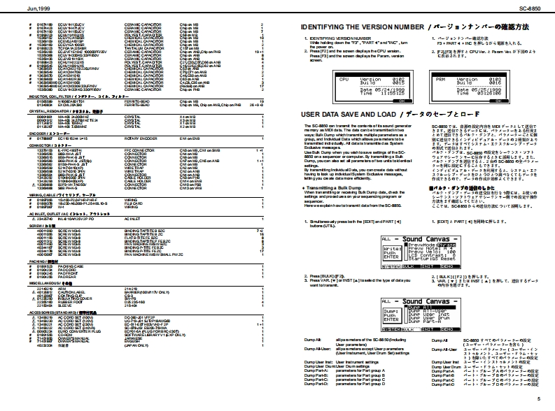Jun,199的SC期50SOUNDCQnVas SERVICE NOTESSPECIFICATIONS/主在仕樣SC-8850MedetSound Carvas SC-8850製品名:节宁之F,↑+之2C超0First Edition0 eneral M0iSy金mCM/C3am速C均《W927k/082才=72卜5)Issued by RJANurber afpat的●风一卜数484Maxdmu Pelypheny●最大中骨爬许数TABLE OF CONTENTS目次Page2a0ee约18存《苯42)SPEOFICATIONS主拿仕棵1LOCATONOF CONTROLS_未配国司nmal Memary●本格×毛)EXPLODEDVIEN_分解网Seund Maps43C-55S084SC-82A阳音色72了:4(3C890.8C88e,PARTS LIST4-5Native map)9C8AC-5】Presdt Souds:840IDENTFYING THE VERSION NUMBER_了号七y上音色数:1640一夕3之十之川一0阅防接5Drum Sound set83USER DATAS处E AND LOAD5-6F)k存色电2卜:83Us scud258:28FACTORY PRESET_772上)一7)eg上0方接在Ua查m soud ses2UPGRAOING PROCEDURE一分1之7,丁方接6-8TEST MODE_于2非毛--8-10EMoetERRORMESSAGES-11●2步8)日LO0 K DAGRAM7日32同Charus typs3一52《8精期】WIRNG DIAGRAM.13D出y0p】CIRCUT DUAGRAM高14-212Band aquae了(《0精】2F32中=CIRCUT日O4D22-2ertien生d例ps之节一乡a之,x7王夕上《84精)Obely●于425才80x84 ds Cn年ie180x8侧Fyk73742夕C08tLG①)《代夕2卜村意)●援城端子MDleemecters(N UN 2OUT 1.0UT2)O了未夕¥-《NAN且OUT AOUT日)udolreujackx2-P同ueQ单takx40JTJT-1L1风a9)Headphanes jad7F来》:罗午2夕Seral canedor了之烂一坐一端子RolandCNoCanvas scasoUS8 eaneetorU8编子n和●是视AC117VAC230V er 240VC00W5080e)Power Consumpio●消资花力11W11切说66666O超r幽ai丝●最大外形进21当4x2780x88H)00028朝jx278《爽订)送超《高3】m&80x10)x3-20hsg性重23kg23好2©SP92型eoeerias●付尾品报用和(74515国75文(野145187)AC CORD (100)3021勇园班著a4022234)《4PNCL)電视了一Fa3220列43a2G0R0M产++++)漂320U00WRT日R0090234)●壳品COROM0105生)了主一坐=,分一了春R8C5N《Du25∠?·9)7泰编子用)RSC5AT《D4山9∠之·乡97本写子用】Copyright @1999 ROLAND CORPORATIONAll rights reserved No part of this publication may be reproduced in any form wthout the wrimenpermis son ofROLAND CORPORiON*in the irterest dl preductimerevemert.he氢裂品的什候.者本口外固住,改但身上菌子骨李《麦夏®19的口一方之平本普0一留.舌儿(生全留态断℃餐写·后载有石已上老禁北1寸+雪马上的养9生事,u与etb change witheu prior netoe.Roland17059970Primed in Japan (GEO)(CR)1