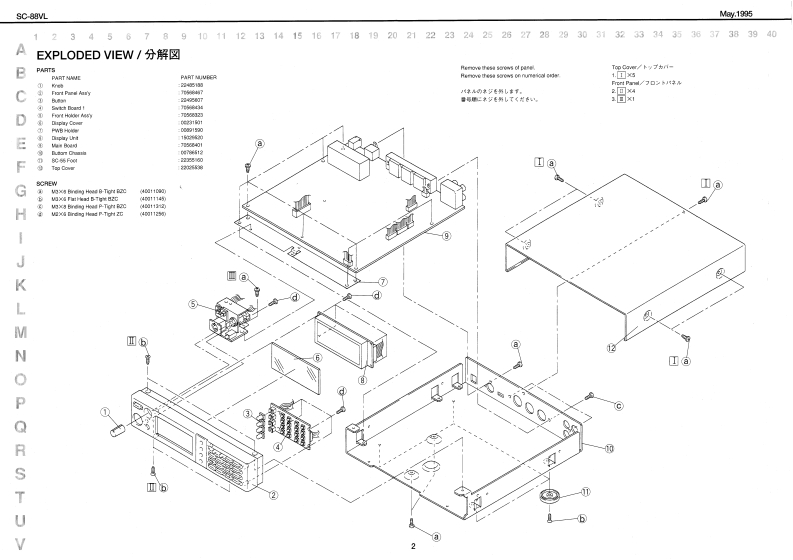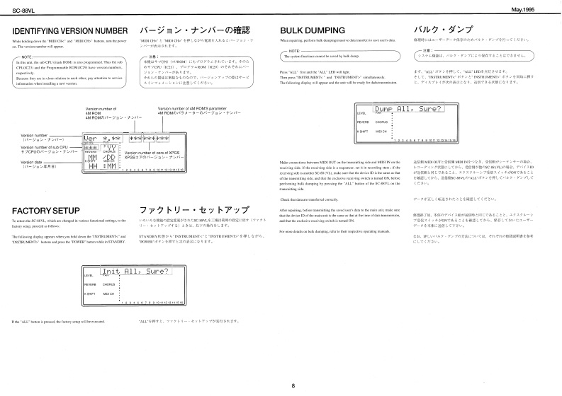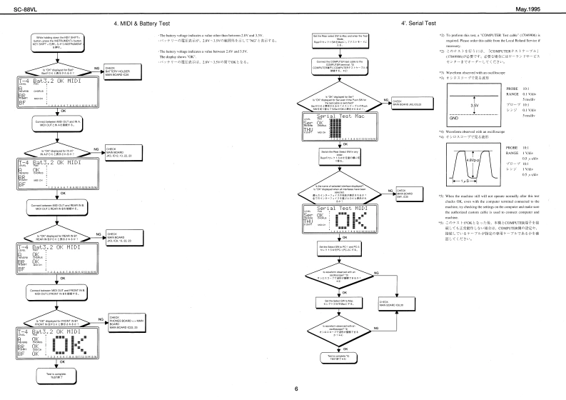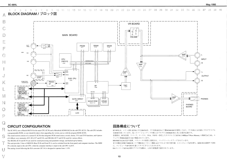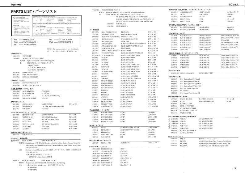 May.1995SC-88VLSOUNDCanvasSERVICE NOTESSPECIFICATION/仕横MIDI SOUND GENERATOR SC-88VLFirst EditionERRATA SUPPLEMENT is attached at the end of the page.最修夏父正娱表&追加情银多门主寸,TABLE OF CONTENTS目次PageSPECIFICATIONEXPLODED VIEW2PARTS LIST置=义入卜444444444444444443TEST MODE于入卜毛=下4444444a44444444:IDENTIFYING VERSION NUMBER=方a之乎/代=)裤得4:FACTORY SETUP7T夕卜一·七y卜了yブ9BULK DUMPING/)儿分。岁ブ1111111193143wIC DATAC于-夕1111111111111ngMC Adgtor IACI-IMI4%0.1】4#60210BLOCK DIAGRAMブ口y夕☒-91m111111104C1.1301两线1344参141UAC-2214Ng.11444605j0CIRCUIT CONFIGURATION回路情成纪2八了1111111111111111111”104C0.240里2501144a9.4AN■ANg17449549CIRCUIT BOARD基板回111c1056301CIRCUIT DIAGRAM回路回11111,12-13Frehih(3056米01CdNm工C8MOHAT I IRM FL/WT sminSC-15AFL.d%r Apple Mecimoeh seir065R4D-3t3m黑Ade3nMh山Ia suth/Er chaio mitinl piw aidiynGENERAL VIEW/概觀☒D0215011Ces整n也eaMRbF nLKLDD RCMDONTG827240公4特115035215120LU46Roland⊙L20⊙1r0A月1D制ec时HM Jnck44¥2245450n22551613321-464t511t24421d非s504线3中144e050m时1342411172汽1130610134(13M4解马Roland17059803Printed in Japan AFAO [DP)1Coppig 1 ROLAND CORPORATION1