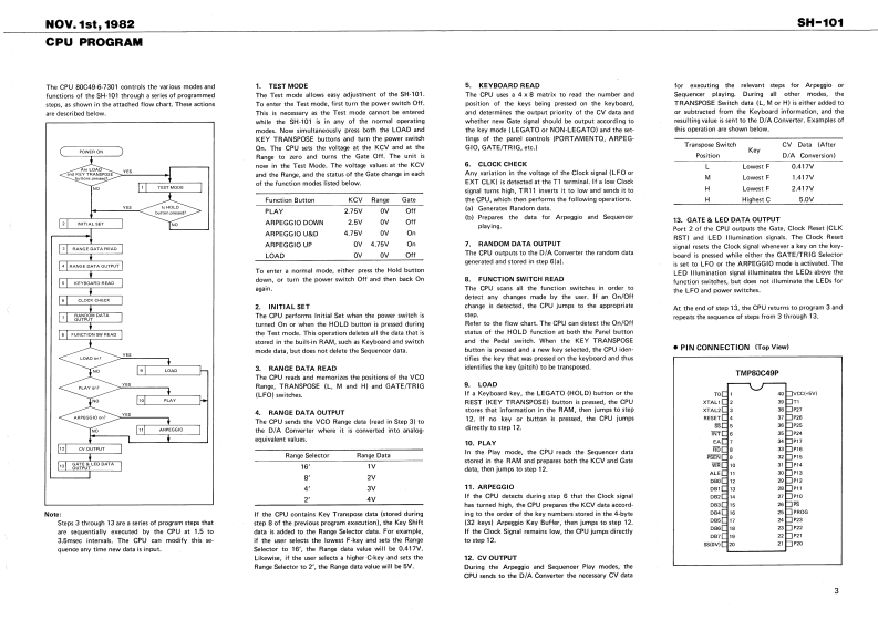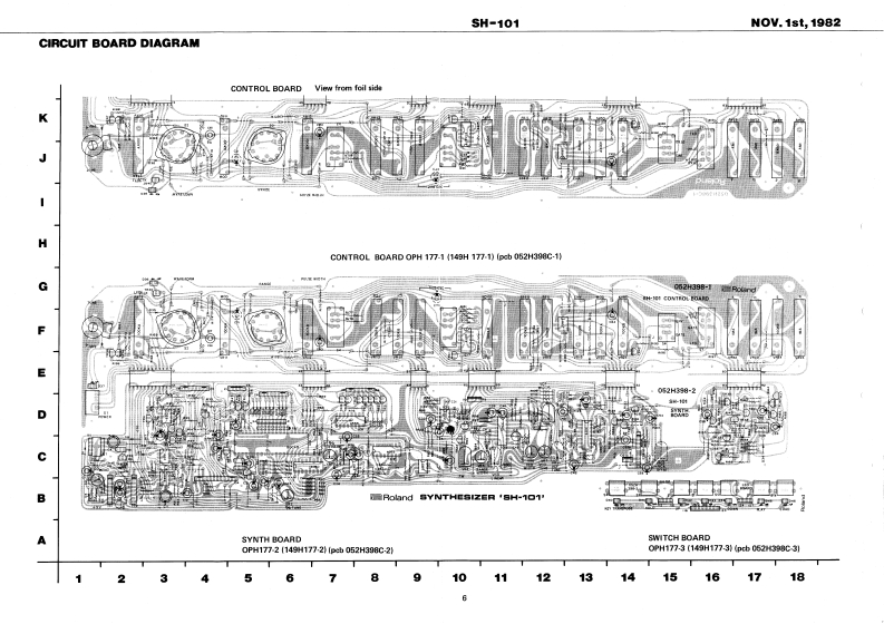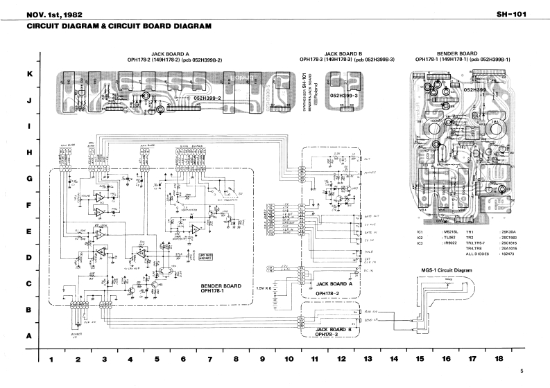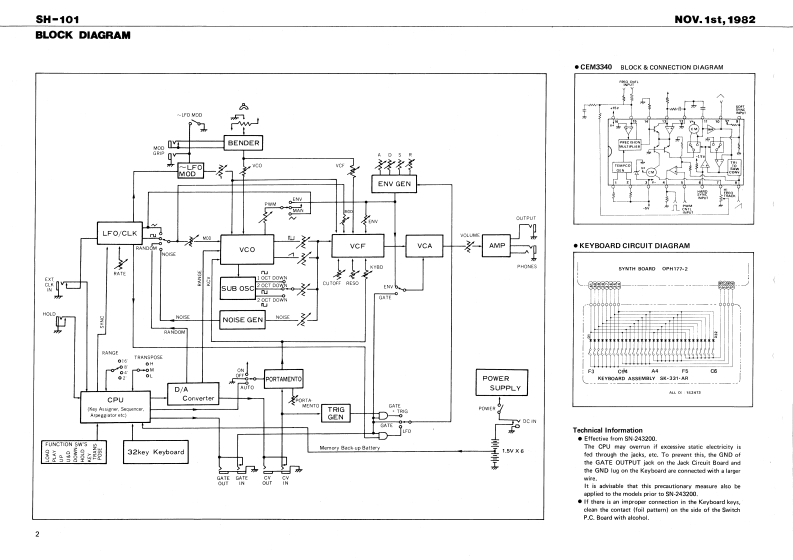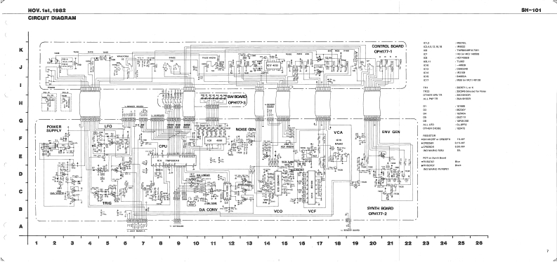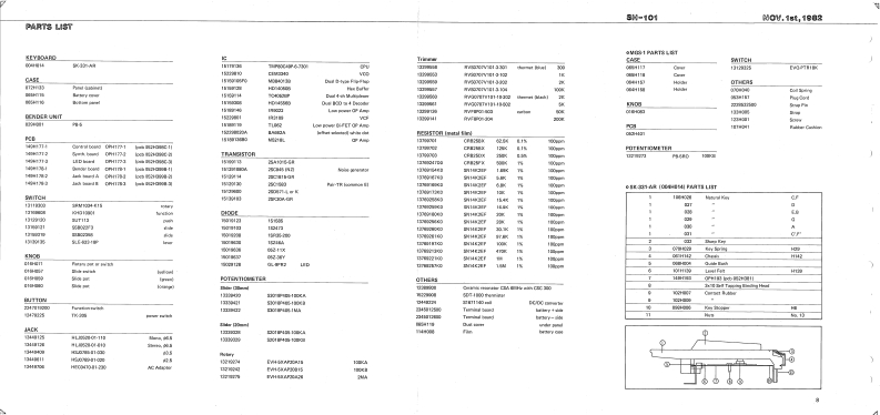 NOV.1st,1982SH-101SH-101SERVICE NOTESBOTTOM VIEWFirst EditionH标eDs联be共物#的2中T季cdSPECIFICATIONSKeyboand32 key.FseleAudio0时BmKvoOan016.零,4,2Gate IOFF-OV.ON-12VISoreme 1123H0011Pulse Width Modulacion 150%CV I1V/OCT.0415V5V)Tee灶50eemllaputGate 142V or moralVCFCutalt Fregueney 110Hz 20kHzlCV I1V/I OCT.O7VIKey Follow [0 100%)EXT CLK (+25 o more)DC IPV12V)ENVAttack Time.5rs飞4lDecay Tine (ma 10u)Oryodb 1.5V x 6Sustain 103Pn日1利Rekae Time 12ms 10slP向Corounplian1WLIOVCLK RATE I伯.1HtS0HDimensiontComesllerPorlameno Time 55221》×17'4助×3'0HsTranspcoe (LiM H)青tINNER PARTS LOCATIONSeguonoe100s1u6mTOP VIEWm向.t转H1)物22-2120kd41141R2191 ck bawrd112H相得-J1817918MGS-I0P刊3晶Ca时05)HI5刀111213141551001EUSLE-673-18P11313134凭0040们2对门44号当XA0A,MA1112tLe700-0@01134426111tDt心20137060065Ww1D04-板51】13J8J15K31+4机15844e14i5.Por.垂VH5父A06站K1192431Pe的=a自e】e32411110005-1C0A11】24275107FJ4r4S到4HG4111g钙1MA12422511.Dkrder Urit石58*eG件M,的D1gcer.P8-5R0.VILEDGL9P用1150272想1016057RolandPrinted in Japan.1