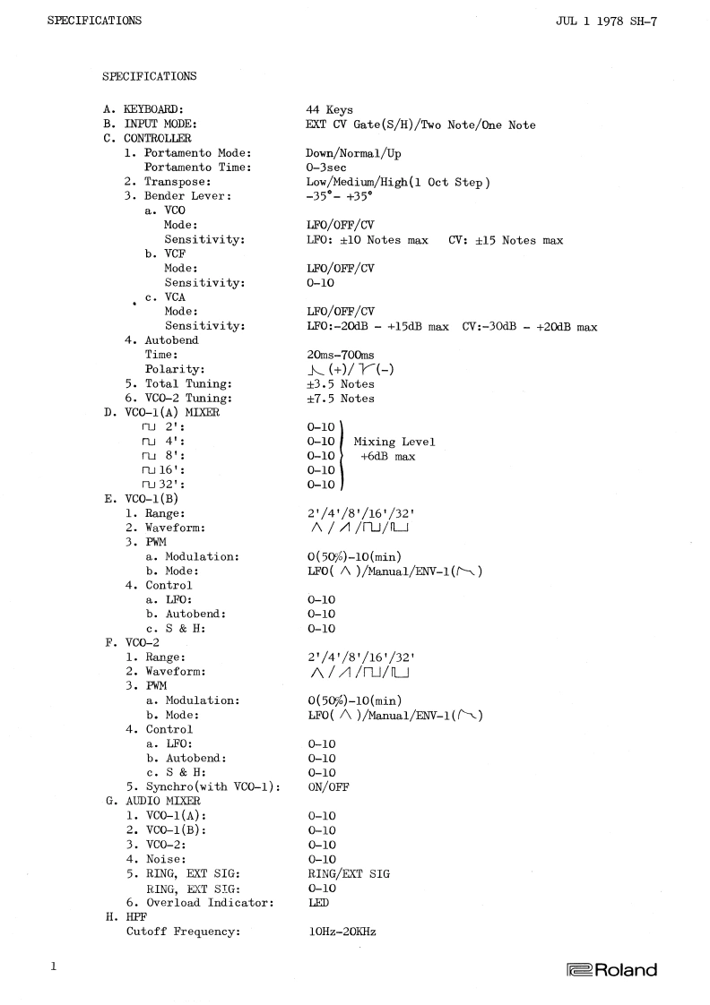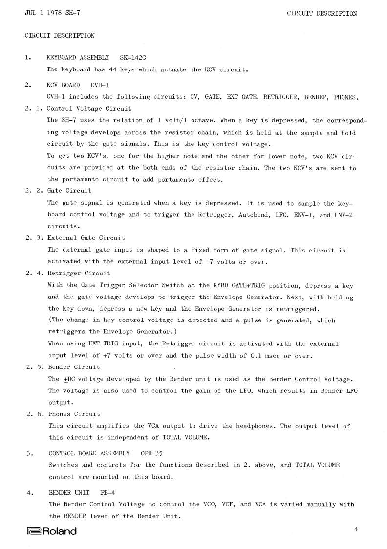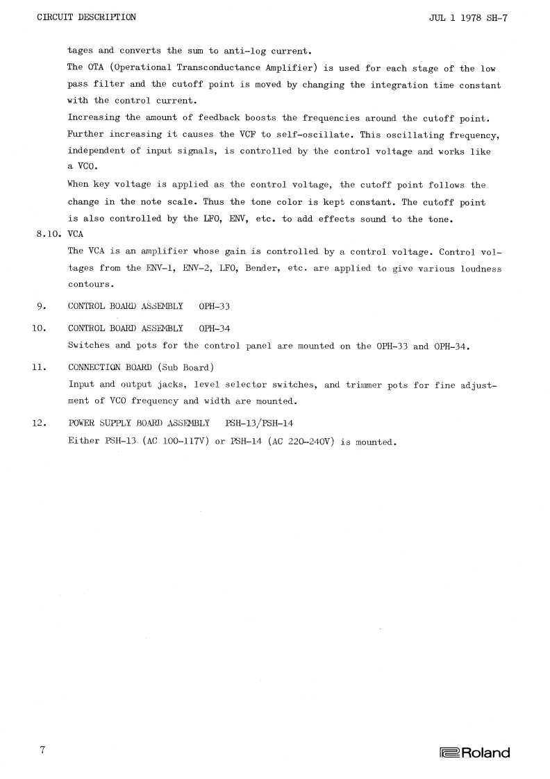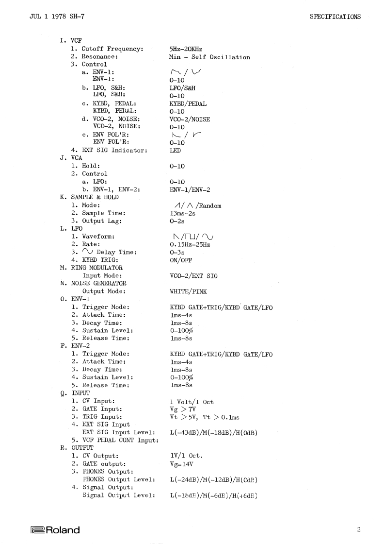 JUL 1 1978 SH-7SYNTHESIZERSH-7SERVICE NOTESCONTENTSSPECIFICATIONS ................1DISASSEMBLY,·.·,··,··3CIRCUIT DESCRIPTION........7BLOCK DIAGRAM··8C0 NTROL B0ARDC(OPH-35)·.·.·KEY CONTROL VOLTAGE BOARD (CVH-1)...........................9OPH-35/CVH-1 CIRCUIT .......10VC0-1B0AD(VC0H-1)...11VC0-1 CIRCUIT.··。12VC0-2B0ARD(VCOH-2)·.·.13VC0-2 CIRCUIT..··。14LFO BOARD(LFOH-1)·.·.。15LFO CIRCUIT.·。16VCF/VCA BOARD (OPH-14)170PH-14 CIRCUIT.·18CONTROL BOARD A (OPH-33)19OPH-33 CIRCUIT···20CONTROL BOARD B (OPH-34)..210PH-34 CIRCUIT……22CONNECTION PANEL-SUB-CHASSIS·..··23POWER SUPPLY BOARD (PSH-13/14)/CIRCUIT ...................24POWER SUPPLY WIRING··25ADJUSTMENT26PA哈·。···。*,,,,,,,,,,。,33PARTS LIST36KEYBOARD PARTSRoland