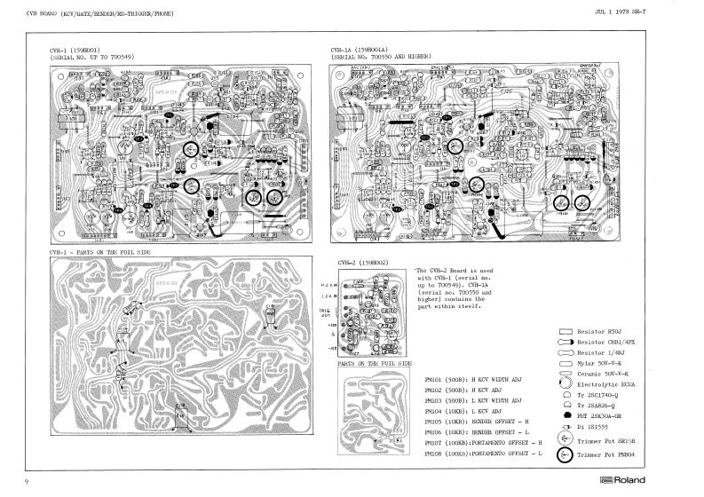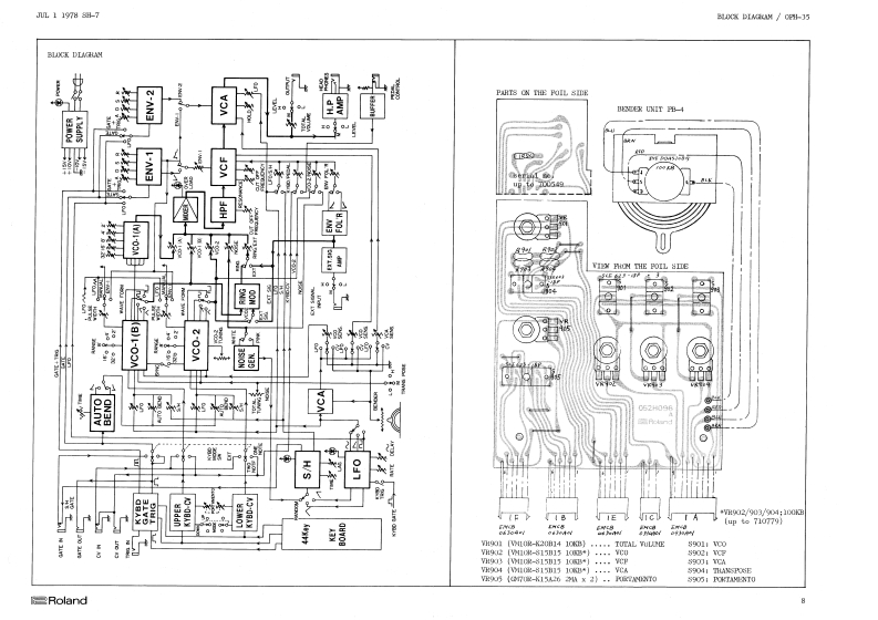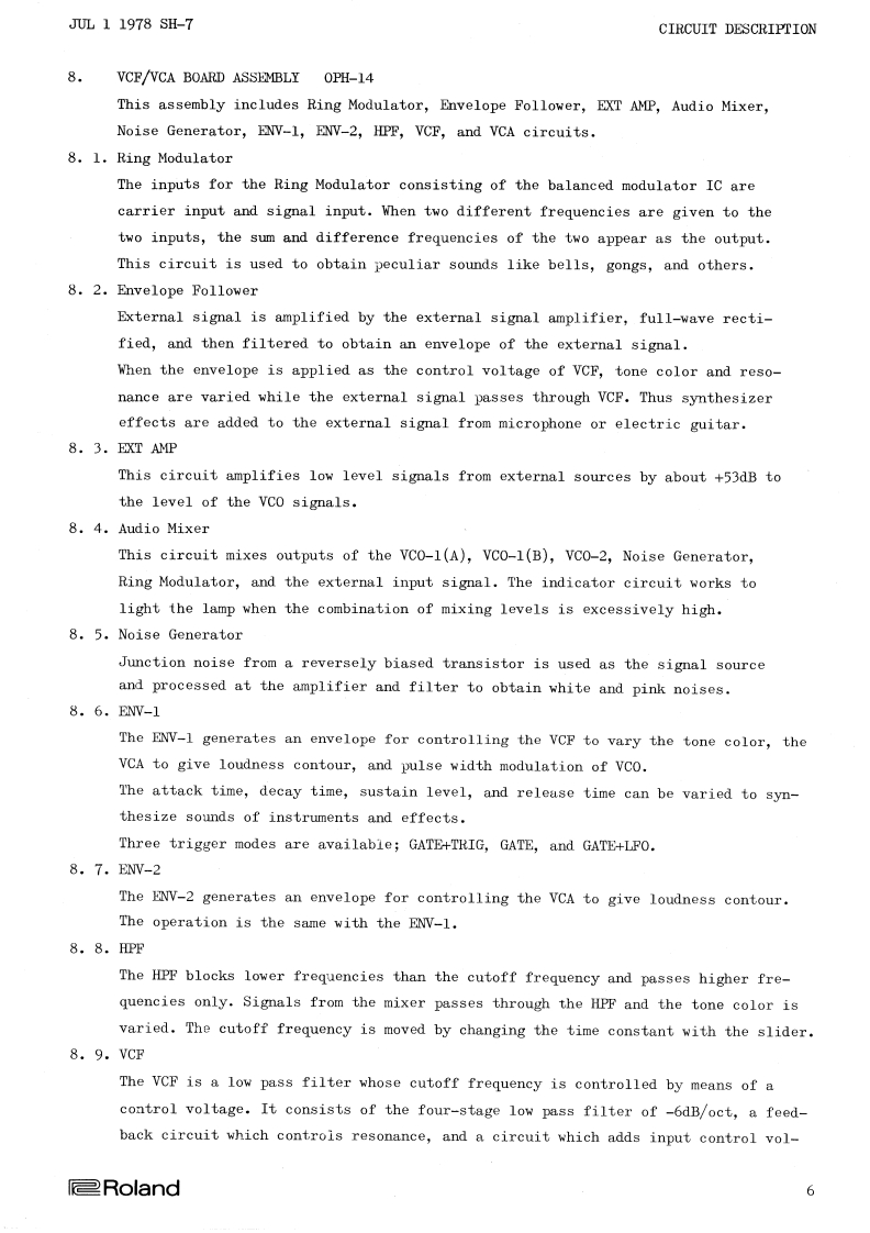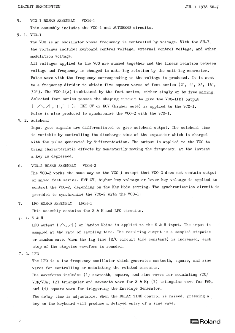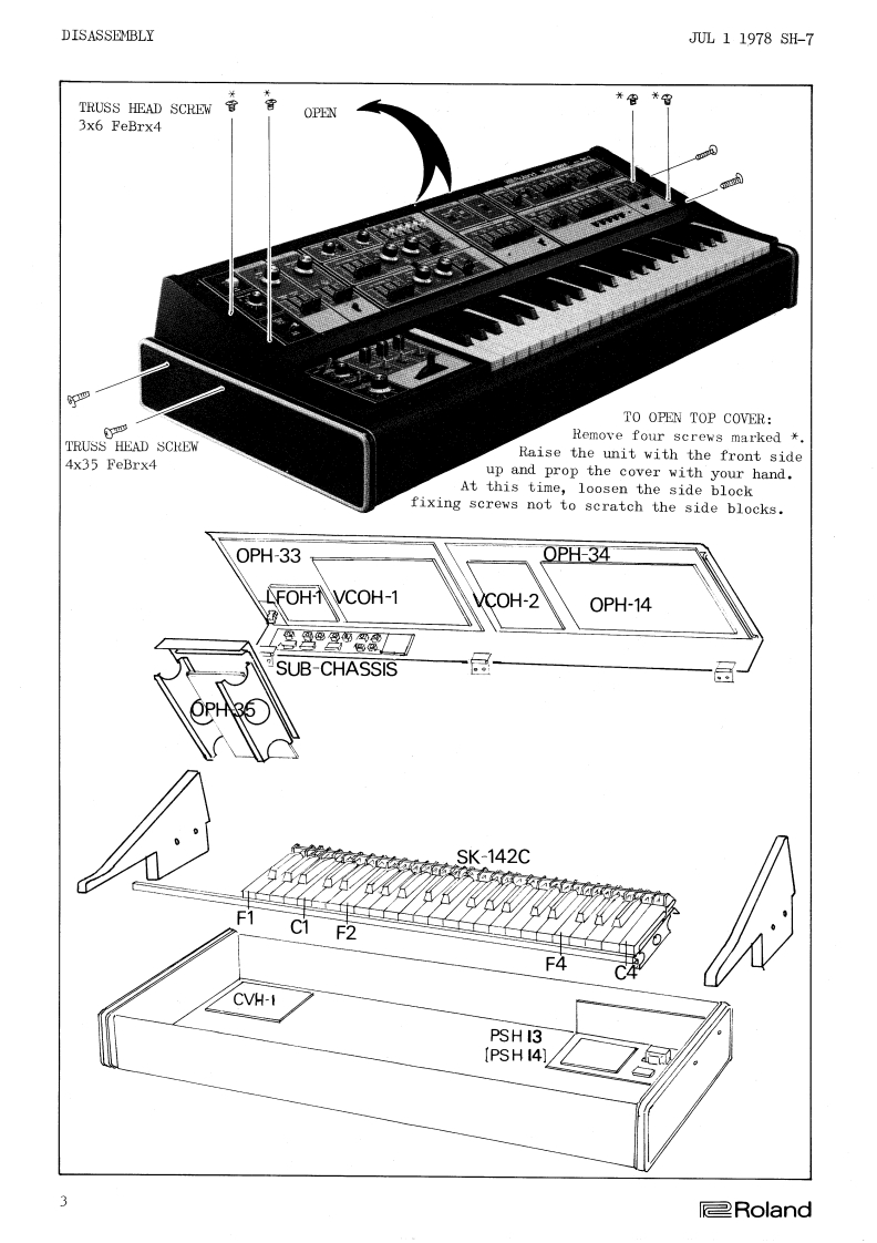 JUL 1 1978 SH-7SYNTHESIZERSH-7SERVICE NOTESCONTENTSSPECIFICATIONS ................1DISASSEMBLY,·.·,··,··3CIRCUIT DESCRIPTION........7BLOCK DIAGRAM··8C0 NTROL B0ARDC(OPH-35)·.·.·KEY CONTROL VOLTAGE BOARD (CVH-1)...........................9OPH-35/CVH-1 CIRCUIT .......10VC0-1B0AD(VC0H-1)...11VC0-1 CIRCUIT.··。12VC0-2B0ARD(VCOH-2)·.·.13VC0-2 CIRCUIT..··。14LFO BOARD(LFOH-1)·.·.。15LFO CIRCUIT.·。16VCF/VCA BOARD (OPH-14)170PH-14 CIRCUIT.·18CONTROL BOARD A (OPH-33)19OPH-33 CIRCUIT···20CONTROL BOARD B (OPH-34)..210PH-34 CIRCUIT……22CONNECTION PANEL-SUB-CHASSIS·..··23POWER SUPPLY BOARD (PSH-13/14)/CIRCUIT ...................24POWER SUPPLY WIRING··25ADJUSTMENT26PA哈·。···。*,,,,,,,,,,。,33PARTS LIST36KEYBOARD PARTSRoland