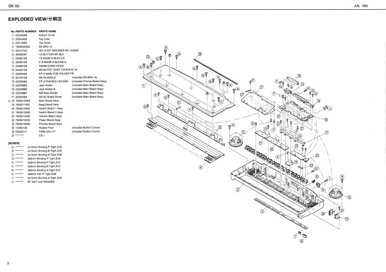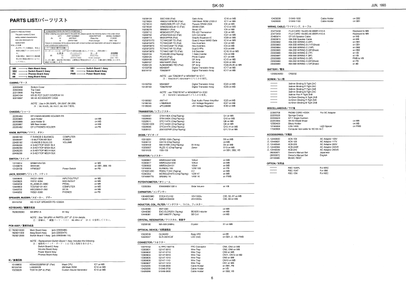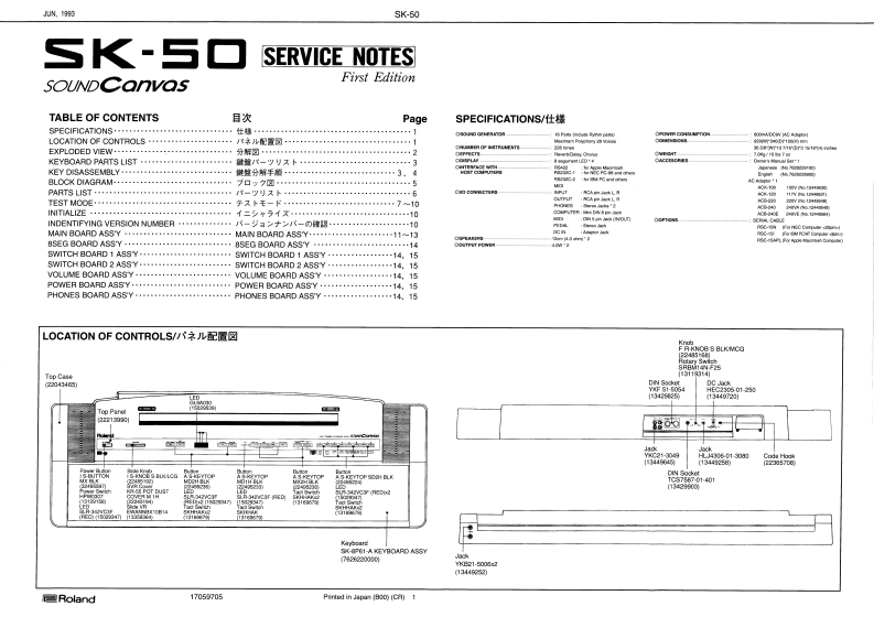 M队16SK-50/SK-50VLOCATION OF CONTROLS/バ礻L配置图SK-50/SK-SOIV SERVICE NOTESsK-5▣VAULTI TI日RAL KEY3口AH▣Second EditionOTE:The ports mar时diterent coio时Frt注意:具生机招品过.色是功品★Issued by RJALEDSK-S0V is a oelour wrsion el 8K-50同速其之卡功之岁商品,,:工一夕年5球0诗16e35SK-50V consista of compononts idanticnl lo these used lorK-W上5求约漫注,卡y7心来是,州多類功色的SK.50 oxcapt for the lollowing which ararolated to to ditoronce in colou.X33V,m,y)了4一二的色的建柱上0,下视龙基品松计球-知上道生十and SK-50.and should be used in coniunction wit the舌九风外:21℃15K-50的特一比方/一多(1Tmw09:servioe notee(#17069705 issuod in Jun 19930)for BK-50.1四年6月免行}登参期L℃下3。Difference between SK--50 V and SK-50/SK-60IW之sX-50②rf-yy又下比敕PART NAME/部品名9K.50WSK-50hoy/Pf求y-l0 ark Grmy/岁=夕艺=Ta0C20/k?子行-29y-1220434SK-EGI-AKEYDOARD ASSY0kGay/岁-夕岁-72220000T甲ar/卜z于中Kncb,llutton司2.COMPUTERFR-KNOB S MOG/LOGFRKNOB S BLKMCG22410Gy/7=022415106s%/黑术堂POWER-BUTTON MX-MCGIS-BUTTON MX BLK13110143248363Gy/7-32435590EX/黑pN6eck编Da1文1250VCLUMES-KNCB S自aLCa224652Gwy-124519火/黑AS-KEYTOP SO2H NOGAS-KEYTOP SDOH BLKNambor B月e间223610G/12749422410k/里BANK DOWN/UP.MASTER MIDIAS KEYTOP MOH MCGAS-KEYTOP MX2H BL风22952☒1)Ga/7(22486230川Bck/黑2130L430e81-303018446418448FATAS-KEYTOP NDIH MCG22495234G/5143ea两TCH BEND,KEY THANEPOSr45-K广YT年PLE界4年CAS-OSTTOP UDSH RLKCHORUS REVERB PART.224952371@y/5022452360ak/黑Music Rast.■立00a7C4r8G膨/y-t透明221936g5同ela-a/宽Packng Ci/精包树◆X-538 V Packng Caan◆gK-0 acking Can1001013171d2803390302dL*P82284535*PadR.-224537Roland1705005Prinkd in Japen (C0o (CAI