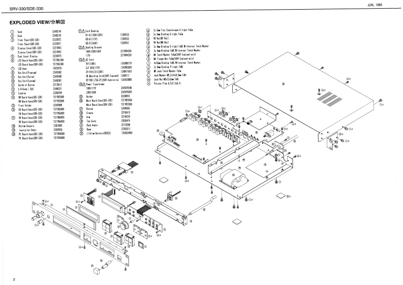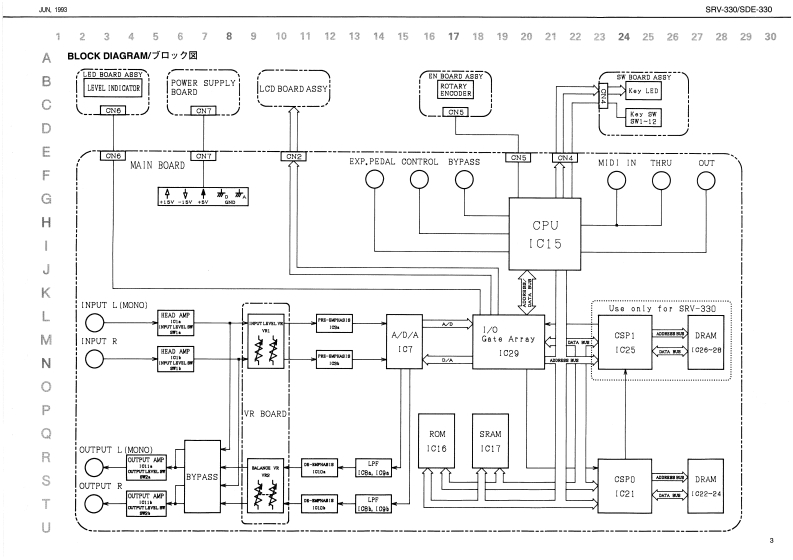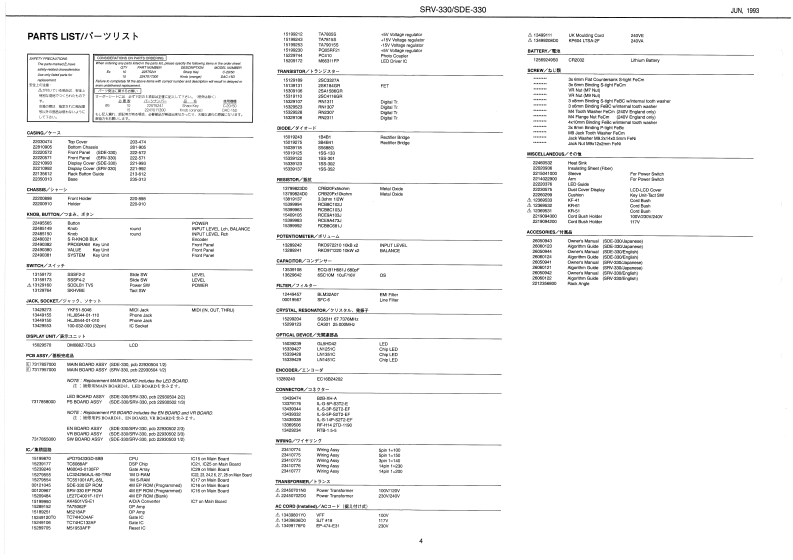 UK,193SV-330S0E-330SHV33▣/S▣E3日▣SERVICE NOTESFirst EditionDIMENSIONAL SPACEREVER日/▣IMENSI▣NAL SPACE▣ELAYSPECIFICATIONS/仕楼TABLE OF CONTENTS目次PageSPECIFICA0N5,,ttnt91na仕相111111L0CAT0NCFC0WT0L5nna:录儿配圈☑-,,,,,,a:iPLODEDEW.........................0K GA.-................111ブ☑☒---,,,,器”aW3厦5d0NDENTIFYING THE VER3 ION NUMBER........:バ-罗a曜踢方法·-11n1346A洲回:的相4领IUd科LOADIN8 THE FACT0 RY PRE8 ET DATA1:7y7卜y-·プ)t,卜·y-学00-下方法:8DATA8 VE AND L0AD,子-夕功七-ブ上口一KD方法-,,:9114444……-1215MAIN BOARD ASSY..-----.-.---.-.............MAIN B04A0AgY4*·-·-…-…---16✉18EDB0月DASSY……tLEDBOARD ASSYY.............-.-.-.-.-18,19CCaraesnr+向aCwQ角f3B0 ARD ASSY44+………-+20,0Tc南U0aEW040AS3Y…20,21TE200VR BOARD ASSYVR004月0AS3Ya411144·*20,5WE0 ARD ASSY..…20,210于一岁1115181■1■1■114014144.4=·“·-·…22CHANGE INFORMATON.........-..-.-.-.-.-.-.-交更案内1”1m1”1指1111▣144444.4·+…一23LOCATION OF CONTROLS/Y礻配置☒Fien Pand I8DE-33012222067%Figet Parel 18RV-3301Daplay Covr (SDE-300)2221094光KngtDiaplay Covor 8RM-33003月切30L2245150B221099RolondnLCDPROGRAM Koy UniVALUE K师h向2495140DMOSIZ-TDL31204903a21249加811506700n544-01-41013445229108012222DUST OOVER DISPLAY22205面®志西南晕适商帮通面令山28ee SWg的gW5552-288F42240.KA511513151网Prona Jack高别05440101b14915得Roland17元69709Prted n Japon (CE)ICR)1