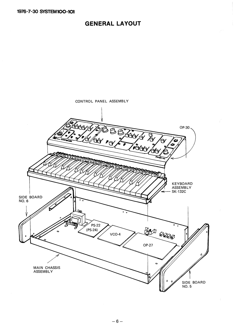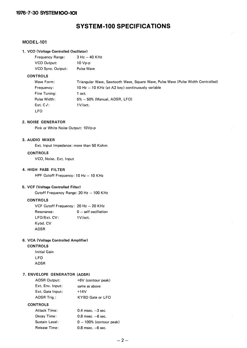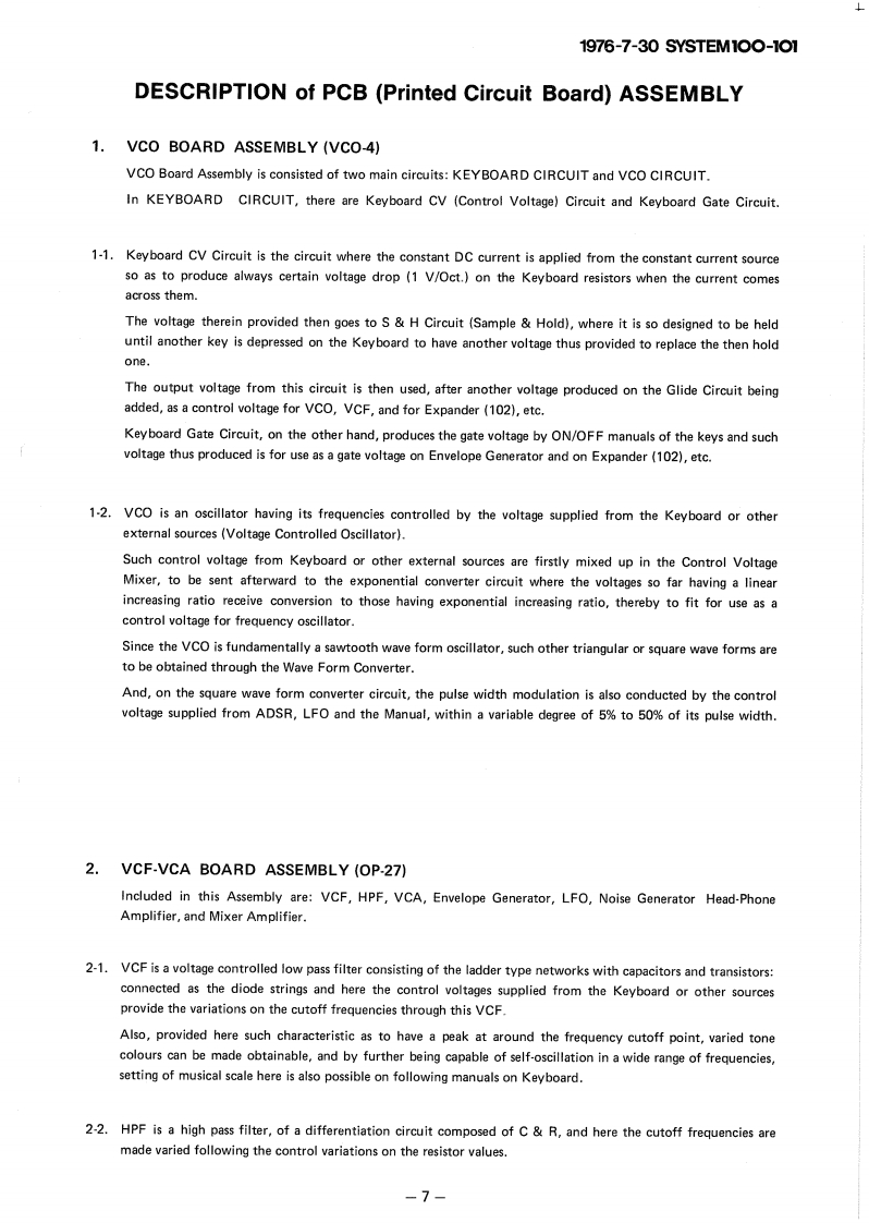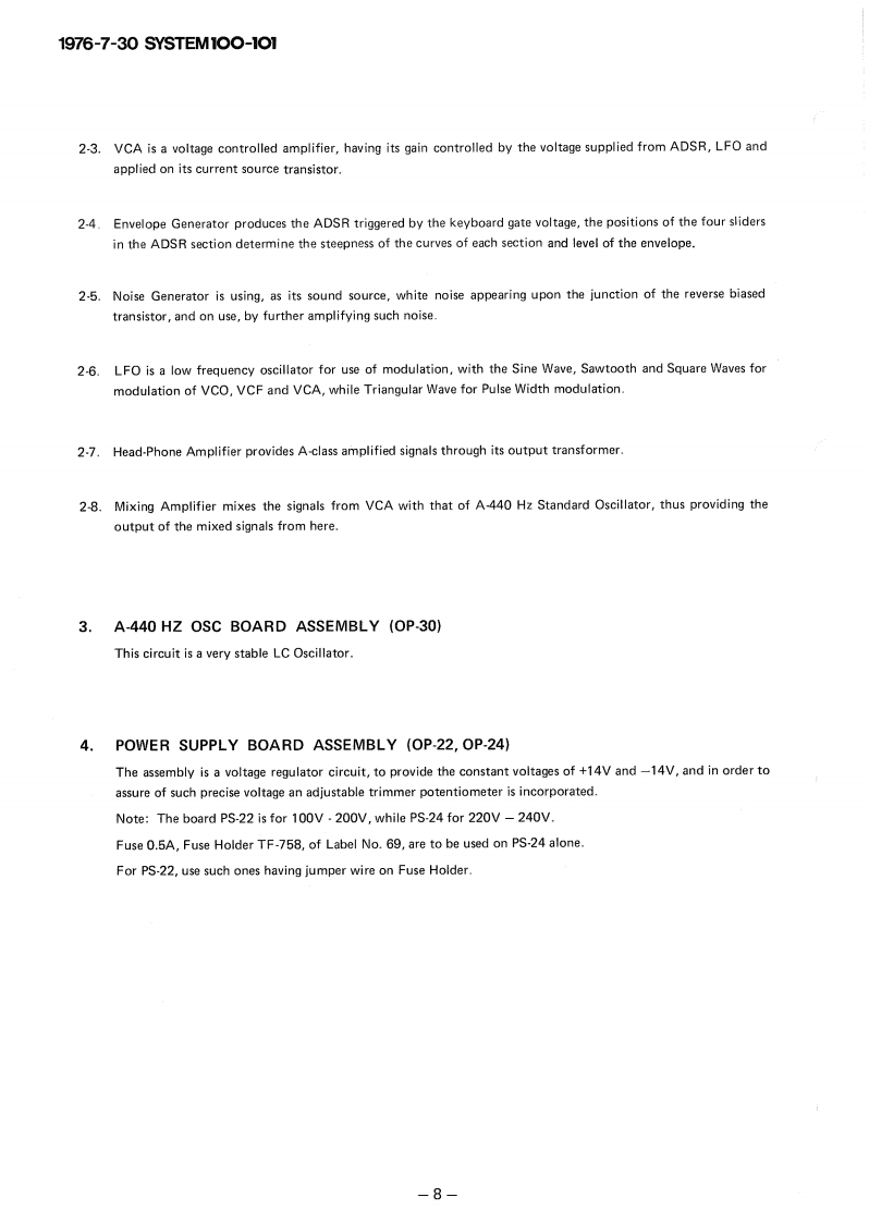 1976-7-30 SYSTEM1O0-1O1CONTENTS1.SPECIFICATIONS22.PANEL DIAGRAM....··.43.DISASSEMBLY...............54.GENERAL LAYOUT..............65.CIRCUIT DESCRIPTION76.GENERAL BLOCK DIAGRAM.............97.SEMICONDUCTOR ELECTRODES.......................4444444498.PRINTED CIRCUIT BOARD ASSEMBLY PARTS LAYOUTAND CIRCUIT DIAGRAM................................108-1.VC0-4VC0B0ARD..............108-2.OP-27 VCF-VCA BOARD..............1283.0P30A-440Hz0SCB0ARD...·...148-4.PS-22,PS-24 POWER SUPPLY BOARD........................159.WIRING DIAGRAM....................1610.ADJUSTMENT..·..1711.PARTS LIST .....3212.PARTS PICTURE36-1-