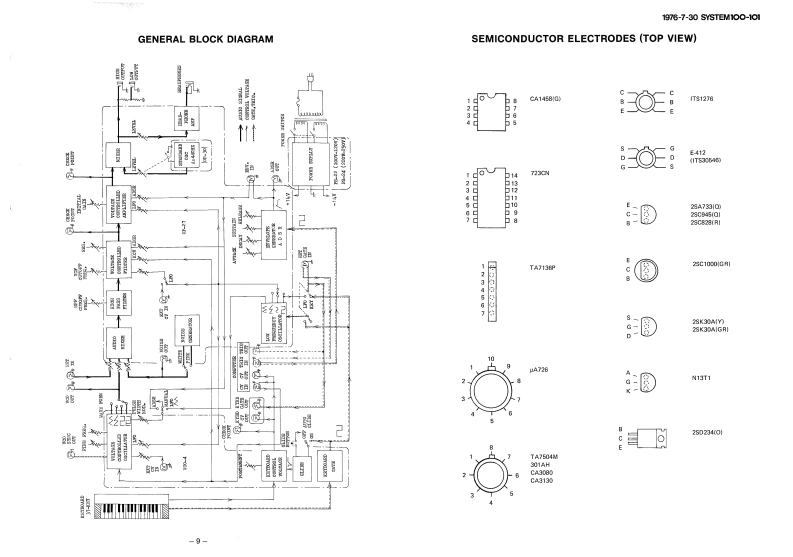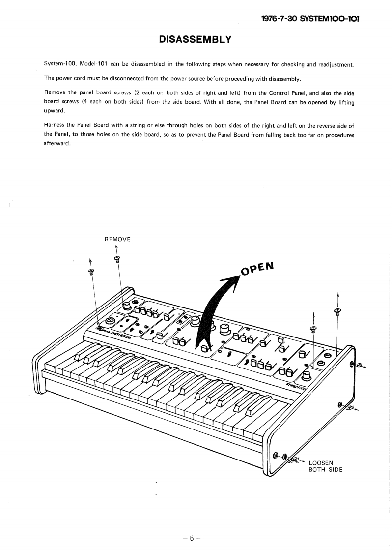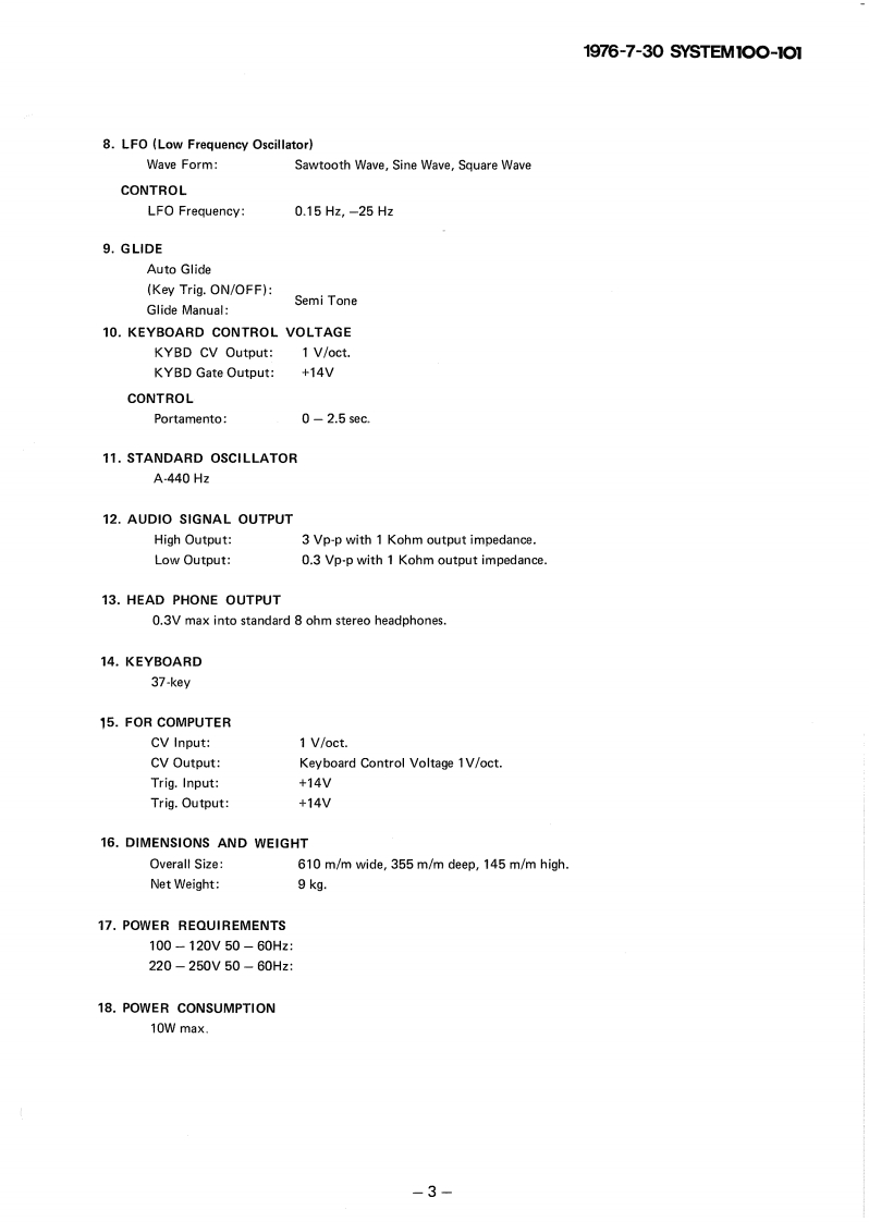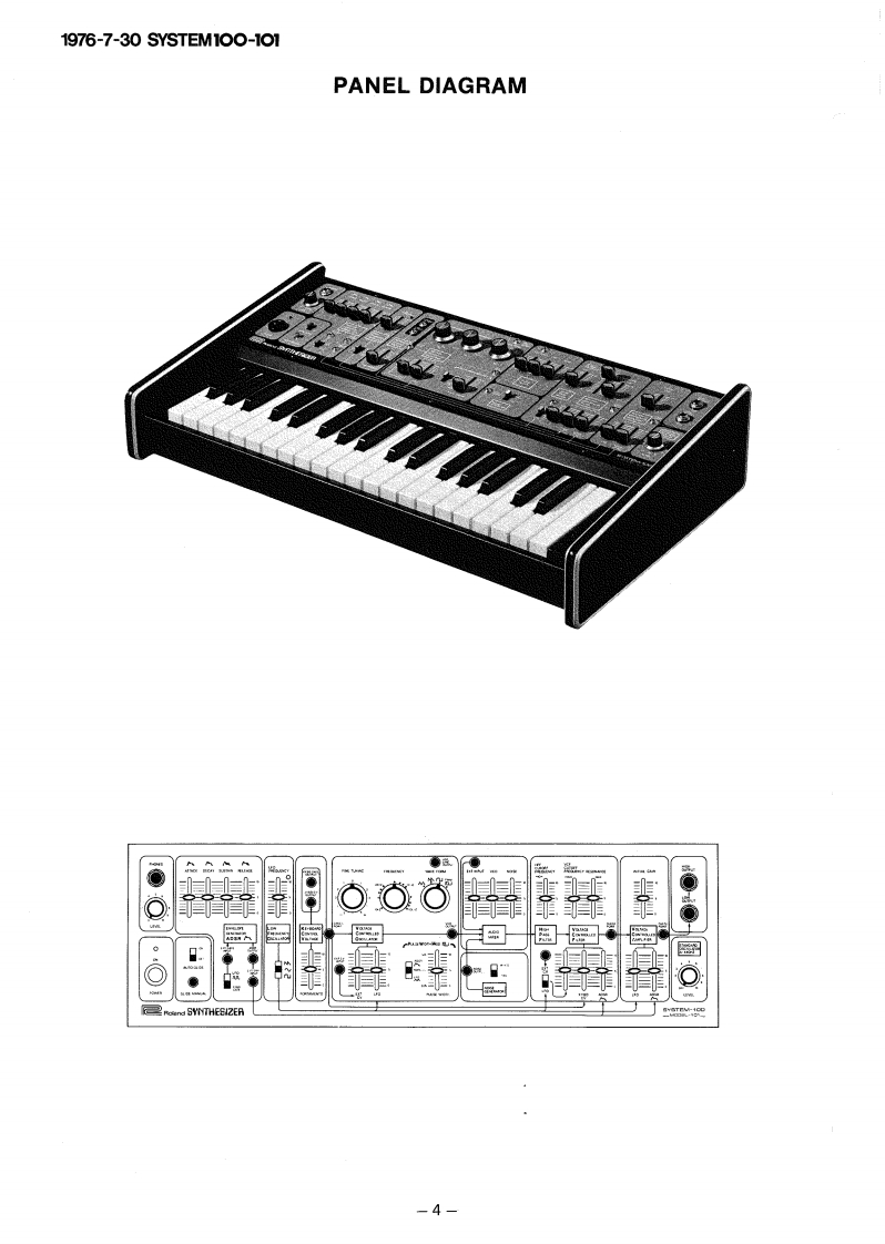 1976-7-30 SYSTEM1O0-1O1CONTENTS1.SPECIFICATIONS22.PANEL DIAGRAM....··.43.DISASSEMBLY...............54.GENERAL LAYOUT..............65.CIRCUIT DESCRIPTION76.GENERAL BLOCK DIAGRAM.............97.SEMICONDUCTOR ELECTRODES.......................4444444498.PRINTED CIRCUIT BOARD ASSEMBLY PARTS LAYOUTAND CIRCUIT DIAGRAM................................108-1.VC0-4VC0B0ARD..............108-2.OP-27 VCF-VCA BOARD..............1283.0P30A-440Hz0SCB0ARD...·...148-4.PS-22,PS-24 POWER SUPPLY BOARD........................159.WIRING DIAGRAM....................1610.ADJUSTMENT..·..1711.PARTS LIST .....3212.PARTS PICTURE36-1-