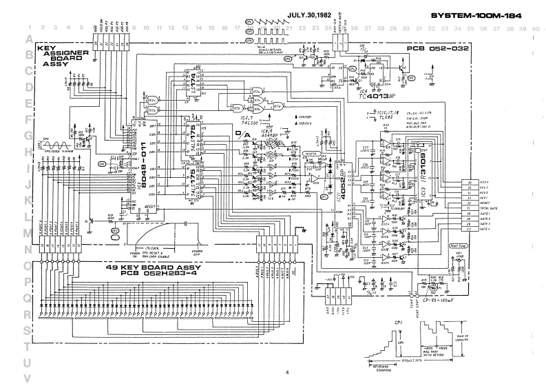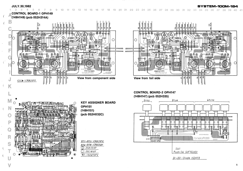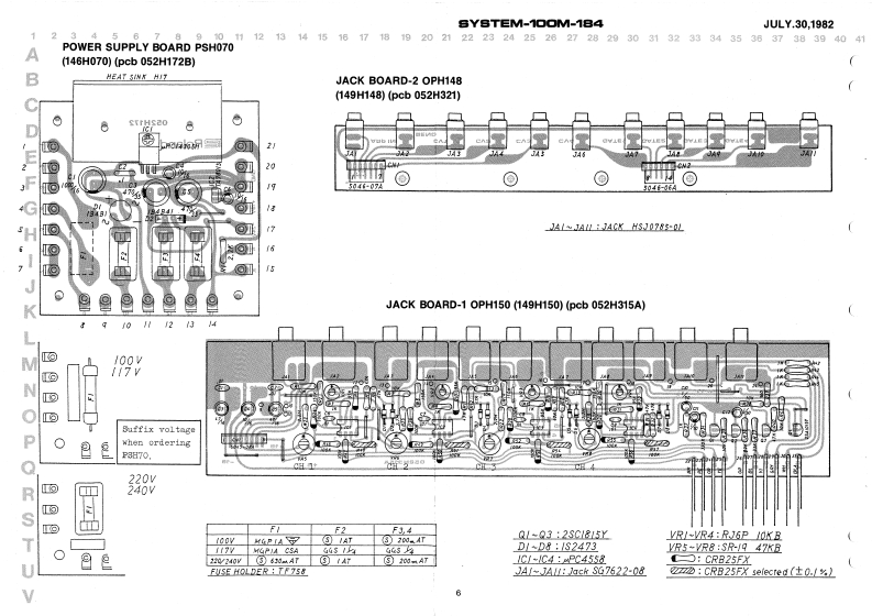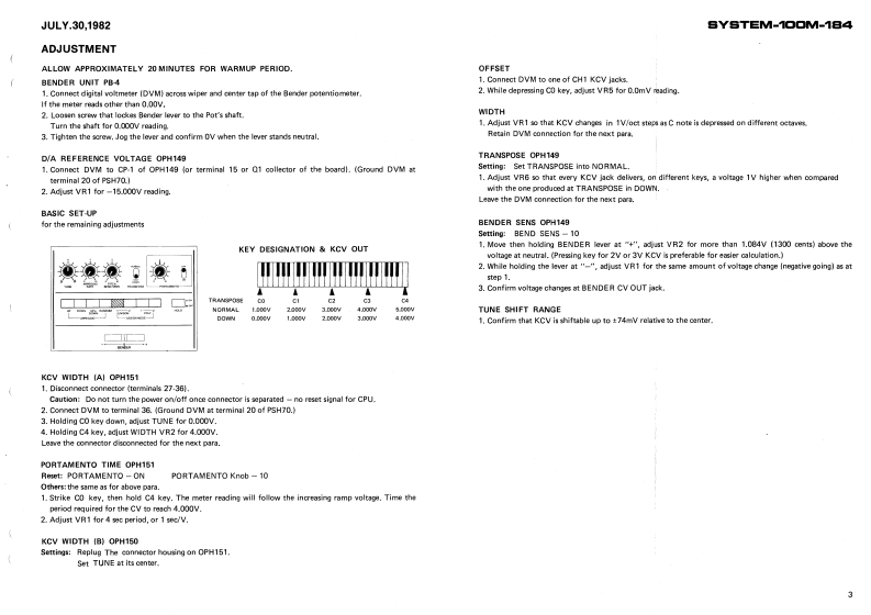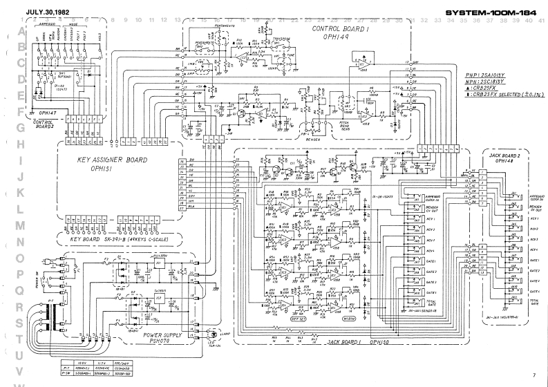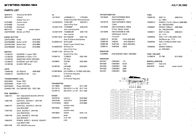 JULY.30,1982BYSTEM-100M-184JACK BOARD-1 OPH150 (149H1500-JACK BOARD-2 OPH148 1149H148)SYSTEM-10OM.184POWER TRANSFORMERSERVICE NOTESSee parts list中First EditionSPECIFICATIONSCHASSIS (061H127)Keyboard...........61 keys,4 octaes (CC)POWER SUPPLY BOARDTunable range........:100 centsP5H070I146H070]Piteh bend8.:,:,±1300nsm政】Portamento time.....0-1 s/oetCONTROL BOARD-1-cvout.............1V/octOPH140[140H149Gate0ut,-,---...+15VBender cV out ......1VArpeggio clock in ....+1V (min.)Dimenslons.---......938(WI x 23511 x 961H)mmPower consumption ..gWWeight...._........B.6 kgCONTROL BOARD-2 OPH147 (149H147)-KEY ASSIGNER BOARD OPH151 1148H151)Pot.EWH73AP20815 100KBTop penel cemovel srews:[132197780Woed screw 3.1 x 10mm round BCPO1.ENH72AF20B161M日4132193461Pot EWH72AP20815 100kB(13219345)HSJ0785-01-05-Pot.EWH72AP20854 50k8一Jck(13491271Control panel romoval413219344)3G.7622*8Knob22470128001(13449106Top panel 1072H066]Joint screw H5(116H005)Powerswitch七batS parts1001H273Top perel removal serews4 x 8mm truss BC072H0eBende2257L4DControl panel removal screwssSwitchKayboerd SK-39184 x 15mm truss BCSUF92A01004H0134131295100SwitchSLE622.18P5Button(131391360-End block22470505C0)072H0900-Button122470513001-ButtonRubber foot G7-Keyboard removal screws2247060900)4 x 45mm truss BCRolandPrinted in Japan A3 1
