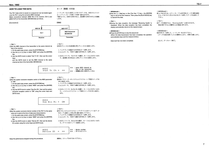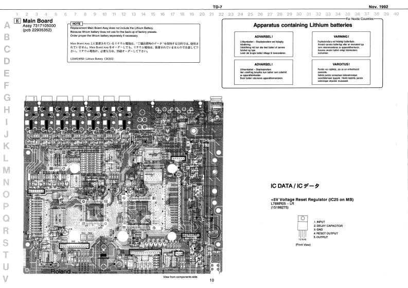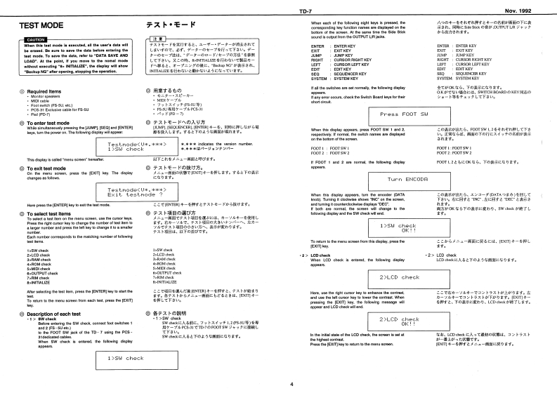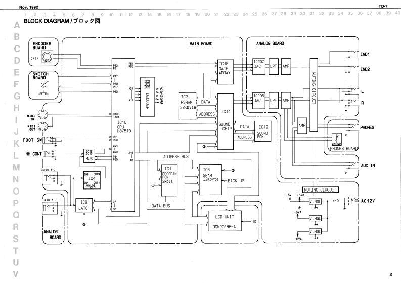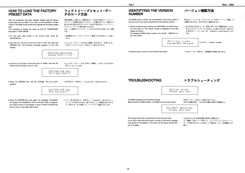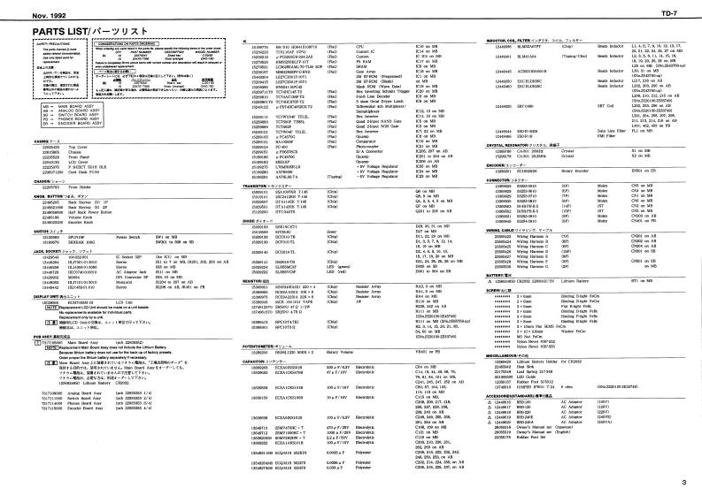 Nov.1992TD-7R88SERVICE NOTESSPECIFICATIONS/仕樣First EditionTABLE OF CONTENTS目次Page热9059SPECIFICATIONS仕镁44444444===-==1EXPLODED VIEW分解☒111n2PARTS LIST一7X卜151144544444444444444443TEST MODE学又卜毛-N94114-5DATA SAVE AND LOAD子一夕0女一号七日一K:8,7无空HOW TO LOAD THE FACTORY77夕下)=·ブ少老g卜PRESET DATAm4a+6罗一夕功口一卡方法”8IDENTIYFING THE VERSION NUMBERバ一乡,少十バ一0难聪方法TROUBLE SHOOTING卜与ブ儿衫=于A5BLOCK DIAGRAMブ口2夕图4CIRCUIT BOARD(MAINY基板☒(MAIN)CIRCUIT DIAGRAM(MAIN)回体(MAIN)11-13CIRCUIT BOARD(ANALOG)基版☒(ANALOG)14CIRCUIT DIAGRAM(ANALOG)▣B☑(ANALOG】15CHANGE INFORMATION变更上案内16.17LED Gide0k在ptPB-ESCT SDIMBLKL2405100122221月月-00122225335Hiers WlvuHaeE时LR5wC3日Cand Haak FC-50814801013MU7301-3010Top Cawir1E0922215532n22422147712001344844134463i3阳542fram】INeP】Roland T▣-7da8yo©©⊙O©©©A年A4ad南LCD CowerHEDOT40-01001045024HL4305-01-322015355001-6-31t145241010224】22225520292@4090013446201342#触2日44维25011340251534404421LCa Uee。西t8内有W733-18104净2131薄Roland17059669Printod in Japan AFHO (DP)1