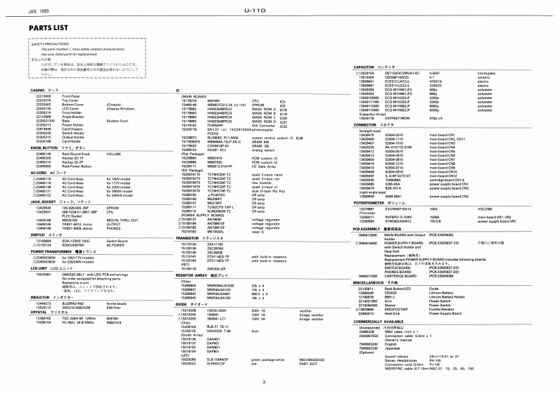 N1980U-110L-11▣SERVICE NOTESFirst EditionSPECIFICATIONS/仕檬AC CORD2Mbyte11IMemary Cartridgel6l2溪yteMDIIN.OUT,THRU220N23495138240mE23512150tOUTPUT240wA24512218e134165ipedancs 100DMisOut-Ld-之5dmIpeodance 1K65660666hu国Otipeodance 1K21W已Tn01里14444444·46W幻关58D的g45HMFubber FeotBottom Cover1g141g°1-32235031300×4pc52202540228813449146·45Kg9015ee.MDI Cable 11m)Ownar's ManualE4UhG94585s2600Presal TenaPalch S出ng ChartOperetion Map/ChartROM Ploy MasualGuide took for MIDOptions·Seund Library5NU1100to0四Cennec1 on Cend小1MTABLE OF CONTENTS目次PageSPECIRCATIONS仕1-LED SLB-15MW3F Igreen15029266EXPLODED VIEW分解国ButtorLED GuidePARTS LIST-y少天卜27135511IC DATA0子=夕-LED SLR55VC3F (red)415029266Card HolderBLOCK DIAGRAM▣2夕国2200188CIRCUIT DESCRIPTIONS工路解思Kinrtep ID]1PKaytop(S]2PCard Chassis224952022421622415649TEST P阳DGRAM于又卜05?7Fblend U-●CHANGE INFORMATION度更率内11白0MAIN BOARD千之求=下POWER SUPPLY.PHONES,SWITCH BOARD7一梦丁?求一卡14TROUBLESHOOTING卜与ブ儿兰-于1之为-LCD Cover1643131Power ButtonLUnDM033Z5L72240555008150294812214321930114491LKnob (blkl2241492215040430PeL EVUNBAP15A14 10KA13270▣1Rolandrinted in Jap网n6A-2GR0