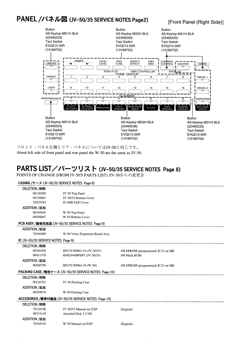 May.1994W-50V-s▣SERVICE NOTESFirst EditionW50仗、JV-50任伊同一)部品C構成ě九℃v主寸。已の-之又ノ一卜住、JV-50上)相递点仁21℃記截Lv丰寸℃、JV-50/35计一比入ノ一卜(17059727)上併世℃使用L℃下各u。The W-50 consists of components nearly identical to those used for the JV-50.This service note describes the difference between the W-50 and the JV-50,and should be used in conjunction with theservice note(17059727)for the JV-50/35.SPECIFICATIONS/仕樣Keyboard........:61Keys(with velocity)●Dimensions·:1011W0×289(D)×92(H)mmONumbers of parts.......:16(Two parts can be set in the drum39-13/16(W0X11-7/16(D)×3-5/8(H)inchpart)Weight................:6.6 kg/14 lbs 9 ozMaximum Polyphony......:28+28(Voices)Power consumption 1200 mAEffects..................:Reverb,Chorus●Accessories·····:AC Adapto:ACK-120(117V012449631)OInternal Memory..........:TonePreset:226ACB-220(2300(12449548User:256ACB-240(E)(240V0(12449564)Organ TonePreset:16ACB-240(A)(240V0(12449549)User:16W-50 Manual set EXP70344745)Drum setsPreset:9Audio Cable (PJ-1M)X1 (23430675S0)User:Optional Items........:Volume PedalFV-50L/300L (BOSS)Performance:8Pedal SwitchDP-2/6,FS-5U (BOSS)●Display16 characters,2 lineKeyboard Stand:KS-8Connectors..............:Audio output jack x 2 (L,R)Stereo Headphone RH-20/80/120Headphone jackMIDI/SYNC Cable MSC-07/15/25/50/100Hold pedal jackMonitor AmpMA-12 (BOSS)MIDI connectors:IN,OUT1,OUT2SMF Player section○Number of tracks........:Format 0:1(16 channels)Format 1:17(16 channels per track)OTime base(when recording):96,120,192,240OData format.............:Playback:Standard MIDI File (format o or 1)Recording:Standard MIDI File (format 0)○Tempo:5-260OTime signature (when recording):4/4ODisk drive................:3.5 inch,2DD micro floppy disks onlyTop panel(00349645)一一。四gRoland/RODGERS17059751Printed in Japan A0HO(DP)