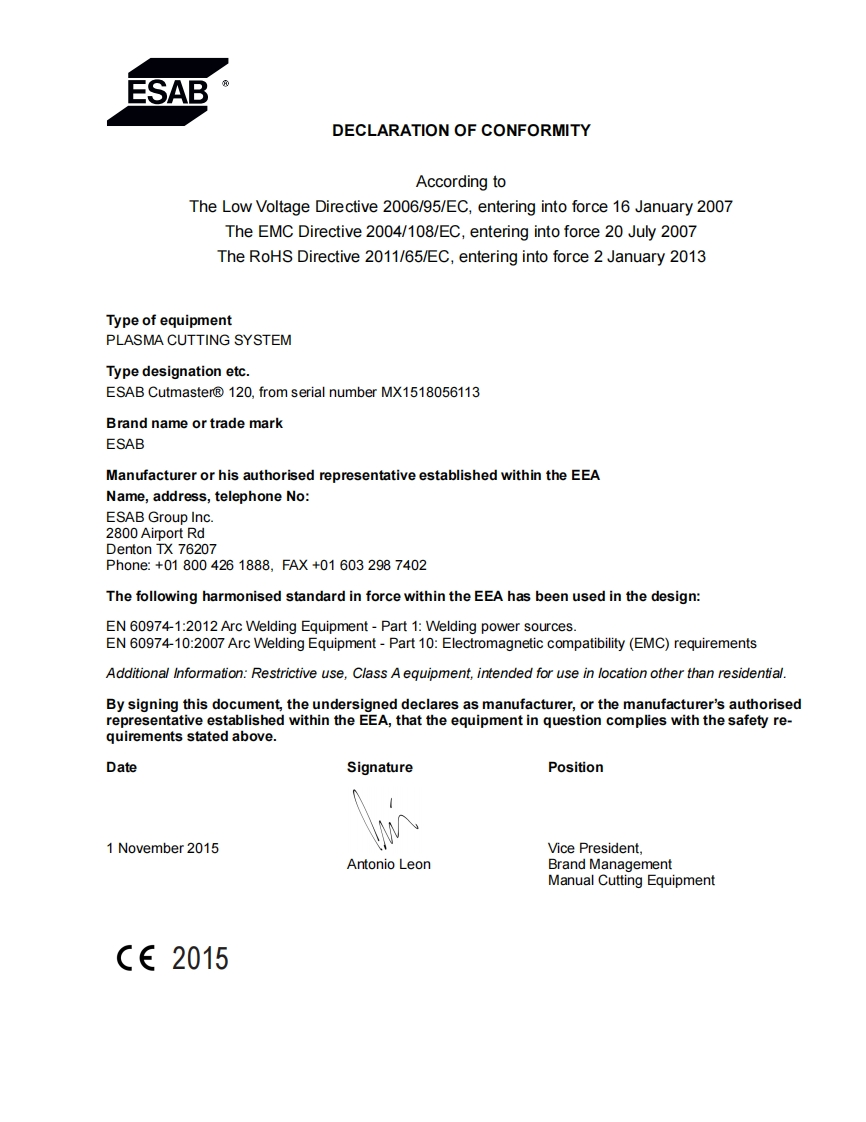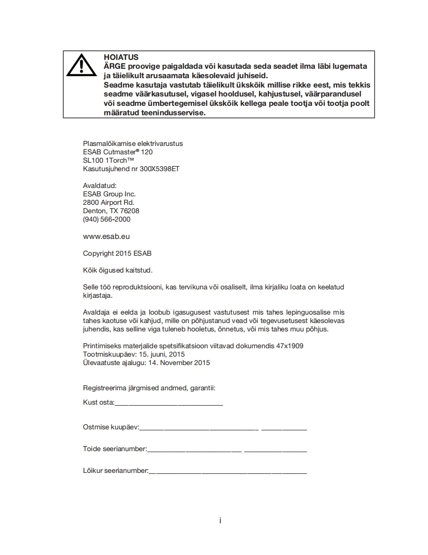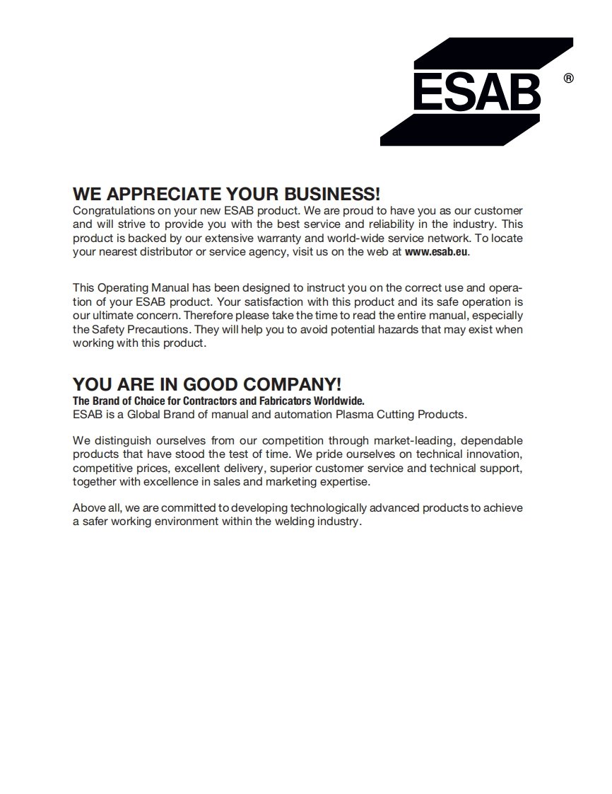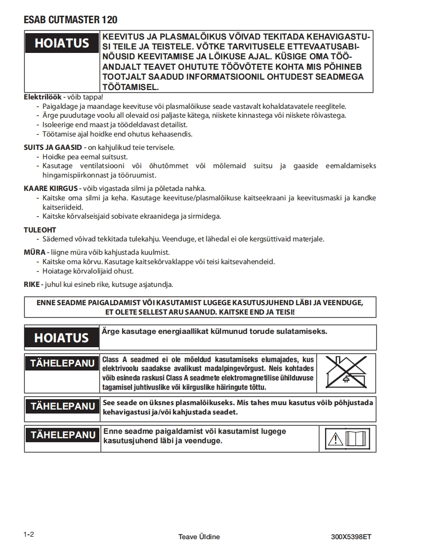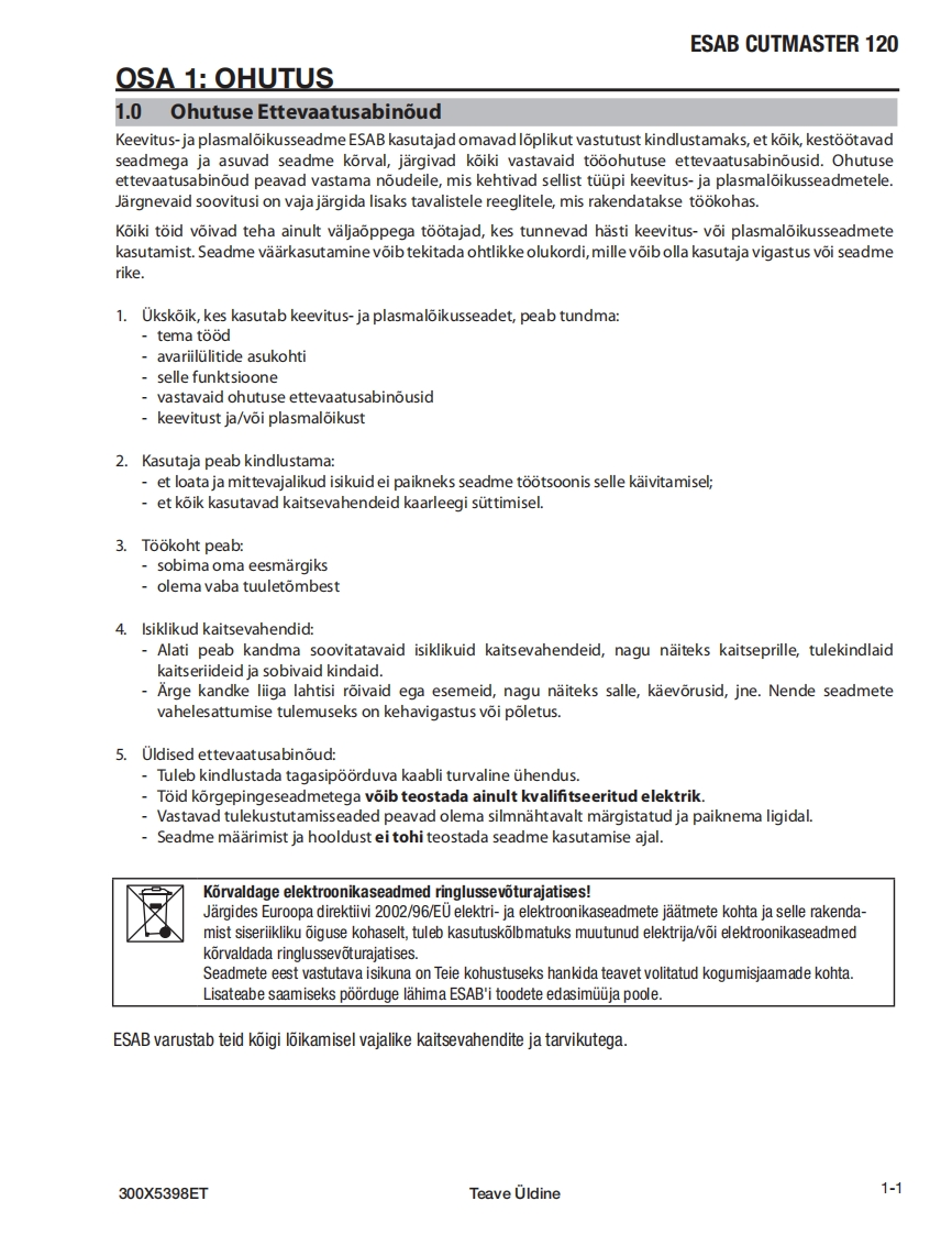 ESAB-Cutmaster120kasutusjuhend操作手册含电器原理图找手册网24天前发布关注私信11.64MB76页044ESAB-Cutmaster120kasutusjuhend操作手册含电器原理图此内容为付费资源,请付费后查看¥19¥21黄金会员免费钻石会员免费登录购买付费资源 第1页 / 共76页 第2页 / 共76页 第3页 / 共76页 第4页 / 共76页 第5页 / 共76页 第6页 / 共76页 第7页 / 共76页 第8页 / 共76页 第9页 / 共76页 第10页 / 共76页 试读已结束,还剩66页,您可下载完整版后进行离线阅读 THE ENDESAB焊机/林肯焊机 文本预览 ESABESAB Cutmaster⑧120PLASMALOIKAMISE SUSTEEMSL100 1TorchTMKasutusjuhendA4A-12776EDC1203FAAS400NAMPRIT((esab.euAjalugu:ADTootmiskuupaev:14.November 2015Osa number:300X5398ET 查看更多 收起部分 喜欢就支持一下吧收藏